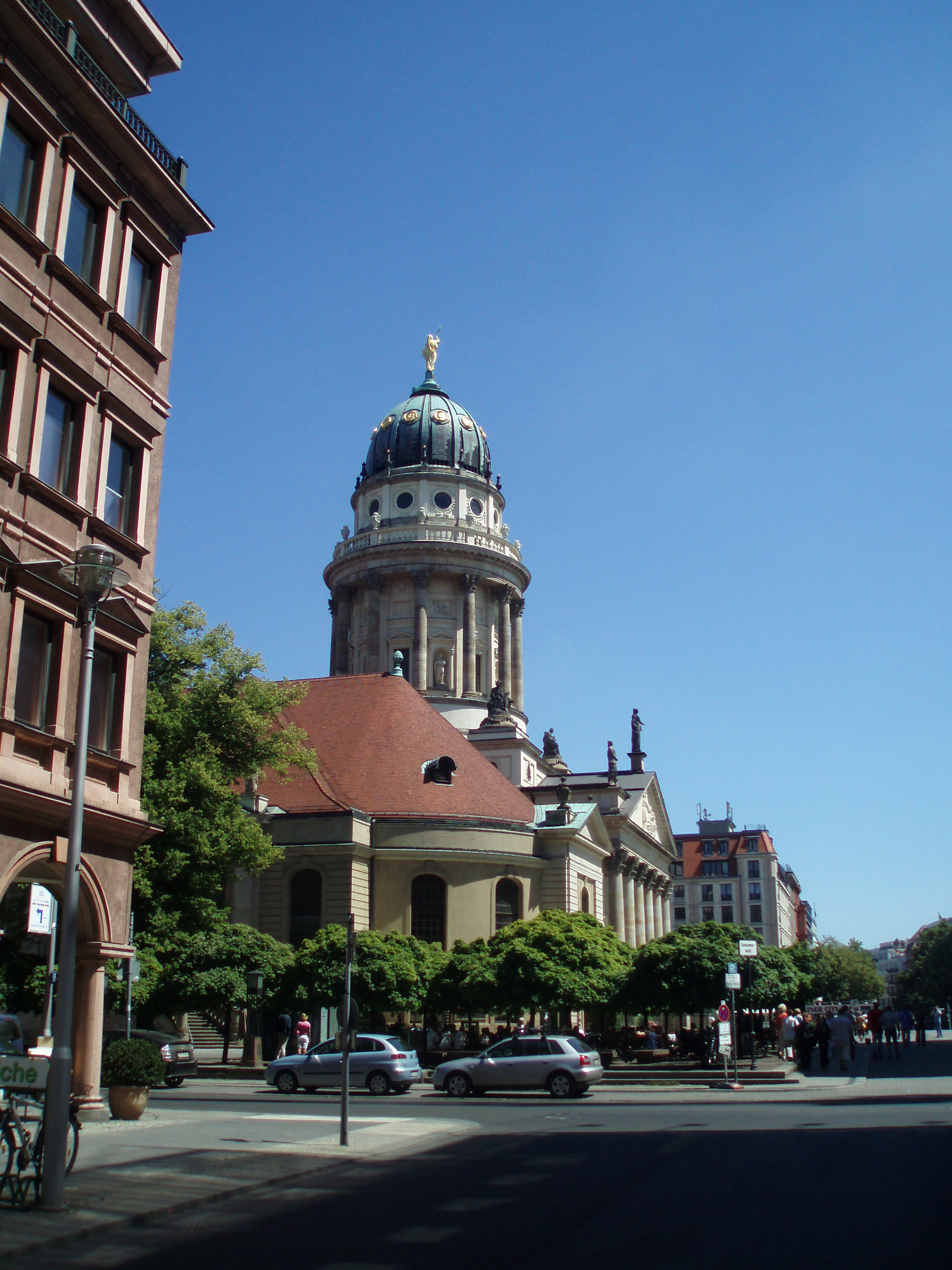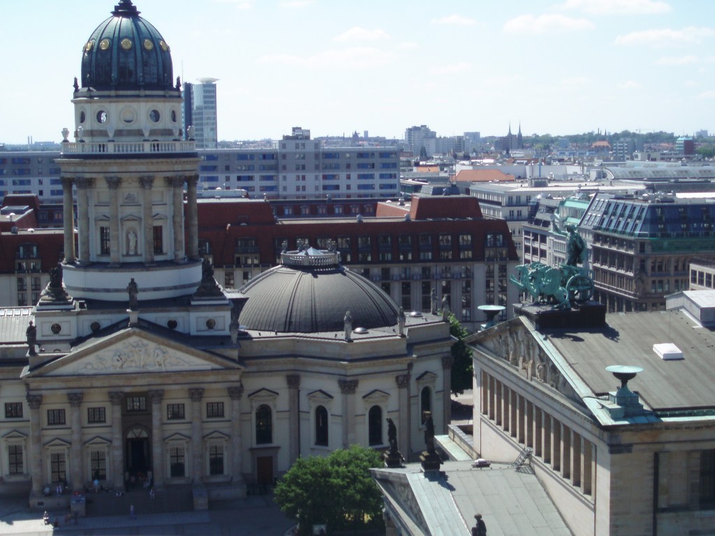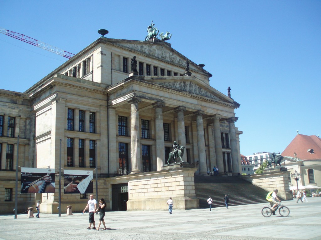 Sunday morning we got up a little late and headed out to Gendarmenmakt. It’s a plaza – some say one of the most beautiful in Europe – with the Konzerthaus in the middle of twin German and French cathedrals. The French cathedral, Franzosischer Dom, allows visitors into the dome for a small fee. Once at the top you can see all of Berlin. It was the perfect day for such a trek – blue skies, clear view. We had a little time to kill before the box office opened at the Konzerthaus so we walked down Friedrichstrasse to Checkpoint Charlie. An incredibly important historical marker of post-war Germany and the Cold War era, it has been exploited as a tourist attraction. Zach and I were greatly disappointed when we arrived and saw tourists taking pictures with men dressed as US soldiers and holding the American flag. It was a mecca for run-of-the-mill tourists; we didn’t stay more than a few minutes. However, along with the messy touristy site it has become, there was a wall filled with photos and the chronological events that led up to Checkpoint Charlie and the US/Soviet stand-off, as well as the reunification of Berlin. Then we walked back over to the Konzerthaus and bought discounted tickets for the afternoon performance of the Konzerthausorchester!