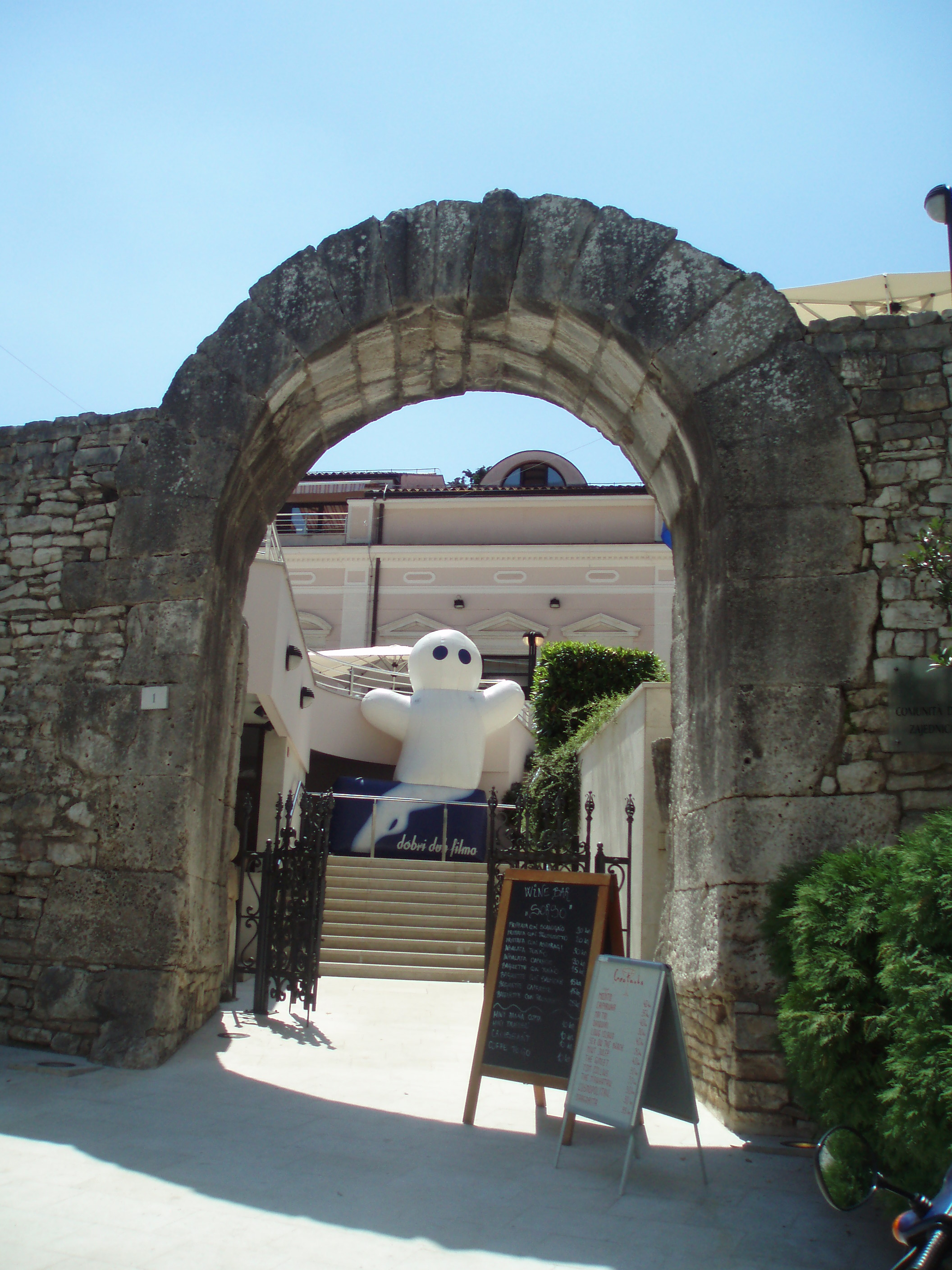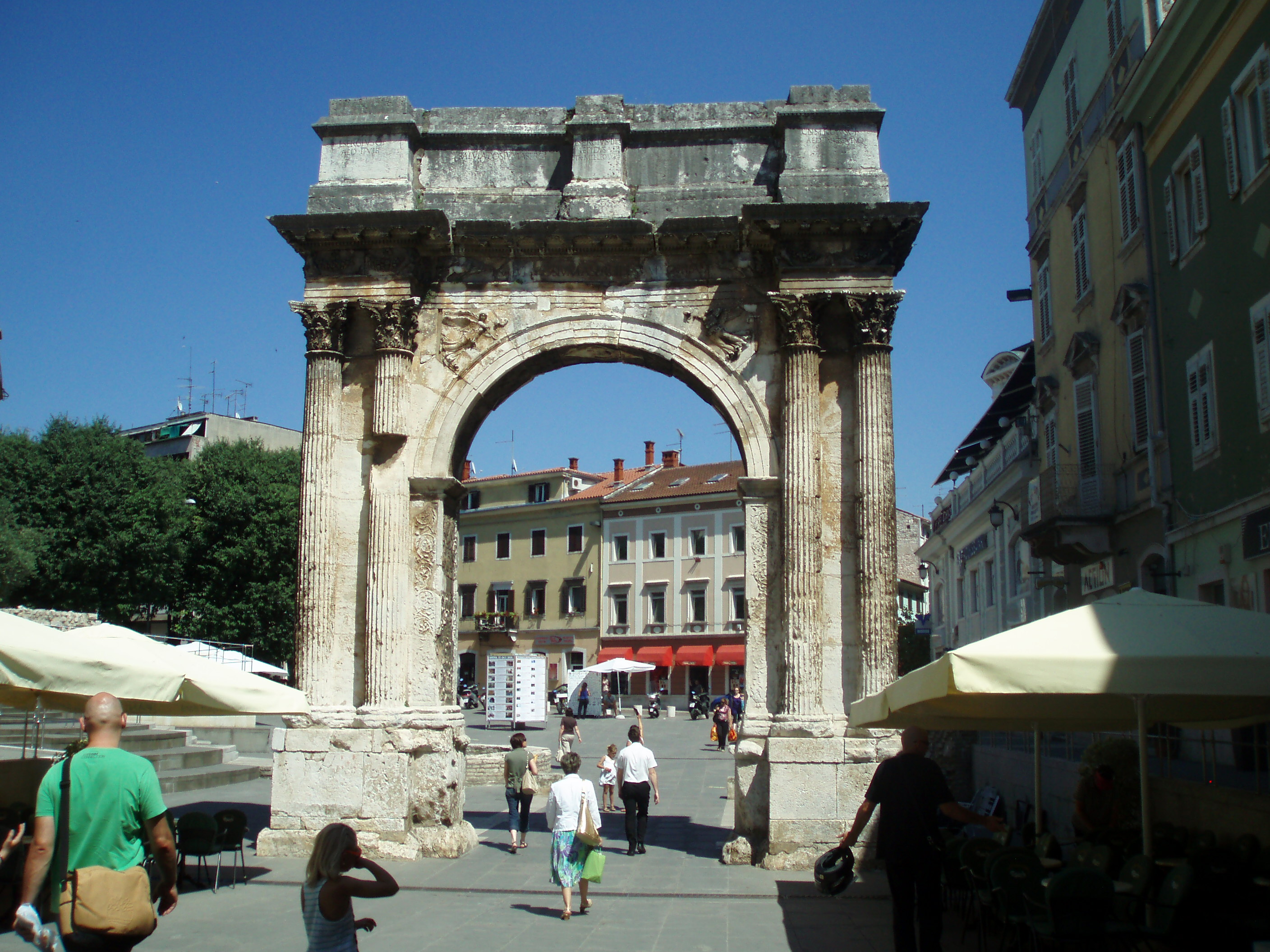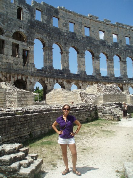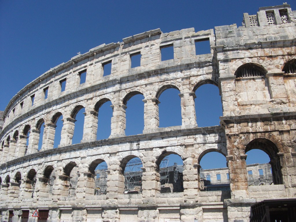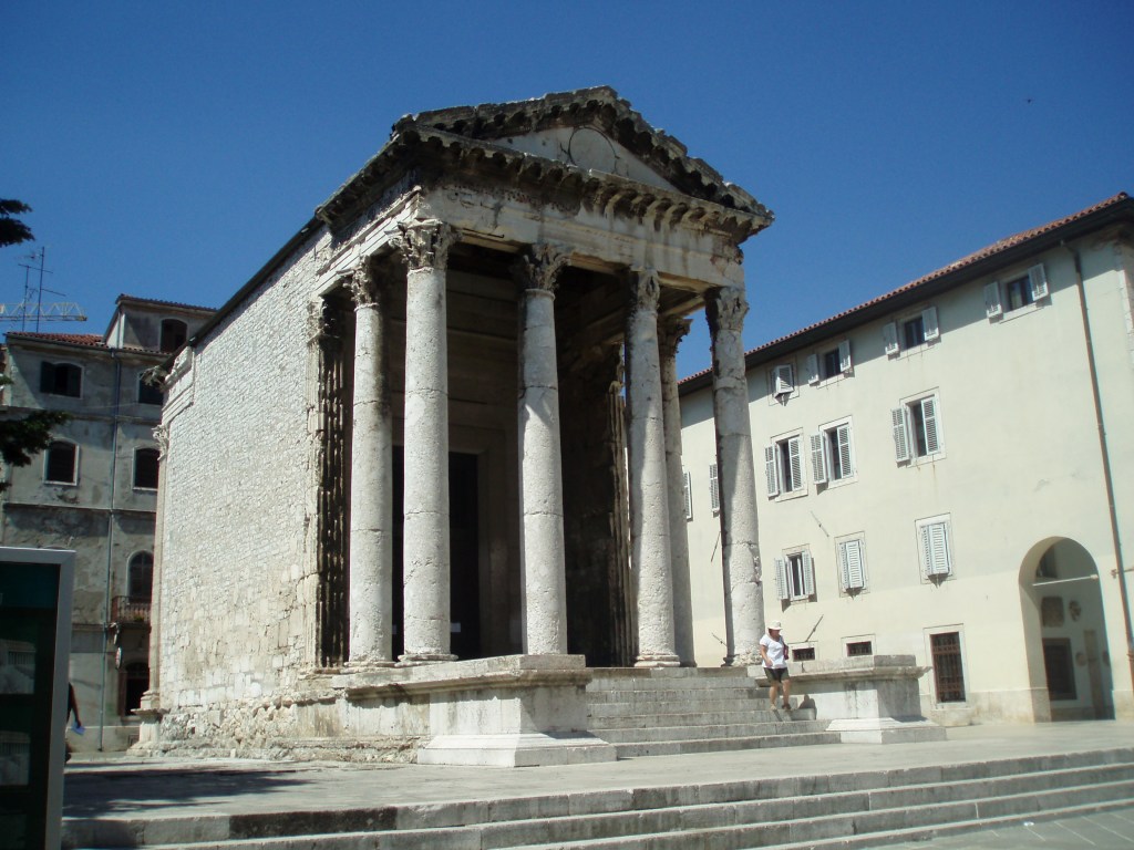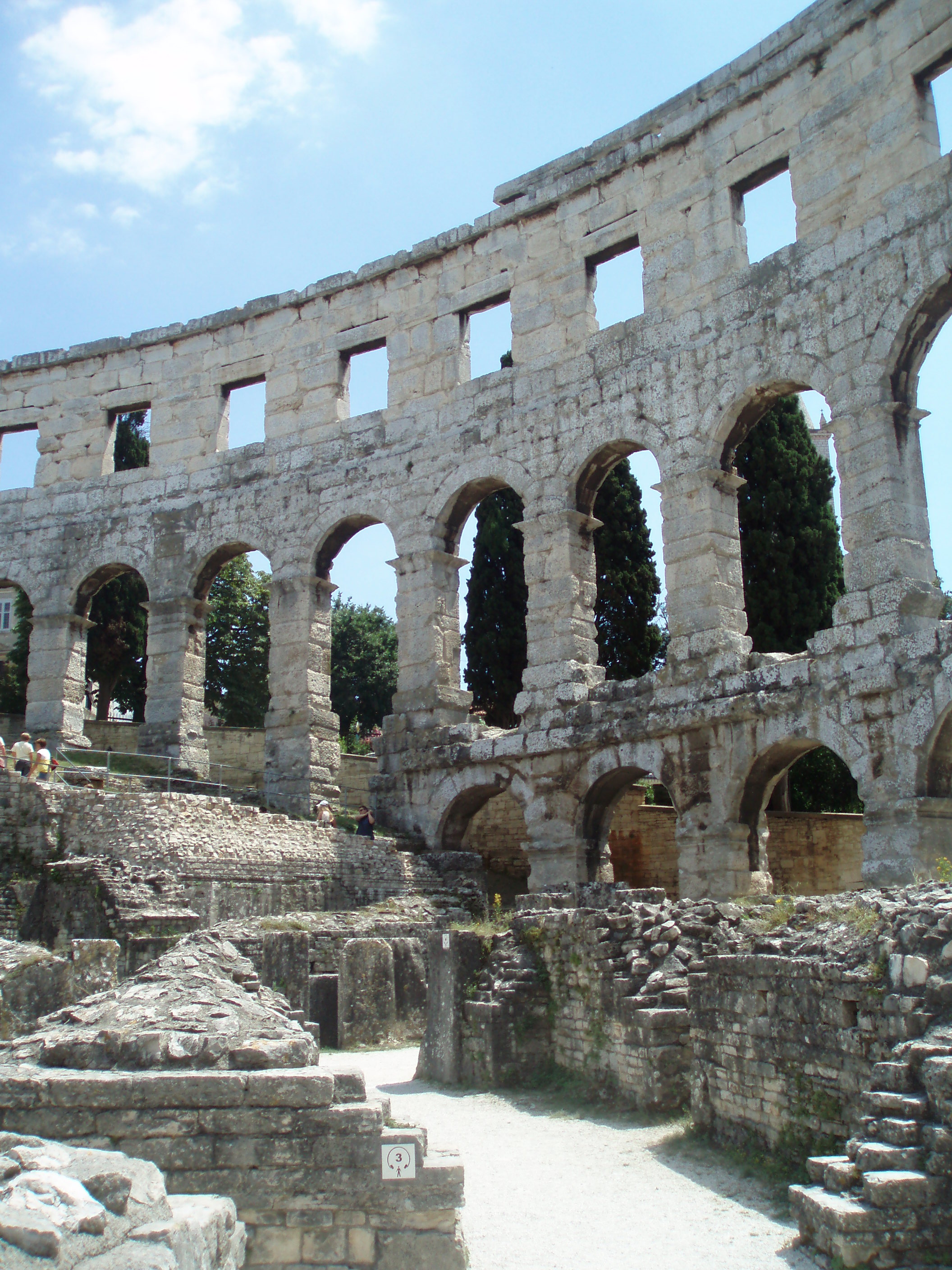 Yesterday we took a day trip to Pula and Rovinj (pronounced Roveen). It was about a two hour ride to Pula which is the southern-most city in Istria and one of great historical importance. Pula’s location at the end of the Istrian peninsula made it geographically important to the Roman empire for the import and export of goods. It has since remained an important memorial to Roman times as there are quite a few ruins still preserved. Once we arrived we bought a map to orient ourselves and then headed in the direction of the Roman amphitheater. The arena in Pula is the 6th largest Roman amphitheater in the world and is still used as a venue for concerts and plays. But in Roman times this arena was in fact used for gladiator battles, among less interesting acts. A lot has changed over the years – there are plastic chairs on the arena floor for audiences and a large stage was set up with lights and speakers – but it was still easy to visualize an arena packed with Romans shouting and cheering for the favored gladiatorial outcome. We had the opportunity to go under a section of the arena floor for an exhibit; it was an area where previously the gladiators, animals, or wounded/killed gladiators would have been held – which area it had been was not made clear. After we left the arena we walked about Pula’s centre to find some of the other notable Roman ruins. We saw Hercules’s Gate – he was the patron god of ancient Pula – which has been damaged and rebuilt numerous times throughout history. It was one of the gates through which one could gain access through the old Roman walls of Pula. We also saw the Golden Gate, a triumphal arch, which once stood with the city gate and walls, but is now the only remainder. Pula has also retained the forum which was the political, religious, and commercial center of ancient Pula. In the forum (or square) stands the Temple of Augustus. It is the only fully preserved temple in the forum today.
