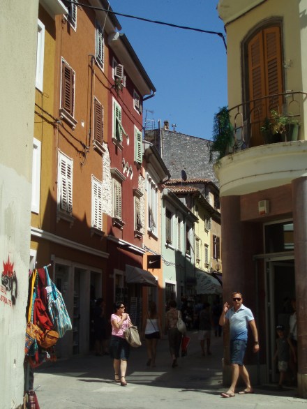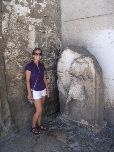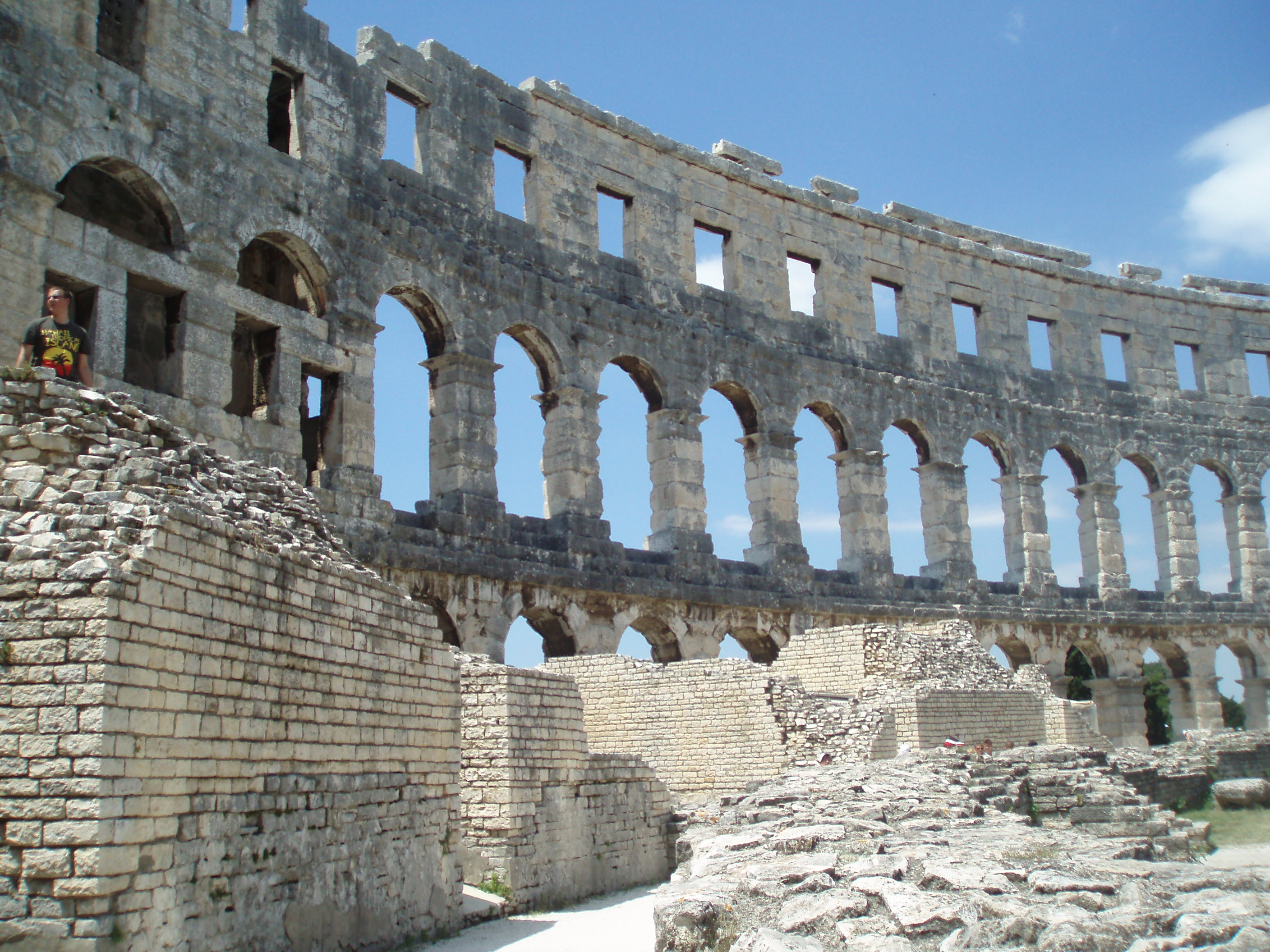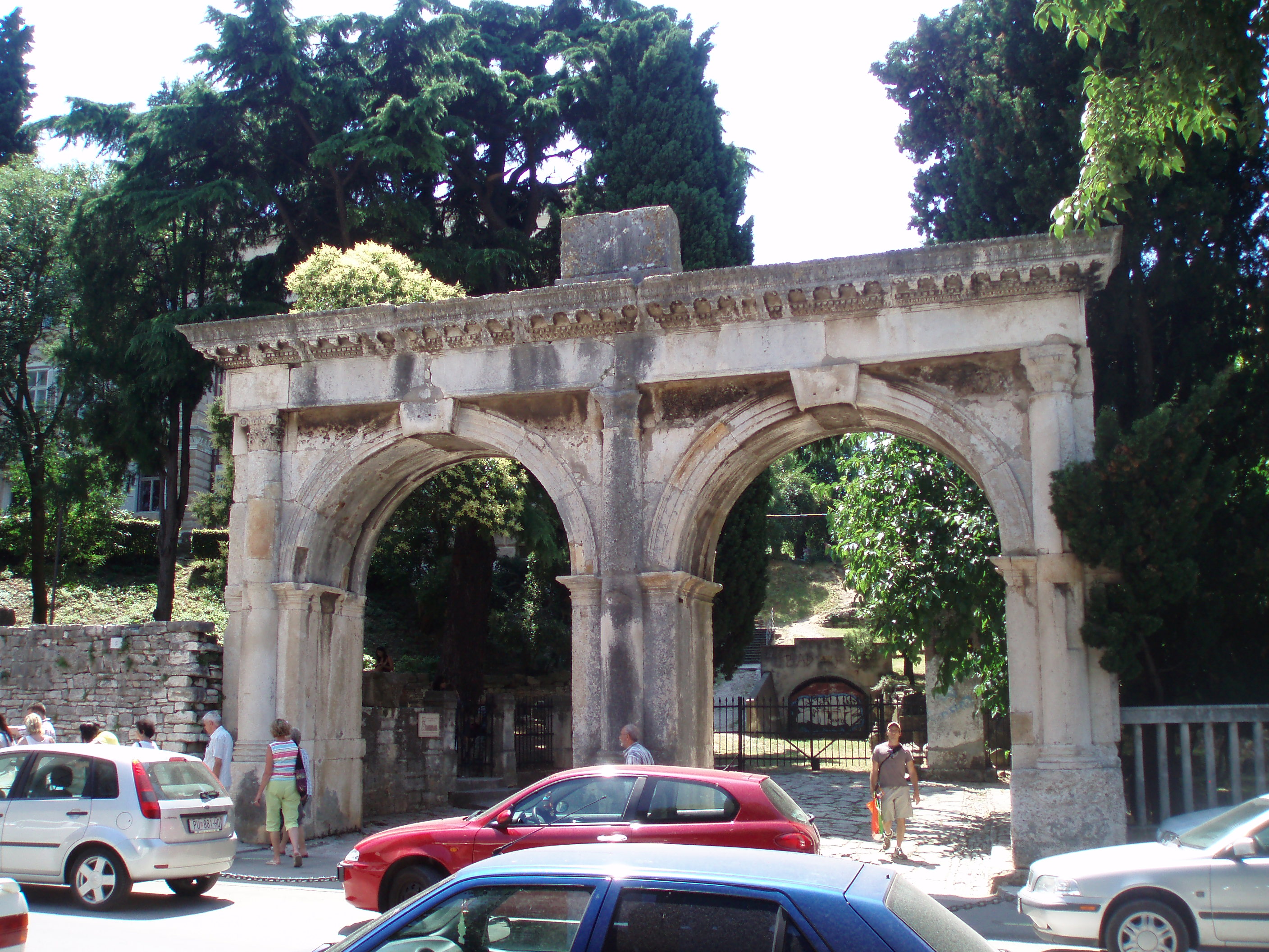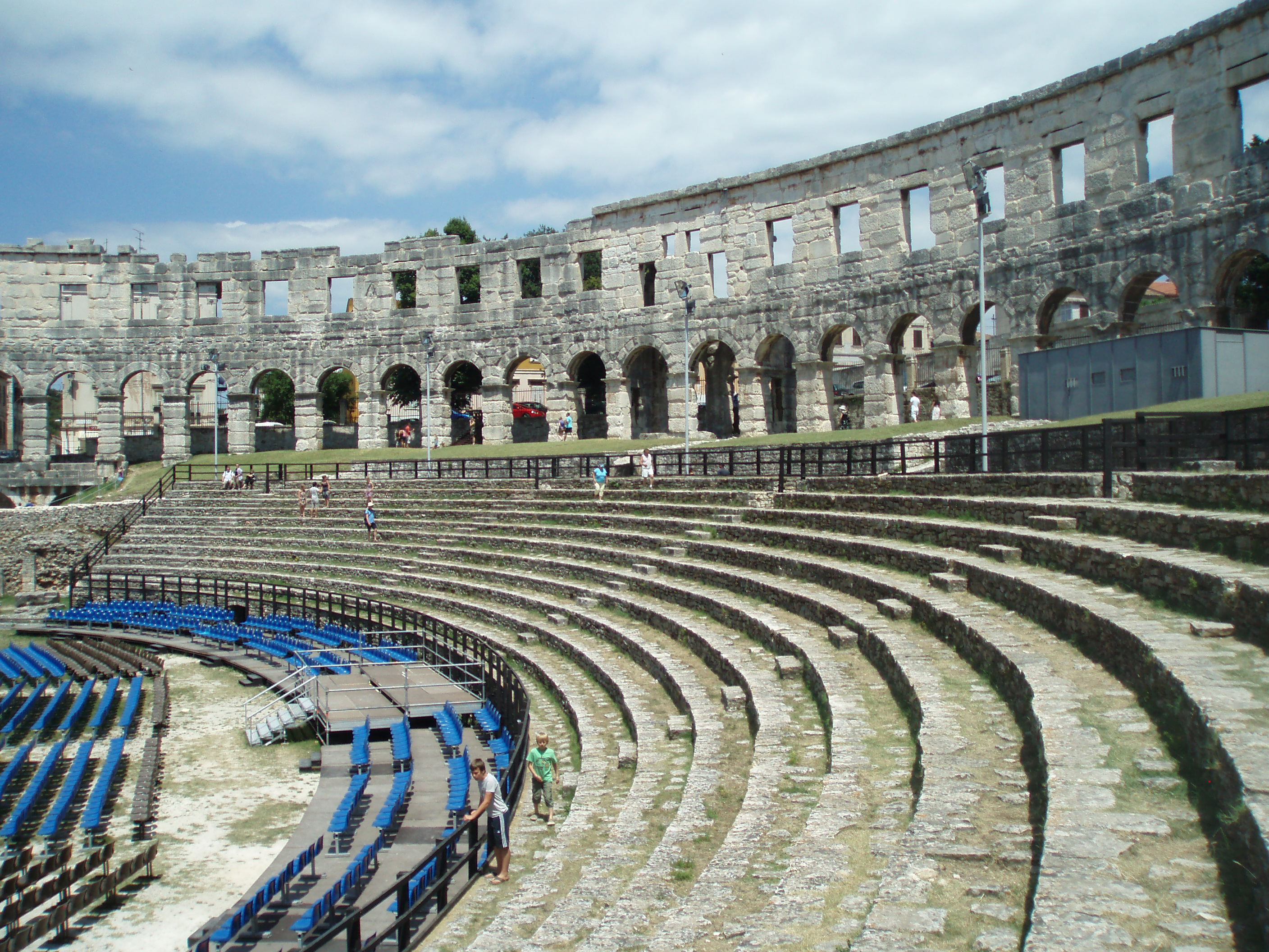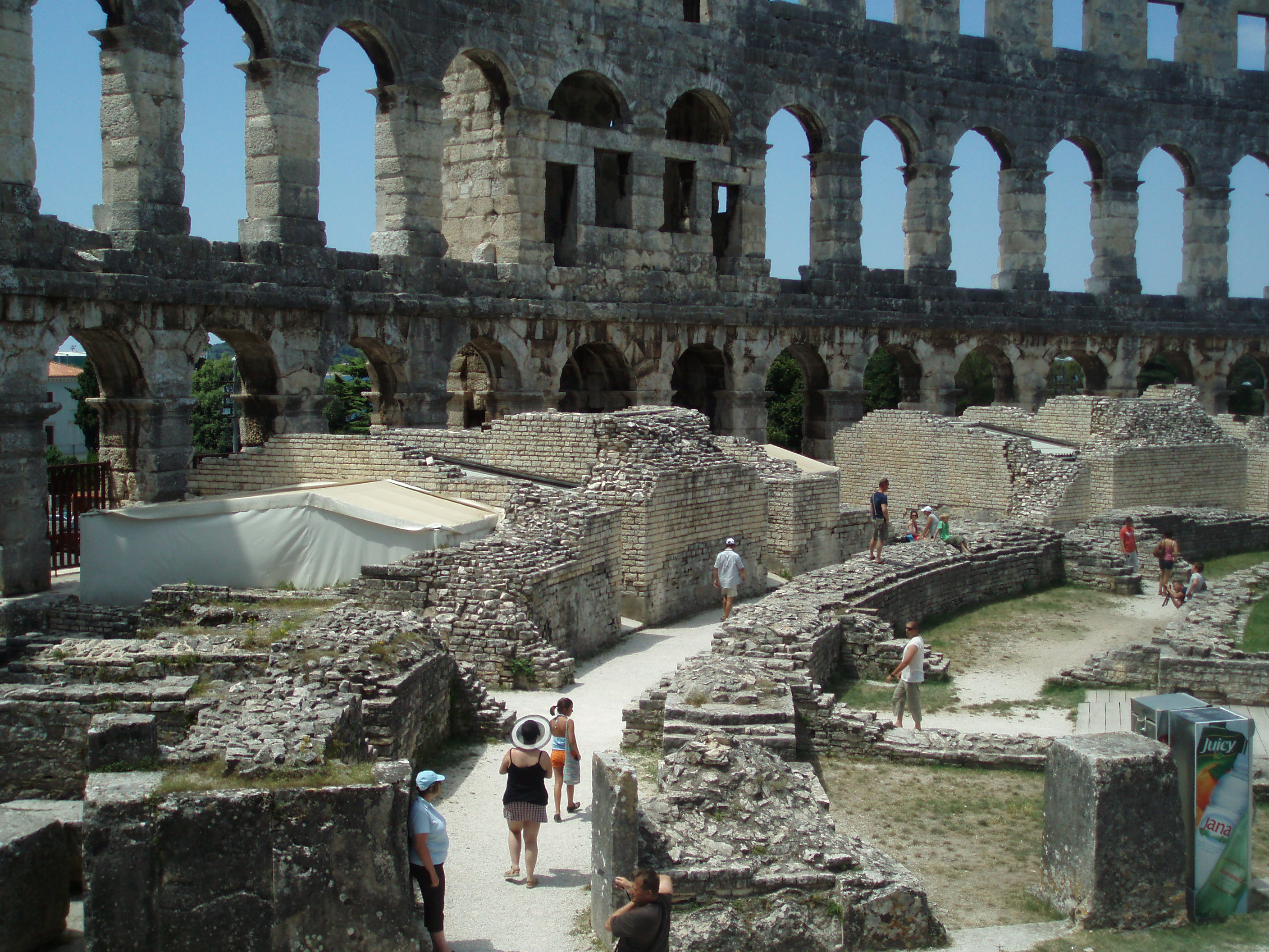 Yesterday we took a day trip to Pula and Rovinj (pronounced Roveen). It was about a two hour ride to Pula which is the southern-most city in Istria and one of great historical importance. Pula’s location at the end of the Istrian peninsula made it geographically important to the Roman empire for the import and export of goods. It has since remained an important memorial to Roman times as there are quite a few ruins still preserved. Once we arrived we bought a map to orient ourselves and then headed in the direction of the Roman amphitheater. The arena in Pula is the 6th largest Roman amphitheater in the world and is still used as a venue for concerts and plays. But in Roman times this arena was in fact used for gladiator battles, among less interesting acts. A lot has changed over the years – there are plastic chairs on the arena floor for audiences and a large stage was set up with lights and speakers – but it was still easy to visualize an arena packed with Romans shouting and cheering for the favored gladiatorial outcome. We had the opportunity to go under a section of the arena floor for an exhibit; it was an area where previously the gladiators, animals, or wounded/killed gladiators would have been held – which area it had been was not made clear. After we left the arena we walked about Pula’s centre to find some of the other notable Roman ruins. We saw Hercules’s Gate – he was the patron god of ancient Pula – which has been damaged and rebuilt numerous times throughout history. It was one of the gates through which one could gain access through the old Roman walls of Pula. We also saw the Golden Gate, a triumphal arch, which once stood with the city gate and walls, but is now the only remainder. Pula has also retained the forum which was the political, religious, and commercial center of ancient Pula. In the forum (or square) stands the Temple of Augustus. It is the only fully preserved temple in the forum today.
