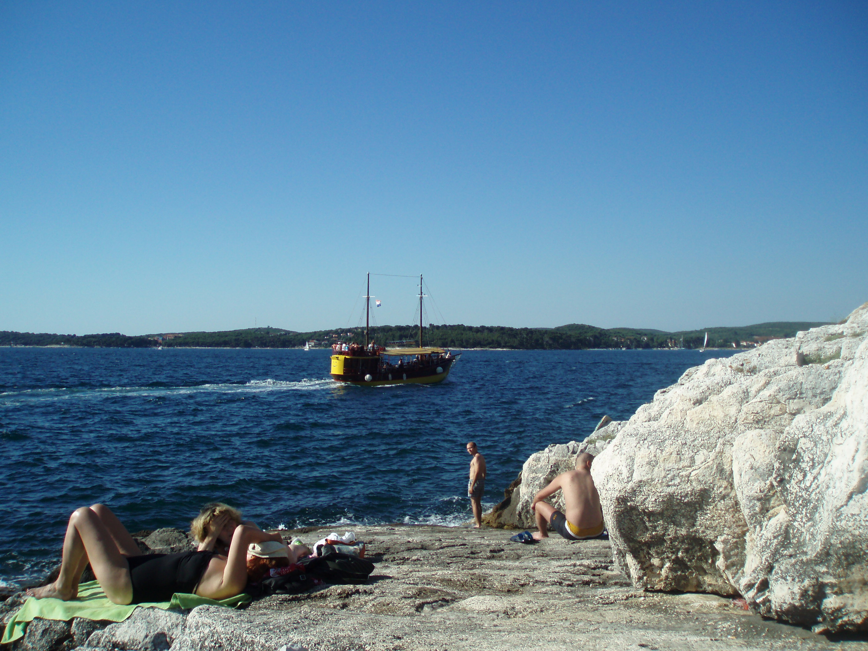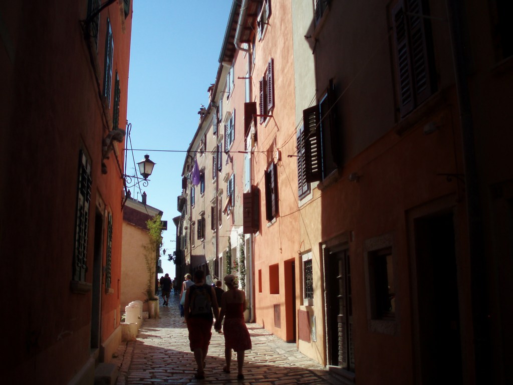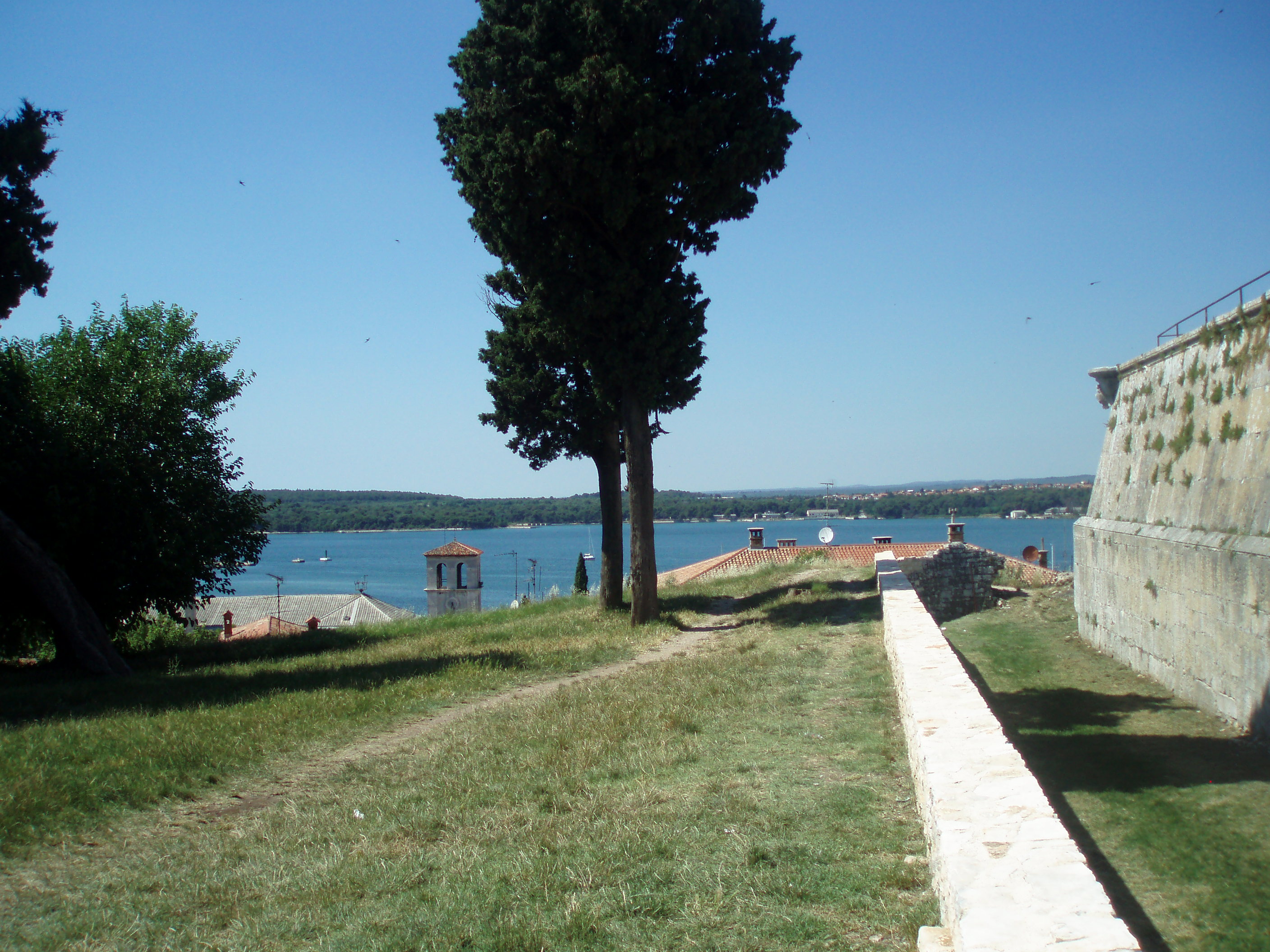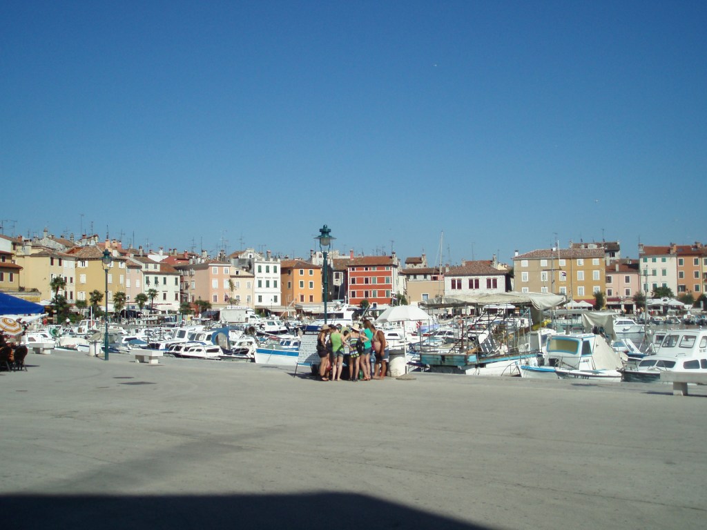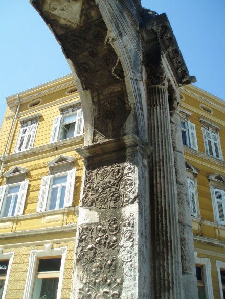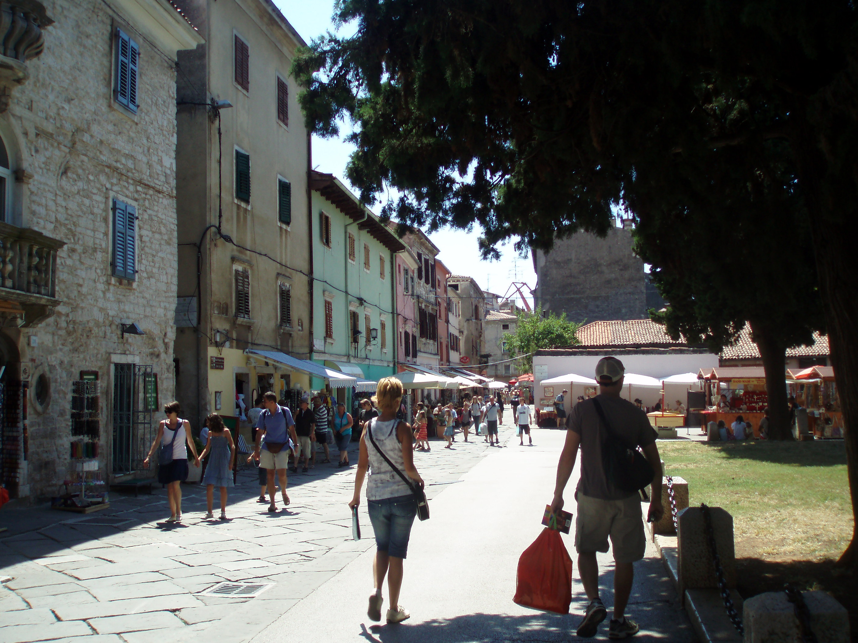 Yesterday we took a day trip to Pula and Rovinj (pronounced Roveen). It was about a two hour ride to Pula which is the southern-most city in Istria and one of great historical importance. Pula’s location at the end of the Istrian peninsula made it geographically important to the Roman empire for the import and export of goods. It has since remained an important memorial to Roman times as there are quite a few ruins still preserved. Once we arrived we bought a map to orient ourselves and then headed in the direction of the Roman amphitheater. The arena in Pula is the 6th largest Roman amphitheater in the world and is still used as a venue for concerts and plays. But in Roman times this arena was in fact used for gladiator battles, among less interesting acts. A lot has changed over the years – there are plastic chairs on the arena floor for audiences and a large stage was set up with lights and speakers – but it was still easy to visualize an arena packed with Romans shouting and cheering for the favored gladiatorial outcome. We had the opportunity to go under a section of the arena floor for an exhibit; it was an area where previously the gladiators, animals, or wounded/killed gladiators would have been held – which area it had been was not made clear. After we left the arena we walked about Pula’s centre to find some of the other notable Roman ruins. We saw Hercules’s Gate – he was the patron god of ancient Pula – which has been damaged and rebuilt numerous times throughout history. It was one of the gates through which one could gain access through the old Roman walls of Pula. We also saw the Golden Gate, a triumphal arch, which once stood with the city gate and walls, but is now the only remainder. Pula has also retained the forum which was the political, religious, and commercial center of ancient Pula. In the forum (or square) stands the Temple of Augustus. It is the only fully preserved temple in the forum today.