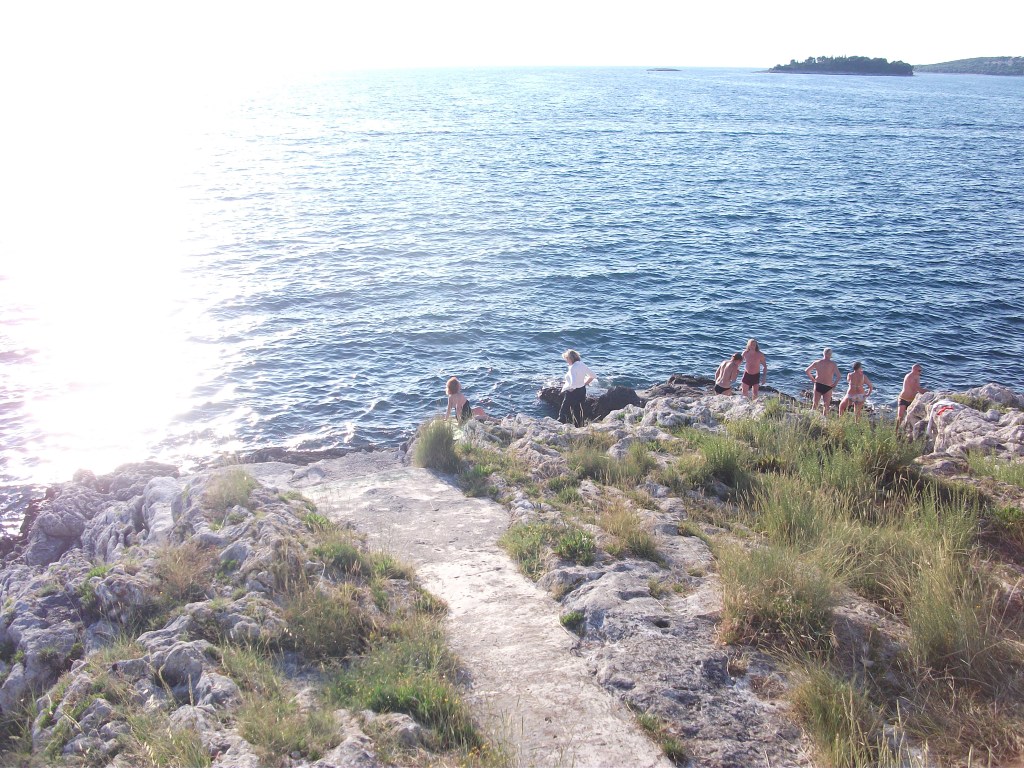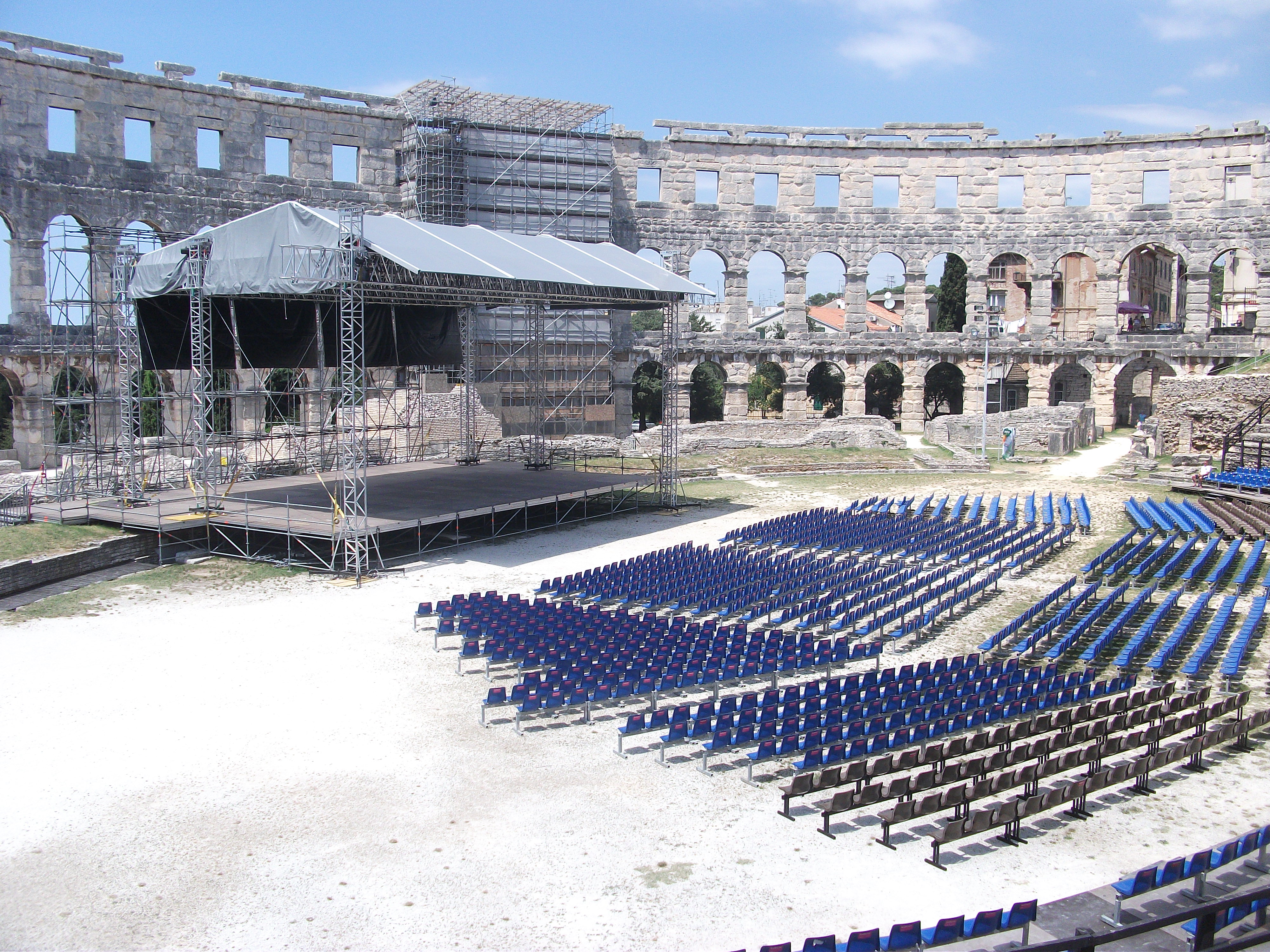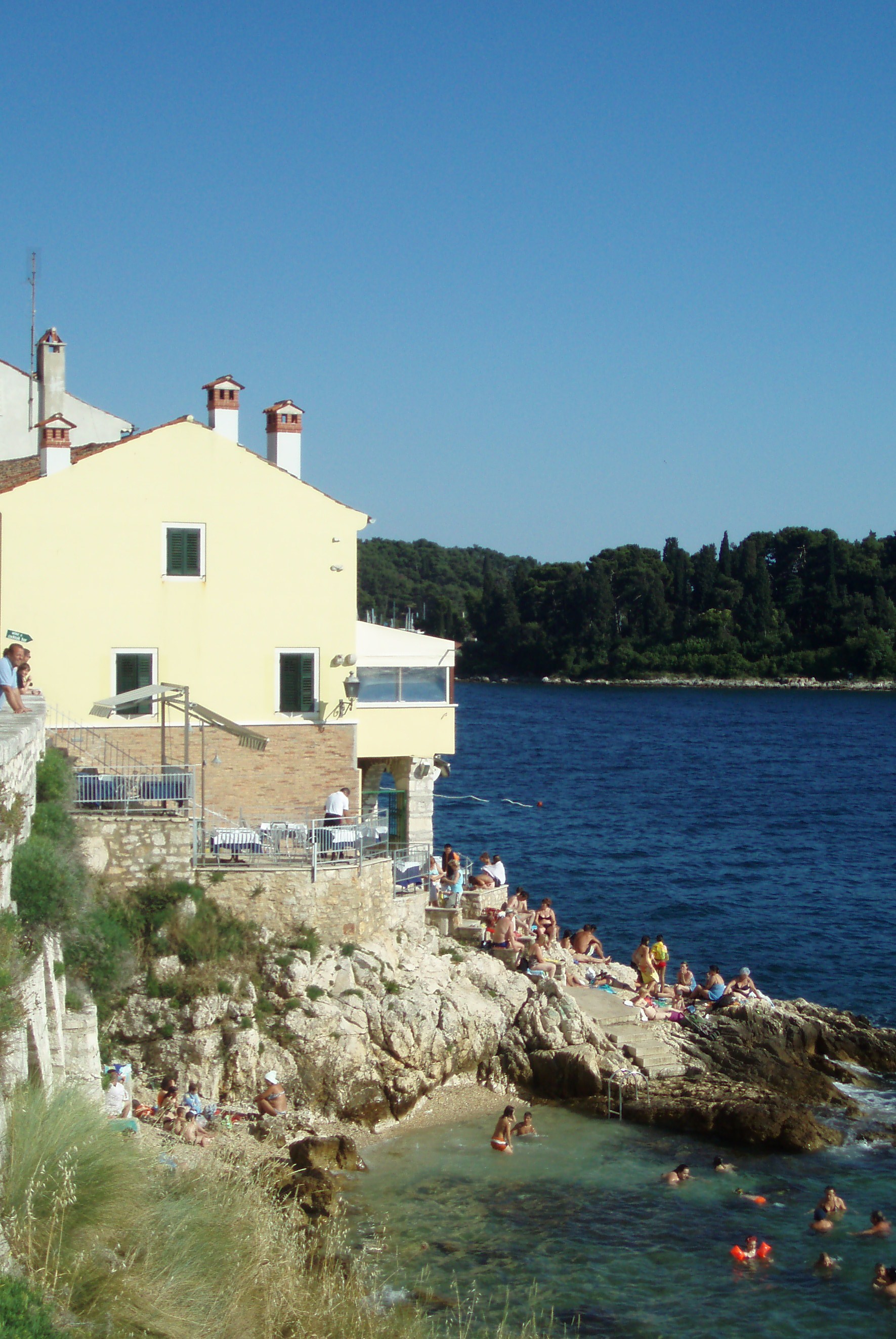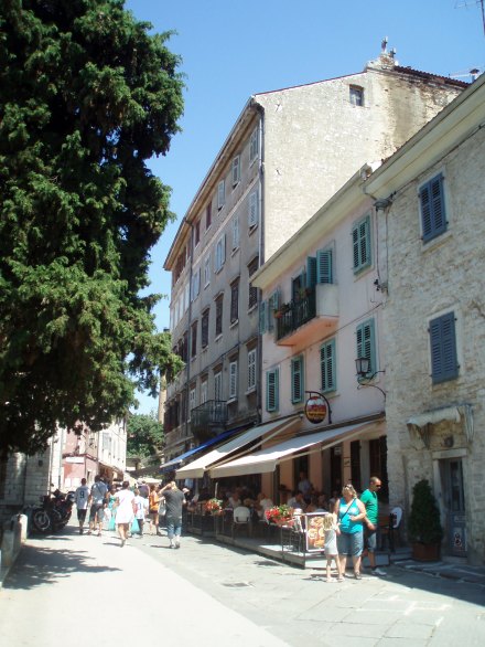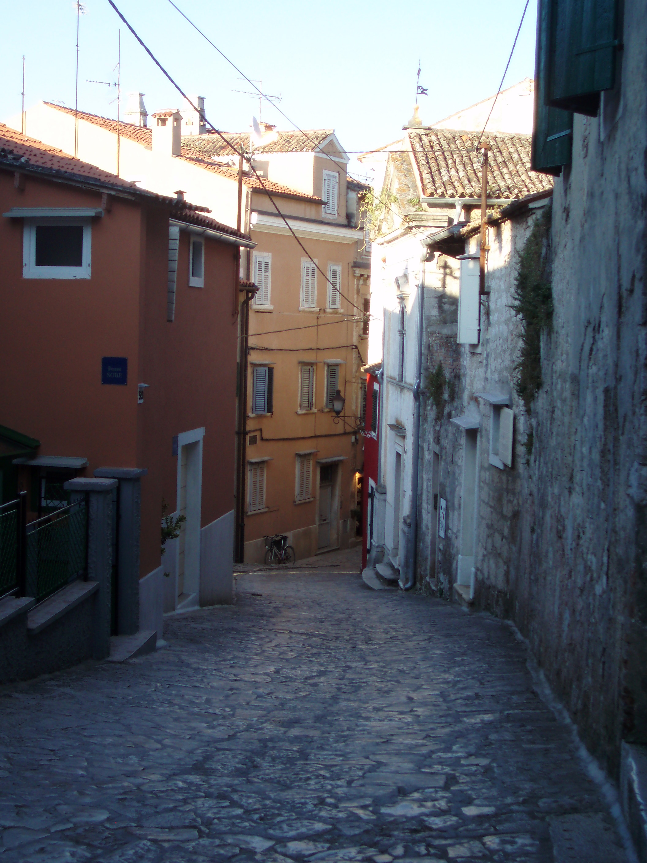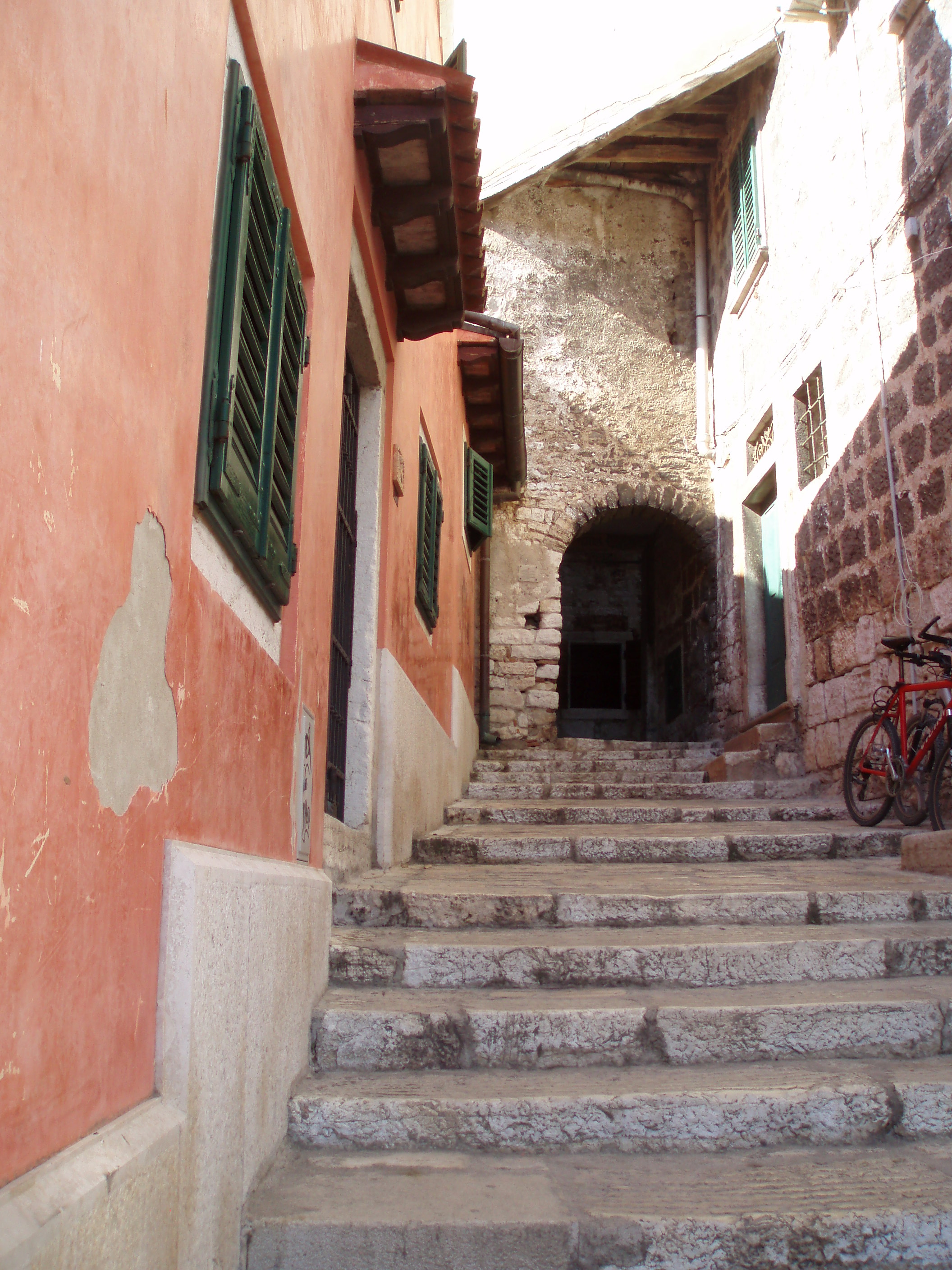 Yesterday we took a day trip to Pula and Rovinj (pronounced Roveen). It was about a two hour ride to Pula which is the southern-most city in Istria and one of great historical importance. Pula’s location at the end of the Istrian peninsula made it geographically important to the Roman empire for the import and export of goods. It has since remained an important memorial to Roman times as there are quite a few ruins still preserved. Once we arrived we bought a map to orient ourselves and then headed in the direction of the Roman amphitheater. The arena in Pula is the 6th largest Roman amphitheater in the world and is still used as a venue for concerts and plays. But in Roman times this arena was in fact used for gladiator battles, among less interesting acts. A lot has changed over the years – there are plastic chairs on the arena floor for audiences and a large stage was set up with lights and speakers – but it was still easy to visualize an arena packed with Romans shouting and cheering for the favored gladiatorial outcome. We had the opportunity to go under a section of the arena floor for an exhibit; it was an area where previously the gladiators, animals, or wounded/killed gladiators would have been held – which area it had been was not made clear. After we left the arena we walked about Pula’s centre to find some of the other notable Roman ruins. We saw Hercules’s Gate – he was the patron god of ancient Pula – which has been damaged and rebuilt numerous times throughout history. It was one of the gates through which one could gain access through the old Roman walls of Pula. We also saw the Golden Gate, a triumphal arch, which once stood with the city gate and walls, but is now the only remainder. Pula has also retained the forum which was the political, religious, and commercial center of ancient Pula. In the forum (or square) stands the Temple of Augustus. It is the only fully preserved temple in the forum today.