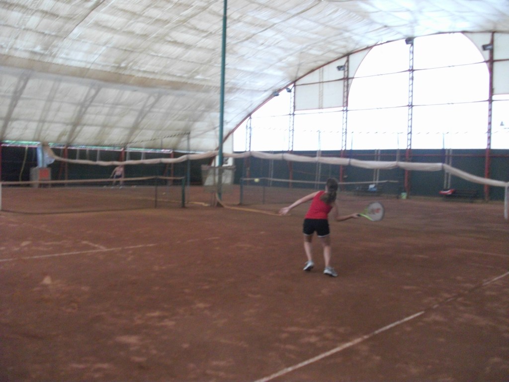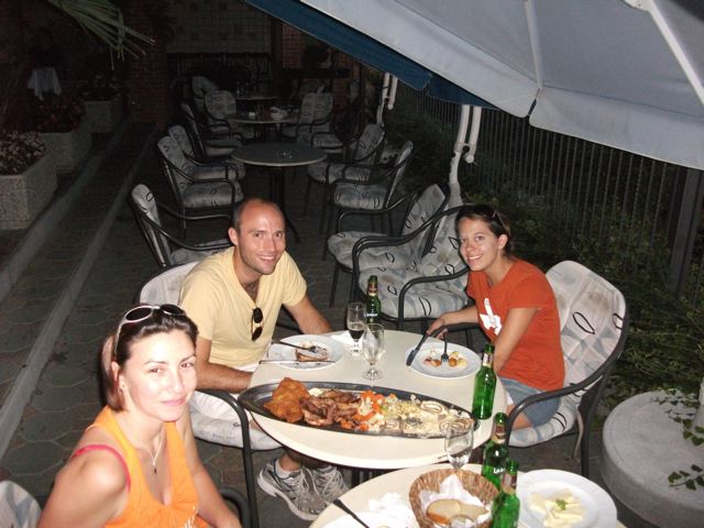 Tonight Nathalie and I had our last tennis date. Not to brag… no, we both played really well and it felt nice to stretch my legs on the court. We were very evenly matched. Afterwards we SHOWERED!!! It was our first shower since Sunday! It was amazing. What a feeling. Then we went to dinner in Brežice at a Gostilna (eatery). We sat on the back patio and relaxed in the cool shade of the evening. I think it was a great way to end our time here. Nathalie, Zach, and I shared a meat platter. Wow. Turkey in gorgonzola sauce, pork schnitzel, more pork, meat on skewers, Serbian flat bread, cheese pinwheel pastries, and roasted potatoes. Soooo good. We stuffed ourselves silly. We even have some for tomorrow.