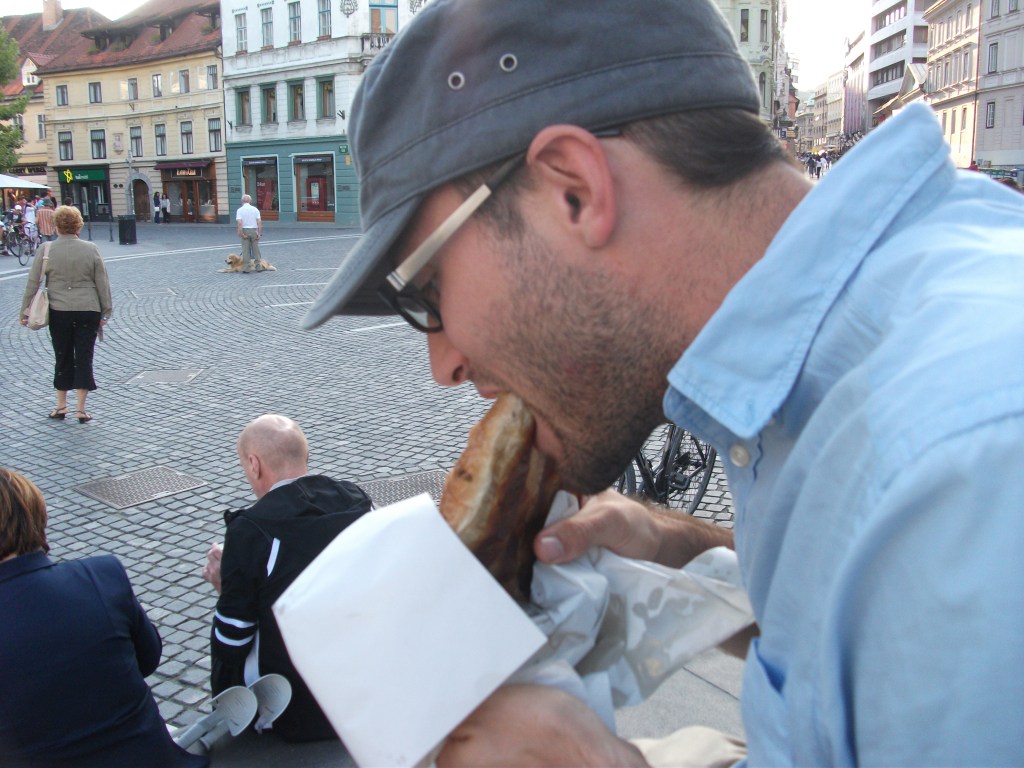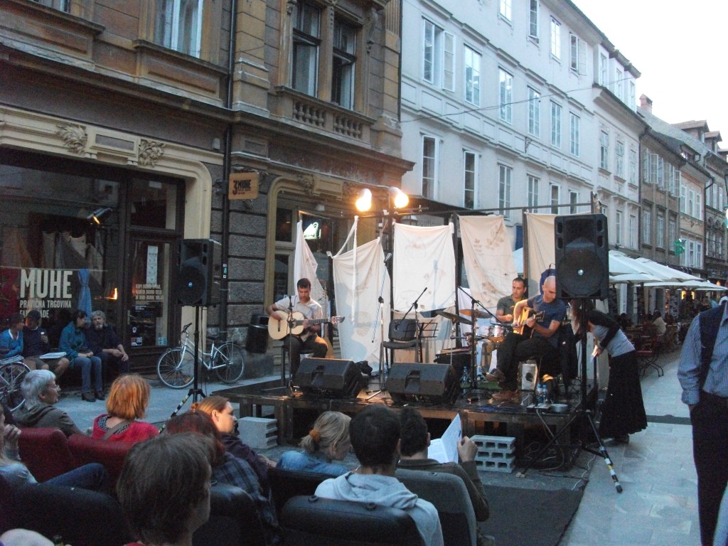 Once back in Ljubljana we grabbed bureks, a local street food, and sat by the triple bridge. Then we strolled along the river and back down our favorite street. We stumbled upon a small, outdoor concert and killed a couple of hours there. Then we returned to the station, got our bags out, and sat in a cafe until our train arrived for Venice, late, at 3:00am.