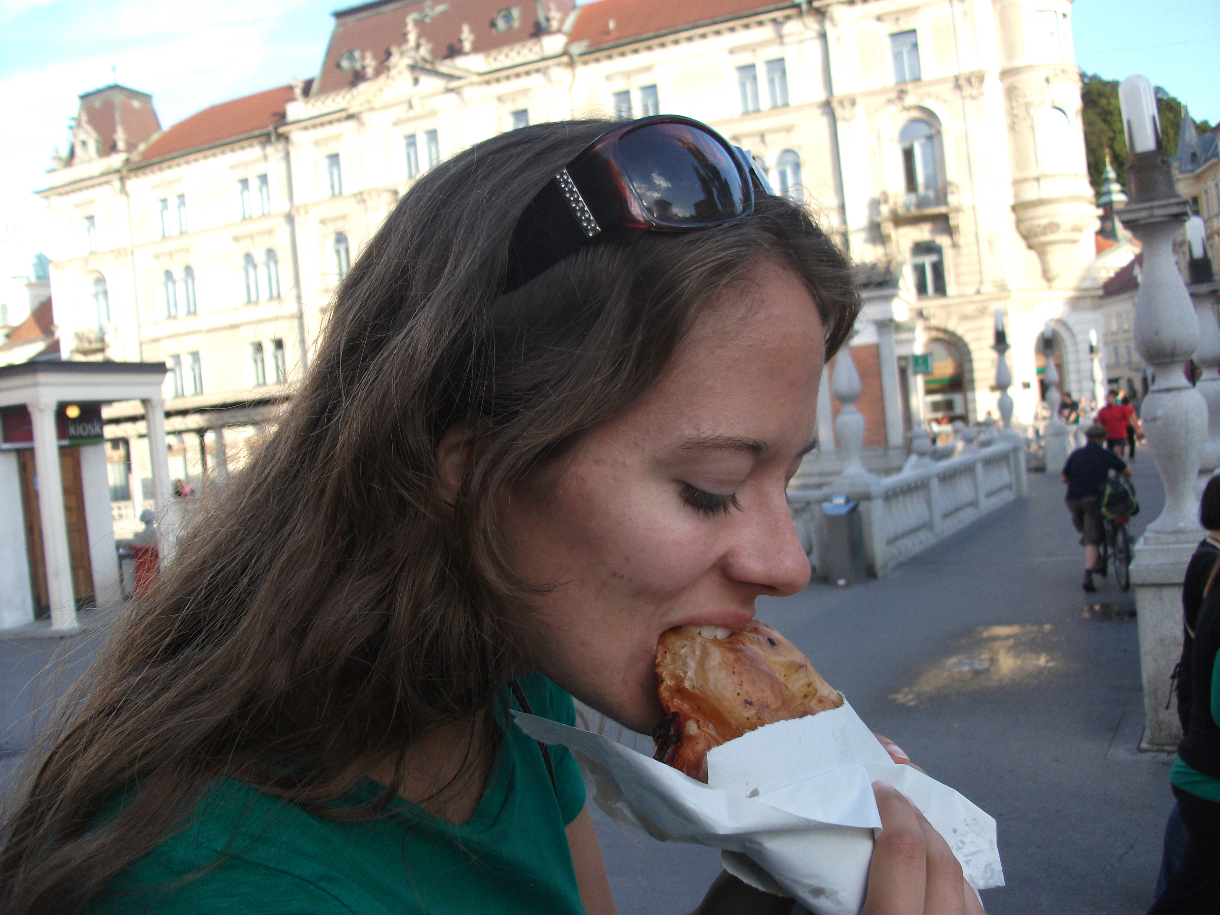 Once back in Ljubljana we grabbed bureks, a local street food, and sat by the triple bridge. Then we strolled along the river and back down our favorite street. We stumbled upon a small, outdoor concert and killed a couple of hours there. Then we returned to the station, got our bags out, and sat in a cafe until our train arrived for Venice, late, at 3:00am.