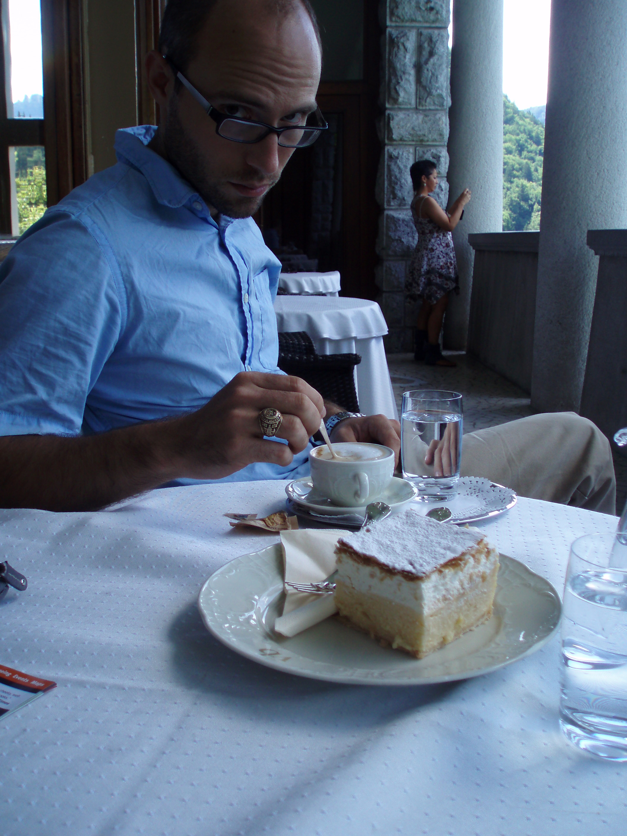 There was a small festival going on with craft stands, food tents, and a polka band. We strolled along the perimeter of the Lake – which is about 5km – for most of the afternoon. We stopped to have our picnic of bread, cheese, salami, wine in a secluded spot along the bank. Zach even got in and swam for a little while. The water was amazingly clear with different hues of blue, swans and ducks with ducklings swimming all around. The mountains circled the lake and enclosed us in paradise. We stumbled upon Cafe Belvedere which was the terrace of former Yugoslavian president, Josip Tito. His home, Vila Bled, was nearby and is now a hotel. We sat on the terrace overlooking the lake and the island and ate Bled’s famous cream cake (kremšnita) with coffee and water. Perfect. A moment I have frozen in my memory. Afterwards we walked the remainder of the lake and then sat down by the bank and took a nap before we left.