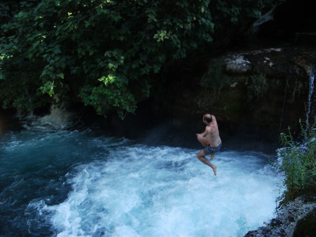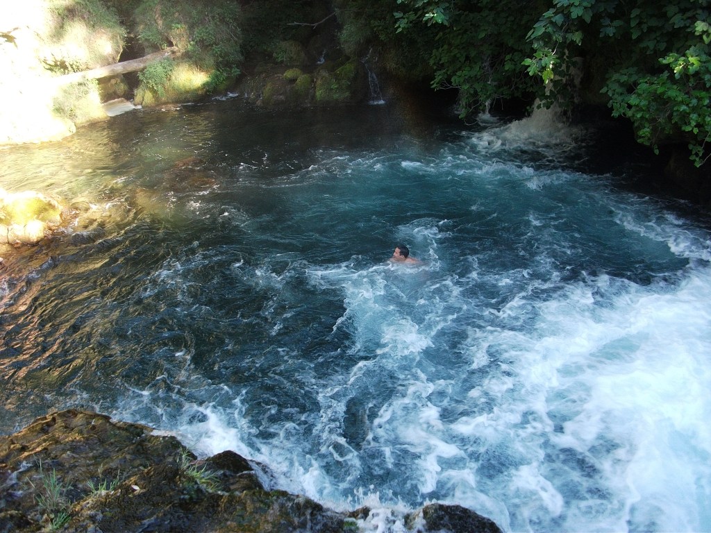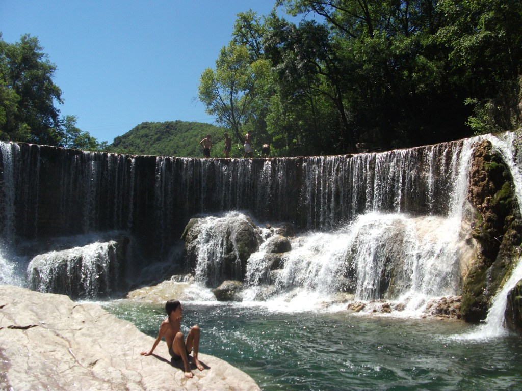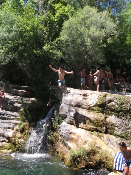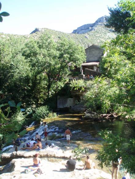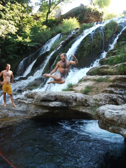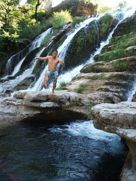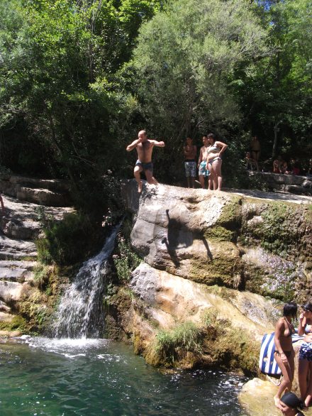 We left after a while and Nam took us to Cirque de Navacelles. There is an observation center at the top of a mountain, so first we had to wind our way up a one-lane road (with two-way traffic). The view was breathtaking; Nam called it the French version of the Grand Canyon. The canyon certainly was beautiful and in the bottom we could see the “cirque.” The cirque is a circular path the Vis River used to flow around a rock outcropping, it now flows through the valley, but its former path is still incredibly visible. As we started driving down the mountain we turned toward the town of Navacelles for more swimming and our dinner picnic. This time two of Nam’s friends met up with us. We found a great rock above the falls and feasted again, this time with the addition of a roasted chicken, peaches, chips, and wine. Stephanie and I felt the water was a little too cold this time around, but the boys all went down the falls for a dip in the water. They jumped into what Nam termed “The Bowl,” a small, round hole of water surrounded by rock in the middle of the falls.