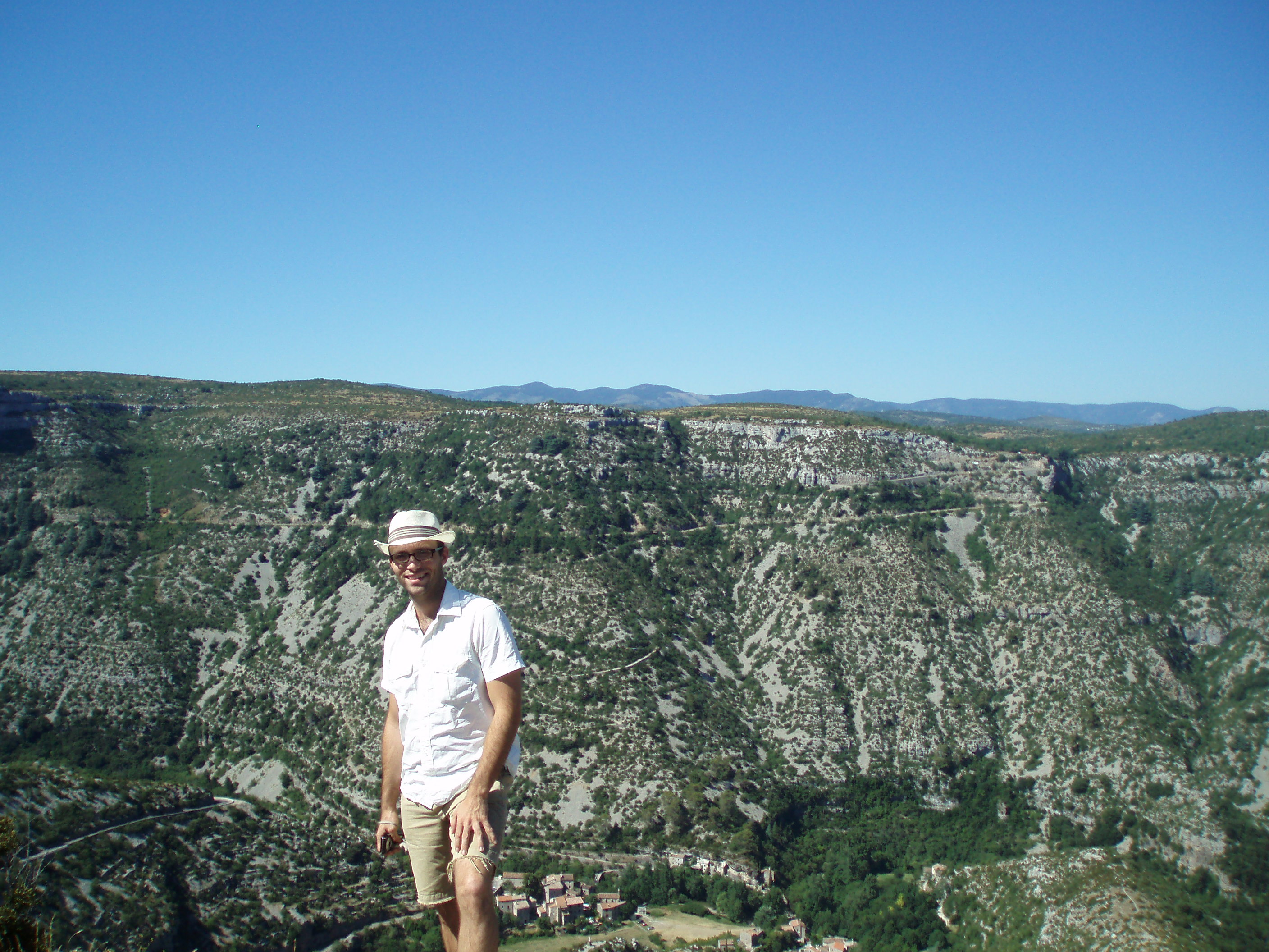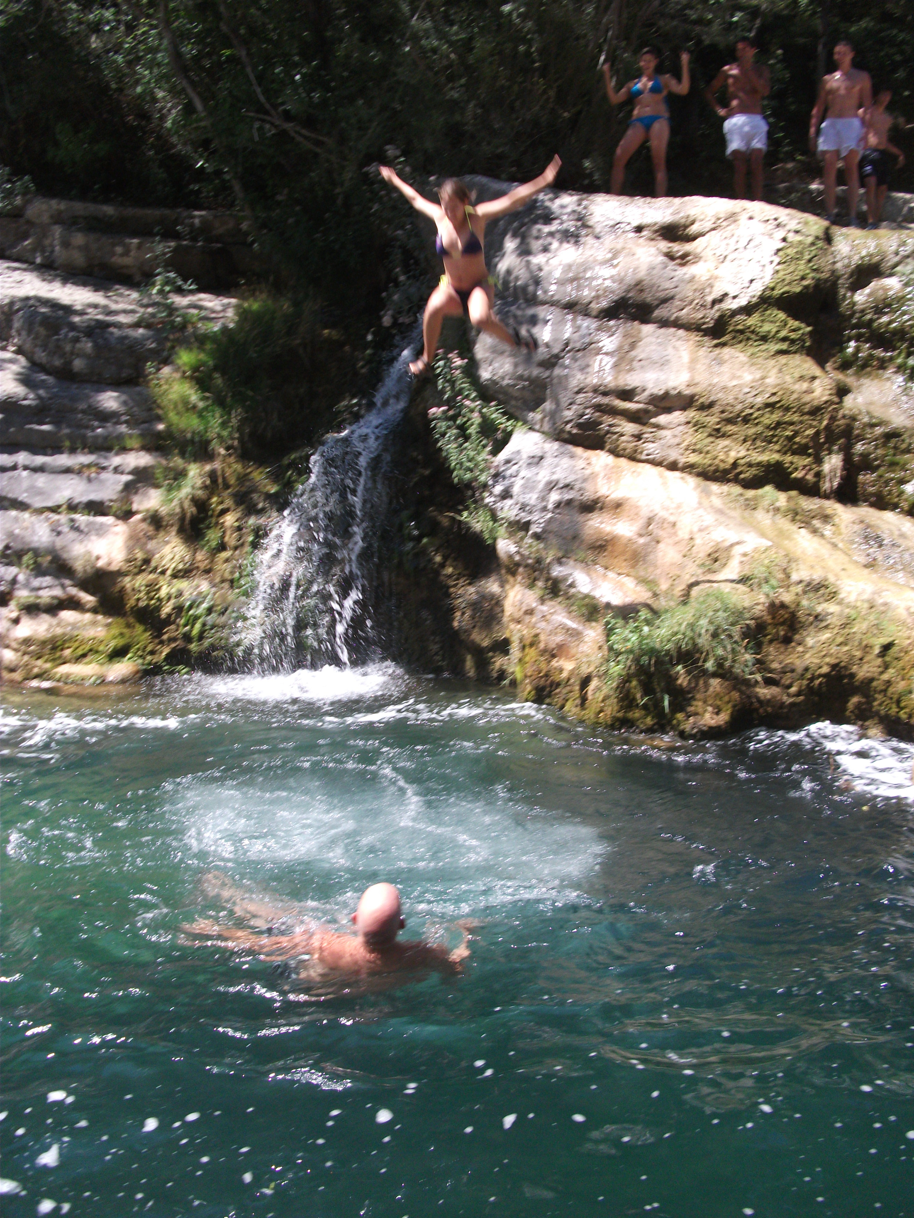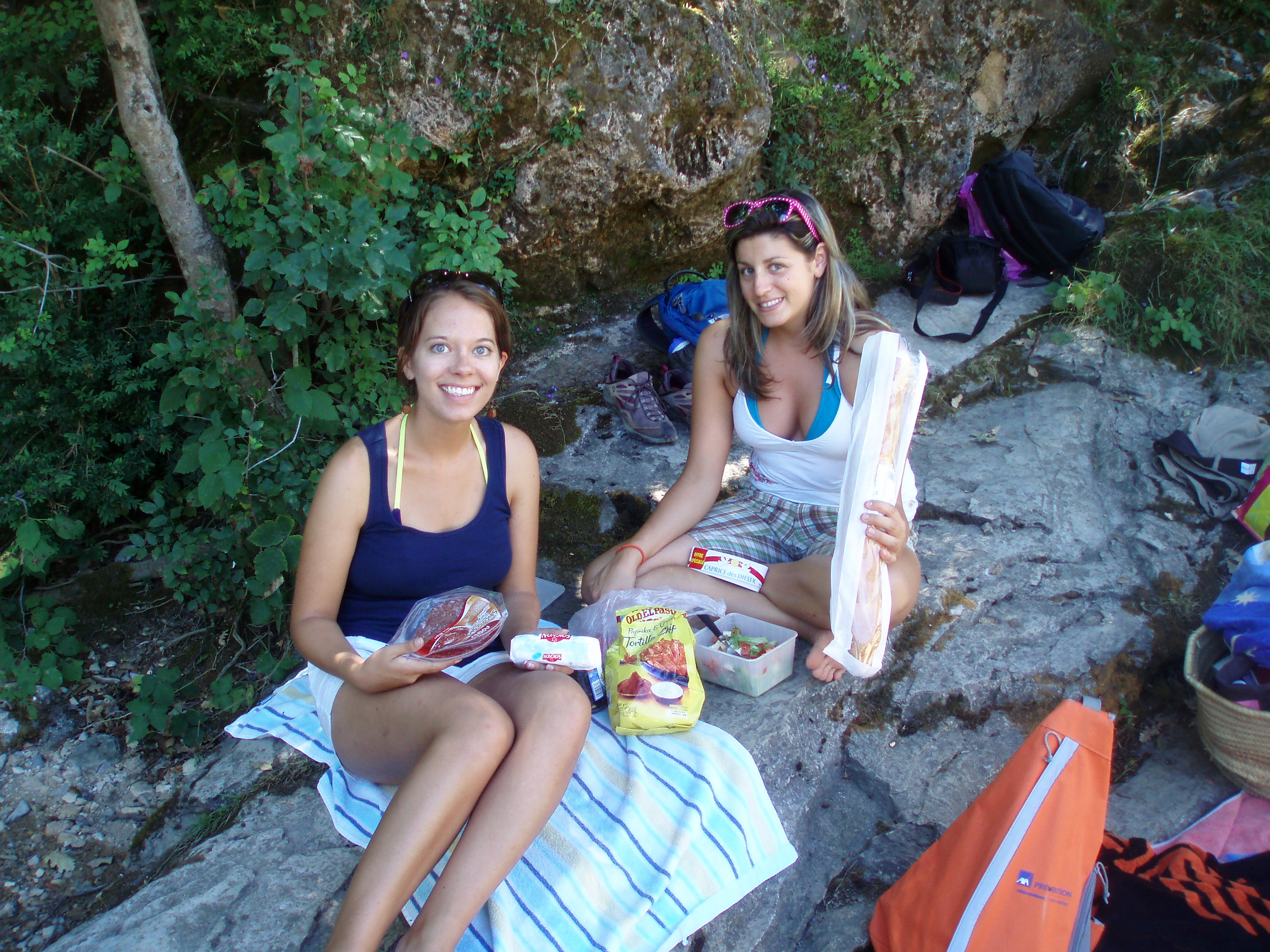We left after a while and Nam took us to Cirque de Navacelles. There is an observation center at the top of a mountain, so first we had to wind our way up a one-lane road (with two-way traffic). The view was breathtaking; Nam called it the French version of the Grand Canyon. The canyon certainly was beautiful and in the bottom we could see the “cirque.” The cirque is a circular path the Vis River used to flow around a rock outcropping, it now flows through the valley, but its former path is still incredibly visible. As we started driving down the mountain we turned toward the town of Navacelles for more swimming and our dinner picnic. This time two of Nam’s friends met up with us. We found a great rock above the falls and feasted again, this time with the addition of a roasted chicken, peaches, chips, and wine. Stephanie and I felt the water was a little too cold this time around, but the boys all went down the falls for a dip in the water. They jumped into what Nam termed “The Bowl,” a small, round hole of water surrounded by rock in the middle of the falls.