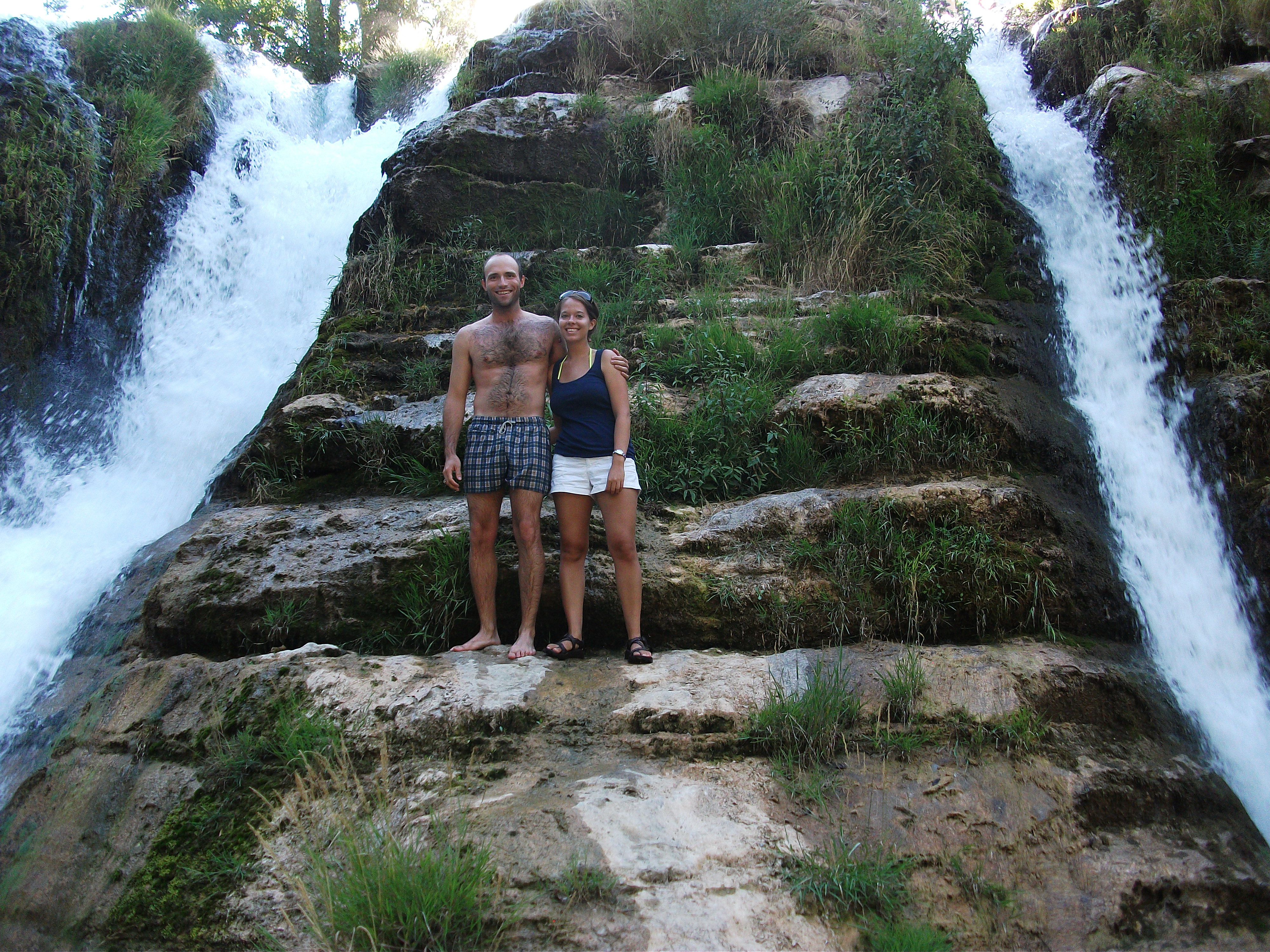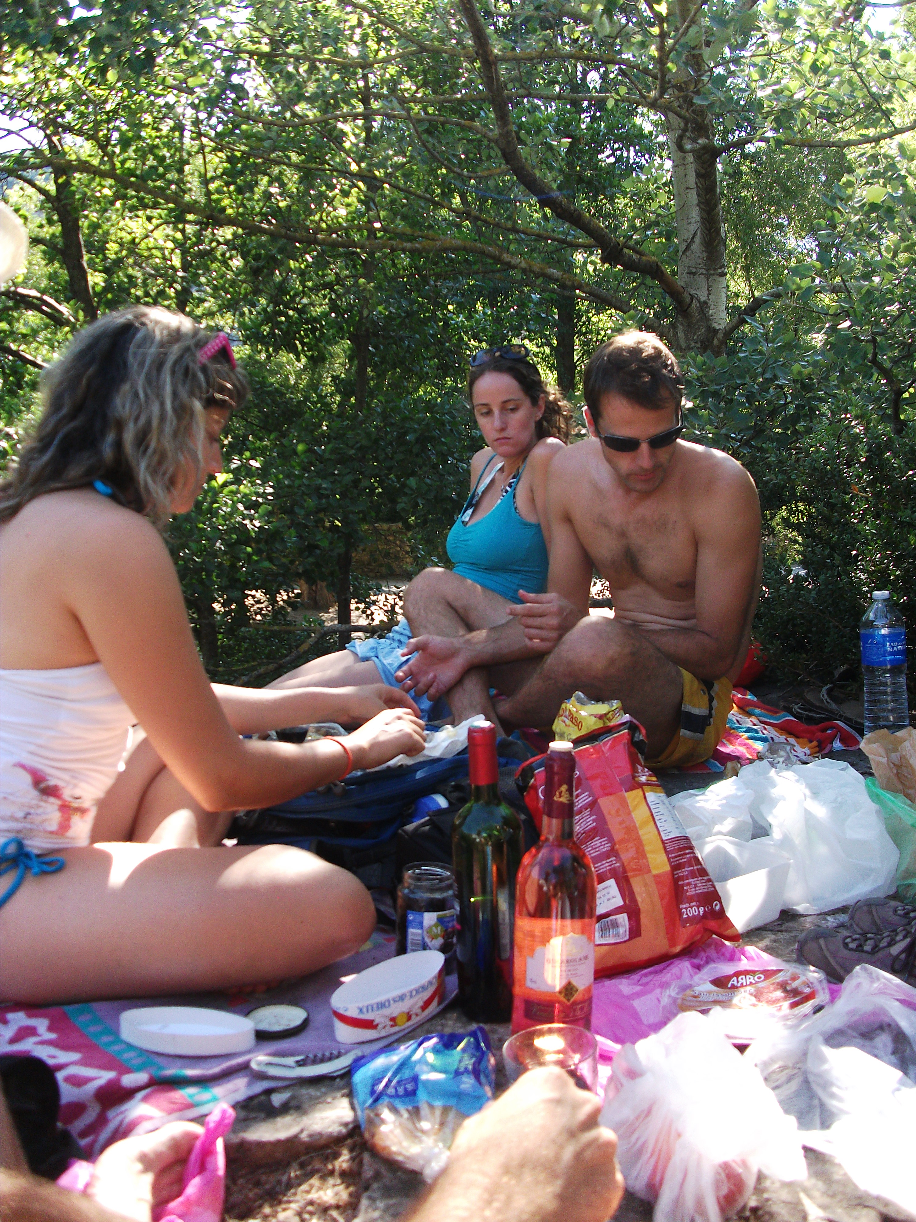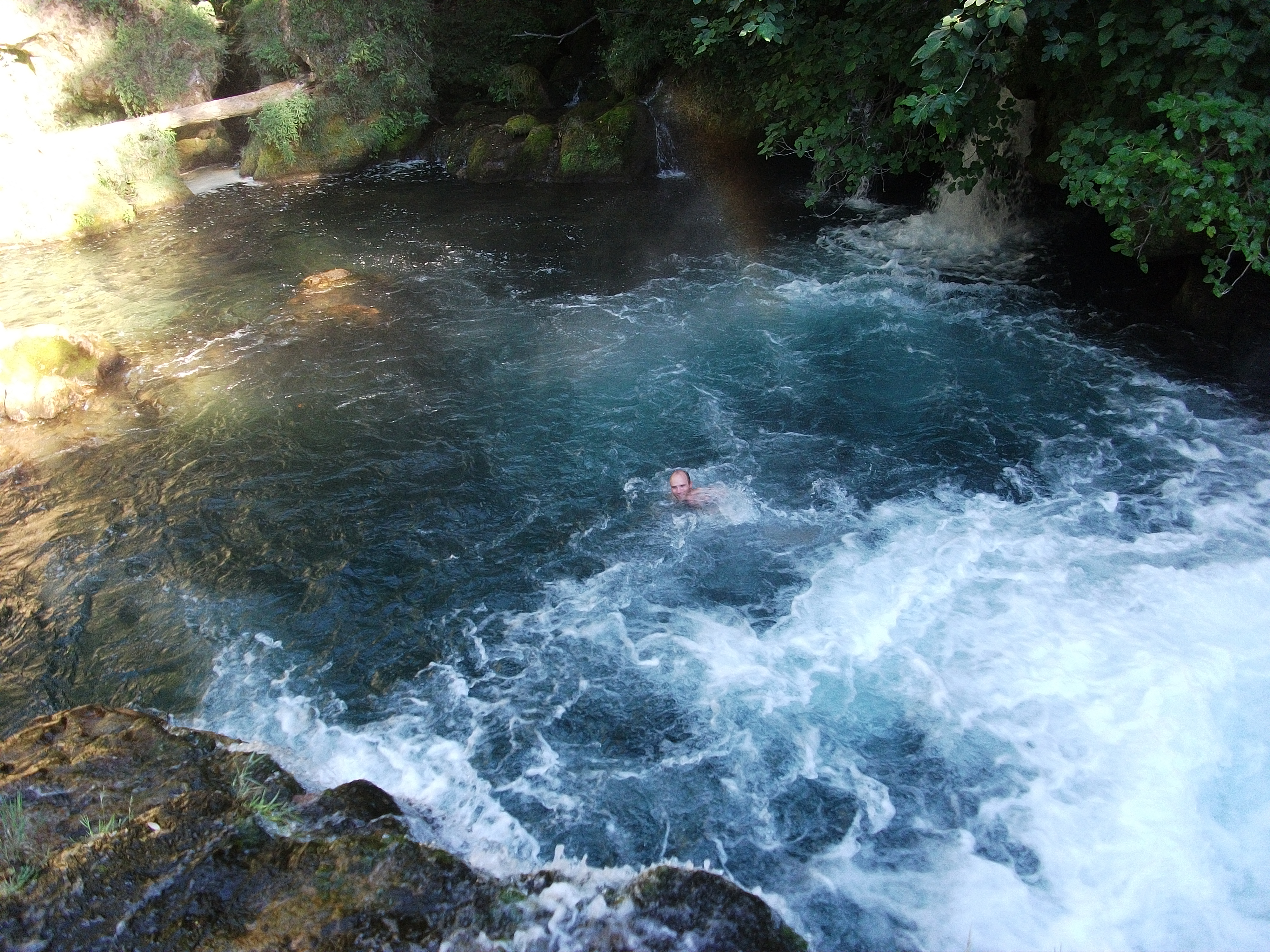 We left after a while and Nam took us to Cirque de Navacelles. There is an observation center at the top of a mountain, so first we had to wind our way up a one-lane road (with two-way traffic). The view was breathtaking; Nam called it the French version of the Grand Canyon. The canyon certainly was beautiful and in the bottom we could see the “cirque.” The cirque is a circular path the Vis River used to flow around a rock outcropping, it now flows through the valley, but its former path is still incredibly visible. As we started driving down the mountain we turned toward the town of Navacelles for more swimming and our dinner picnic. This time two of Nam’s friends met up with us. We found a great rock above the falls and feasted again, this time with the addition of a roasted chicken, peaches, chips, and wine. Stephanie and I felt the water was a little too cold this time around, but the boys all went down the falls for a dip in the water. They jumped into what Nam termed “The Bowl,” a small, round hole of water surrounded by rock in the middle of the falls.