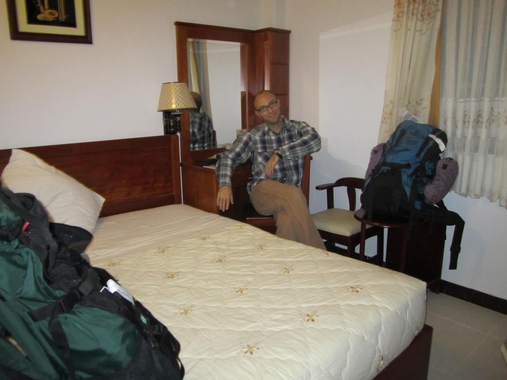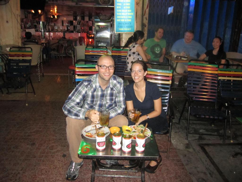 Once we finally arrived in Saigon (Ho Chi Minh City or HCMC) we went through immigration and customs only to walk outside the airport and be completely overwhelmed. There were crowd-control gates outside keeping several hundred people from going inside the airport while they waited for their family and friends to come outside. We felt like rock stars walking out of the airport to such a crowd of people. We were a little apprehensive about taking just any taxi because we have read the numerous accounts of people being scammed by their drivers – we tried to pick out the taxi companies that we knew were okay, but we weren’t allowed to handpick our cab, of course. Eventually we went ahead and just got in a taxi (one without tinted windows) and luckily, weren’t scammed or threatened by our driver. After arriving at our hotel, An An 2, we put down our bags and went out onto the street to look for some food and beer. We were quickly pulled into a street-side place where we got a couple of beers each and some noodles and pork for about $8. As we ate, we were introduced to the begging problem in Vietnam, which we had read about, but for which I had not really been prepared. A least 4 or 5 people either approached us trying to sell small goods – flowers, nuts, rice cakes – or just outright begging by sitting in front of us waiting for us to give them money. It’s something that we will probably deal with everywhere and I’ll just have to get used to it. Now we are going to head out for our first full day in HCMC.