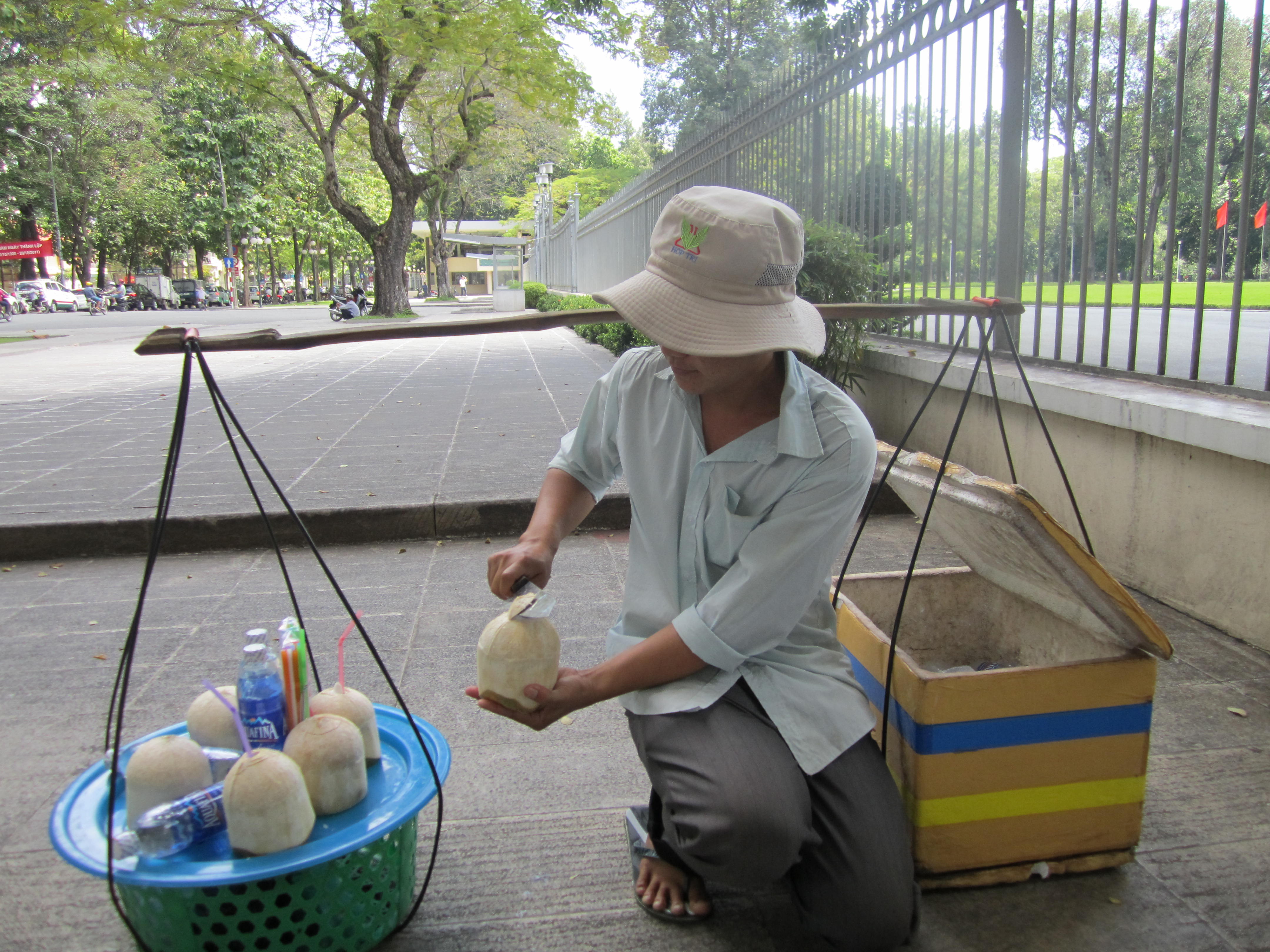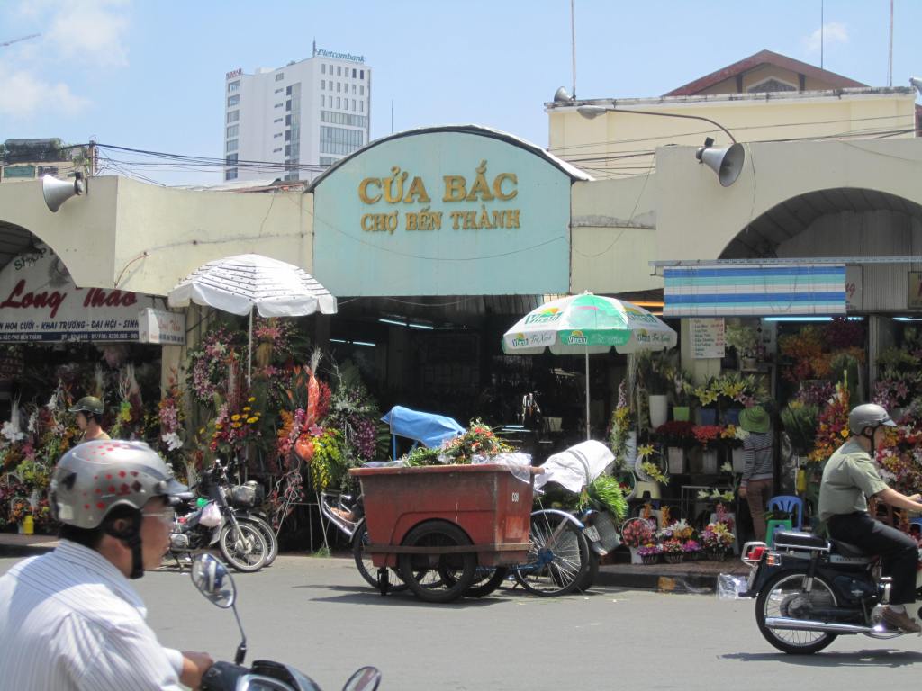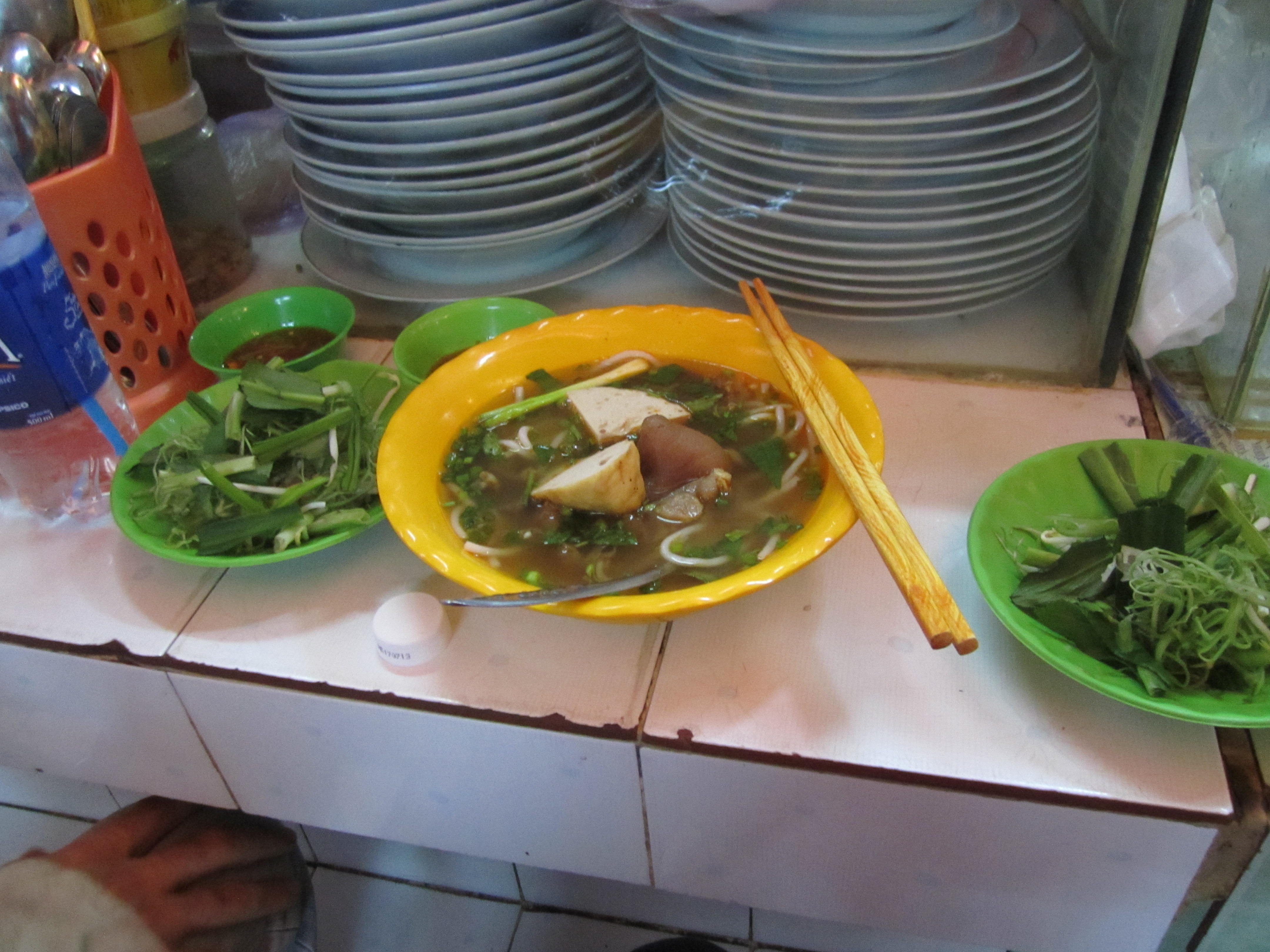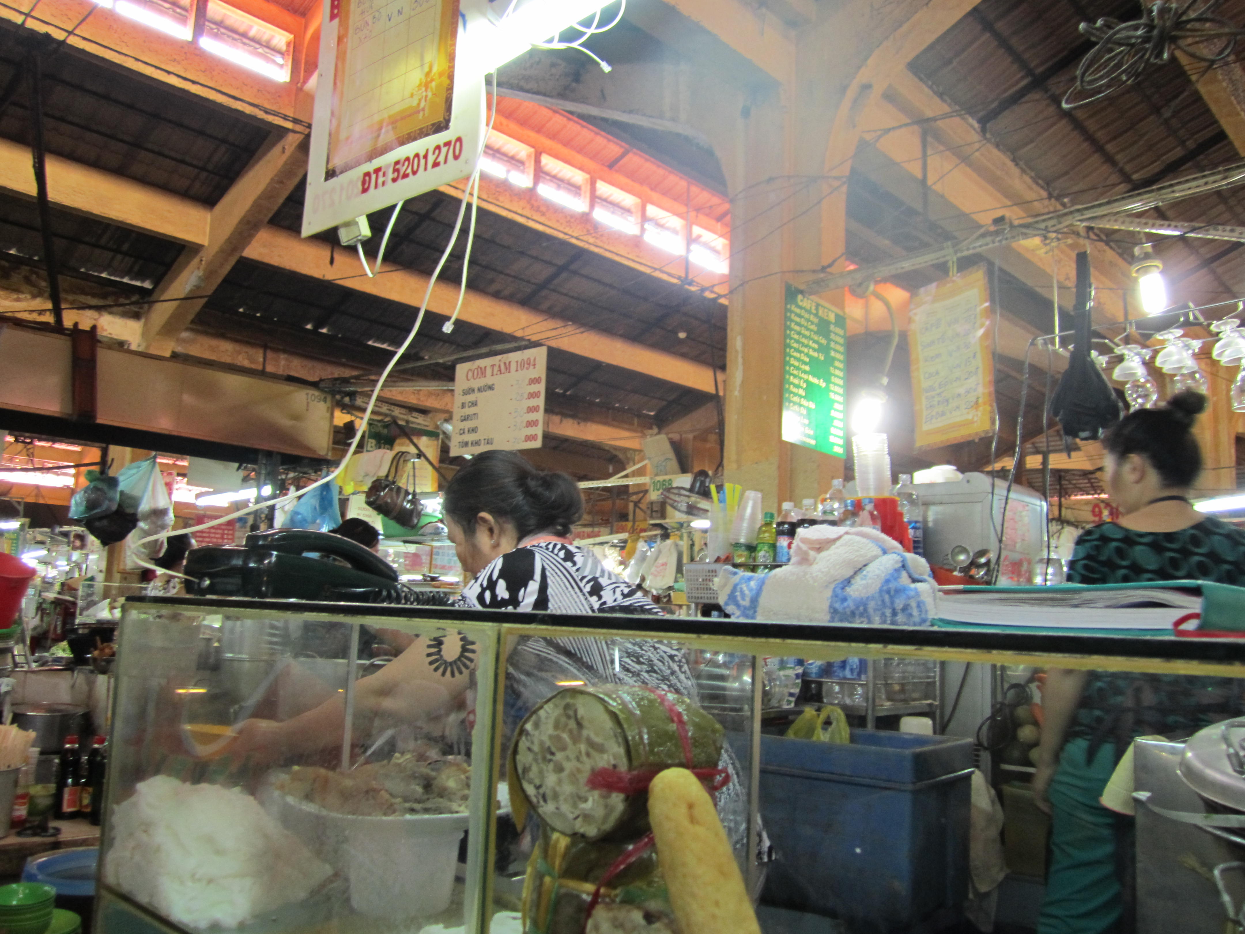 After coffee we decided to visit Ben Thanh Market and look around for some gifts and lunch. The market is packed! In many places the aisles are so narrow that only one person can walk in between the stalls and many times your arms brush the merchandise. Everything you could possibly want to buy is at the market. Food stalls, fresh fruits and veggies, coffee beans, raw candies and seafood, textiles, and endless souvenirs. Some of the food smells are overwhelming; there are so many different odors mixing together in the humid air that it doesn’t always smell so delicious. We were pulled into one of the food stalls for lunch. I’m not quite sure what exactly we ordered, some sort of pho, soup with rice noodles and beef? I’m not convinced that the meat in that soup was beef… it looked more like a head cheese. We bought two bowls for 30,000 each ($1.50) and a couple of bottled waters. Customers at these food stalls just sit at the small counter connected to the stall where the food is prepared. There was a small fan blowing on us as we ate and re-hydrated.