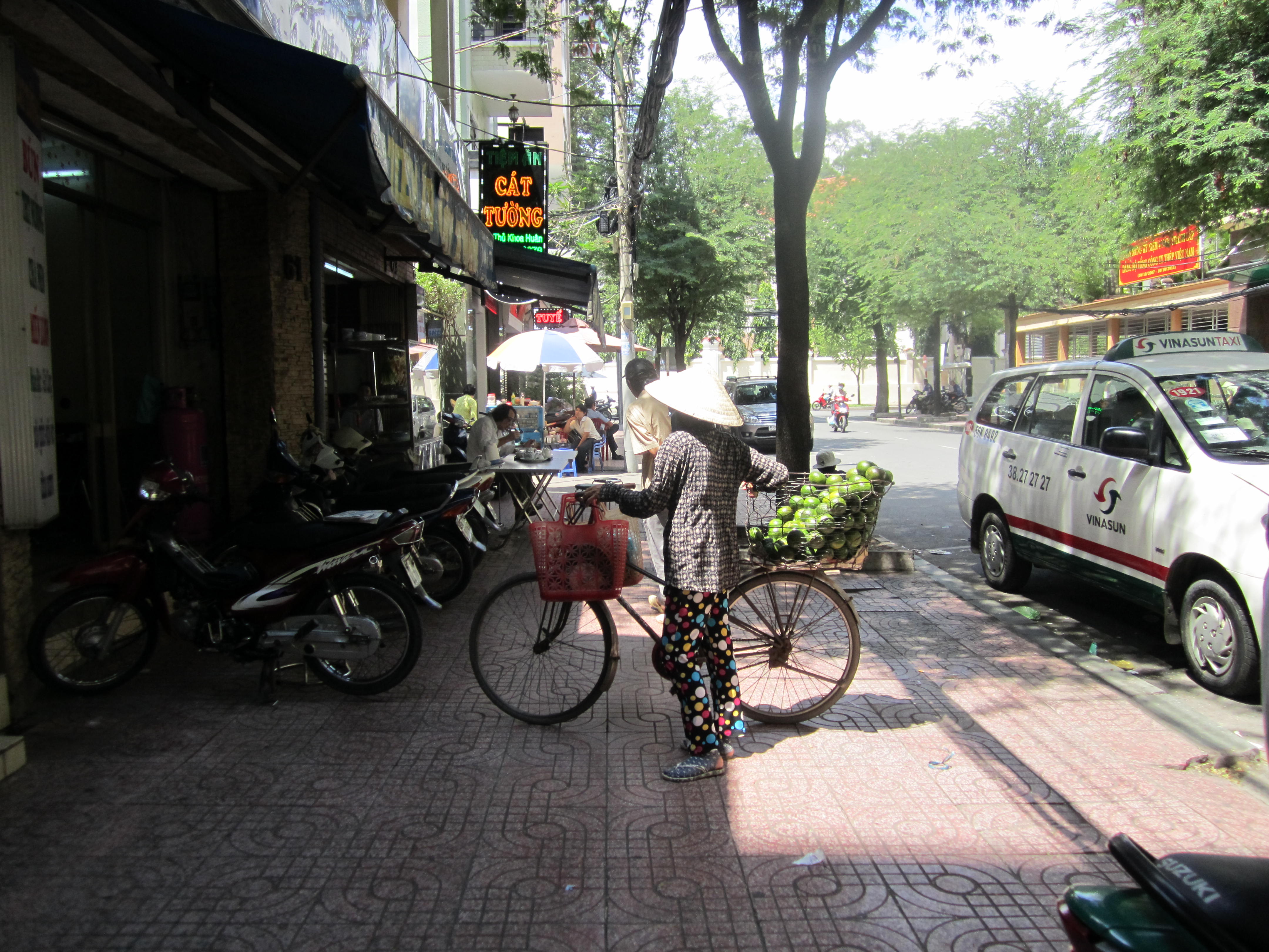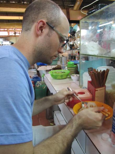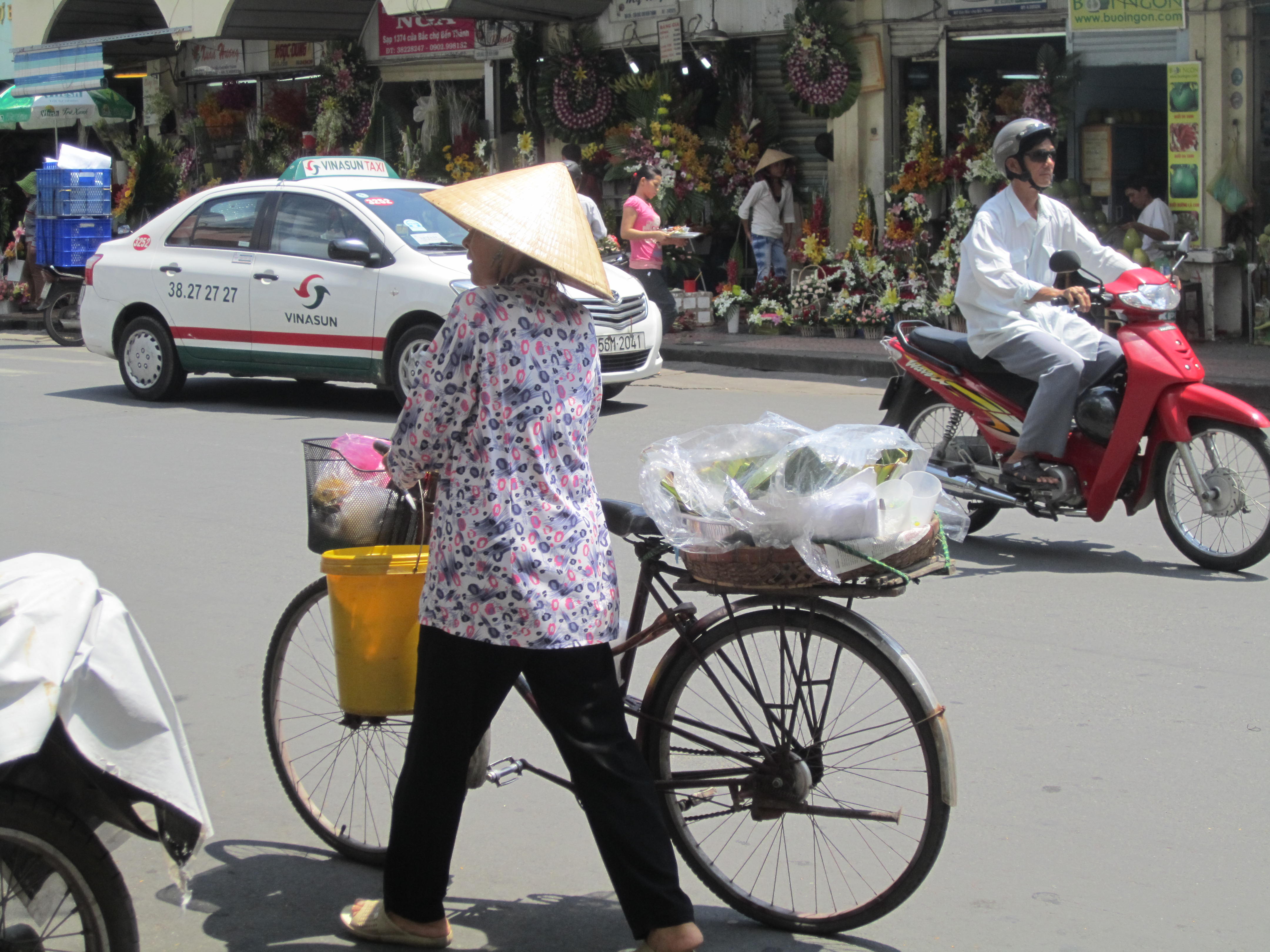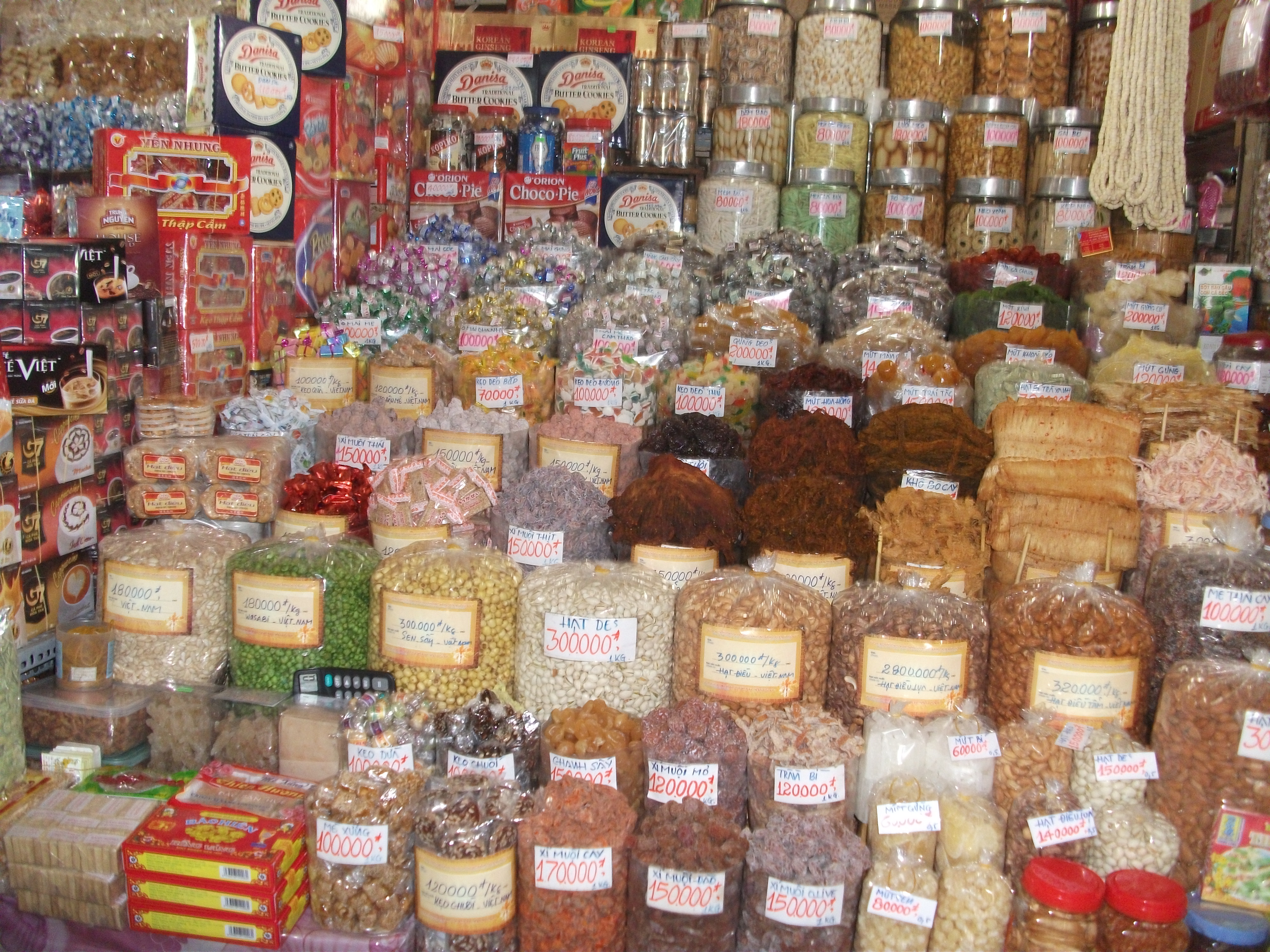 After coffee we decided to visit Ben Thanh Market and look around for some gifts and lunch. The market is packed! In many places the aisles are so narrow that only one person can walk in between the stalls and many times your arms brush the merchandise. Everything you could possibly want to buy is at the market. Food stalls, fresh fruits and veggies, coffee beans, raw candies and seafood, textiles, and endless souvenirs. Some of the food smells are overwhelming; there are so many different odors mixing together in the humid air that it doesn’t always smell so delicious. We were pulled into one of the food stalls for lunch. I’m not quite sure what exactly we ordered, some sort of pho, soup with rice noodles and beef? I’m not convinced that the meat in that soup was beef… it looked more like a head cheese. We bought two bowls for 30,000 each ($1.50) and a couple of bottled waters. Customers at these food stalls just sit at the small counter connected to the stall where the food is prepared. There was a small fan blowing on us as we ate and re-hydrated.