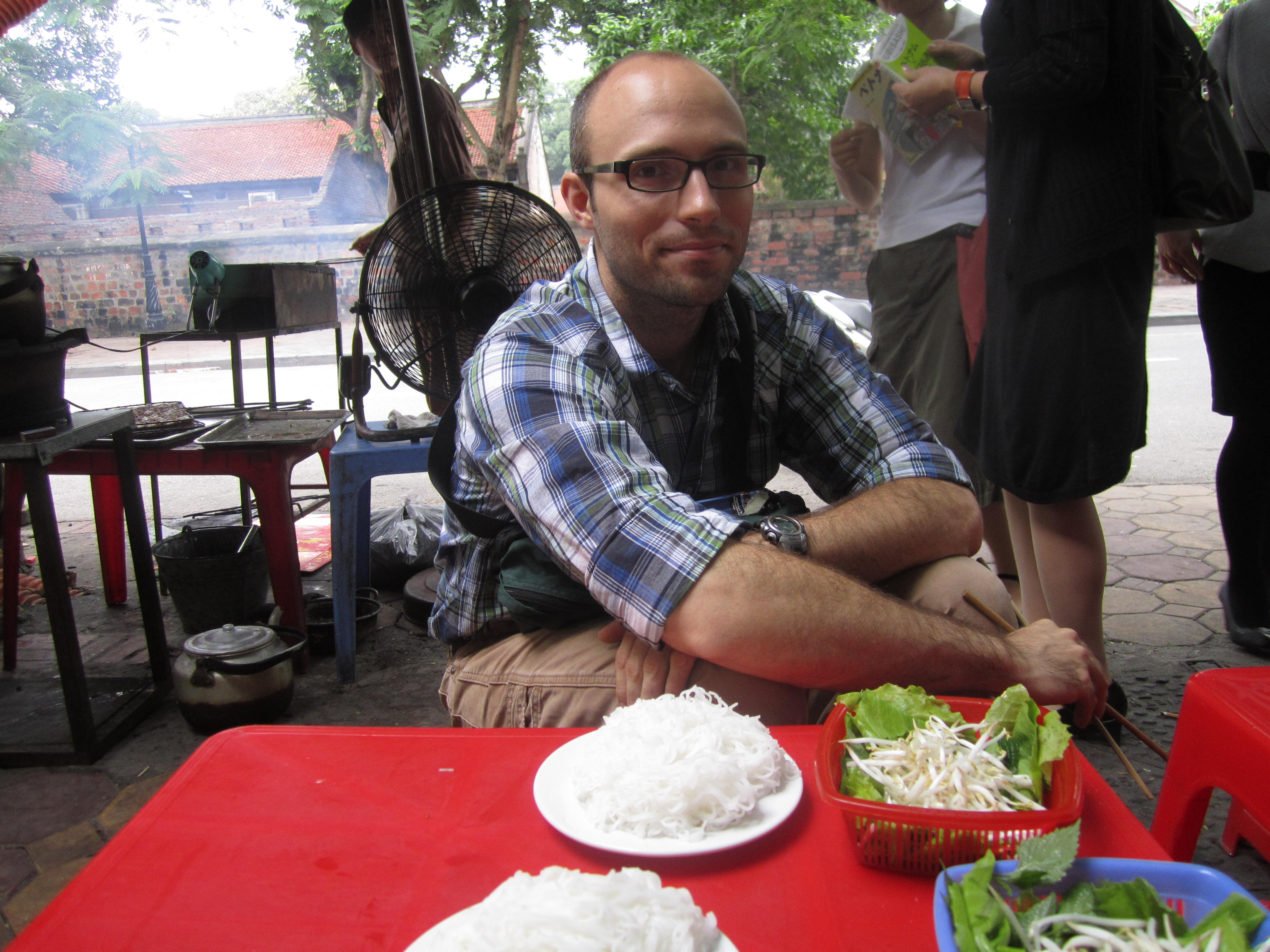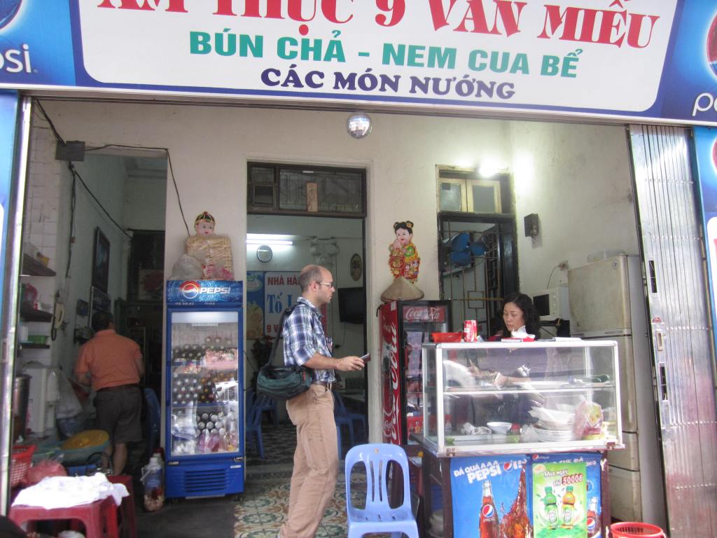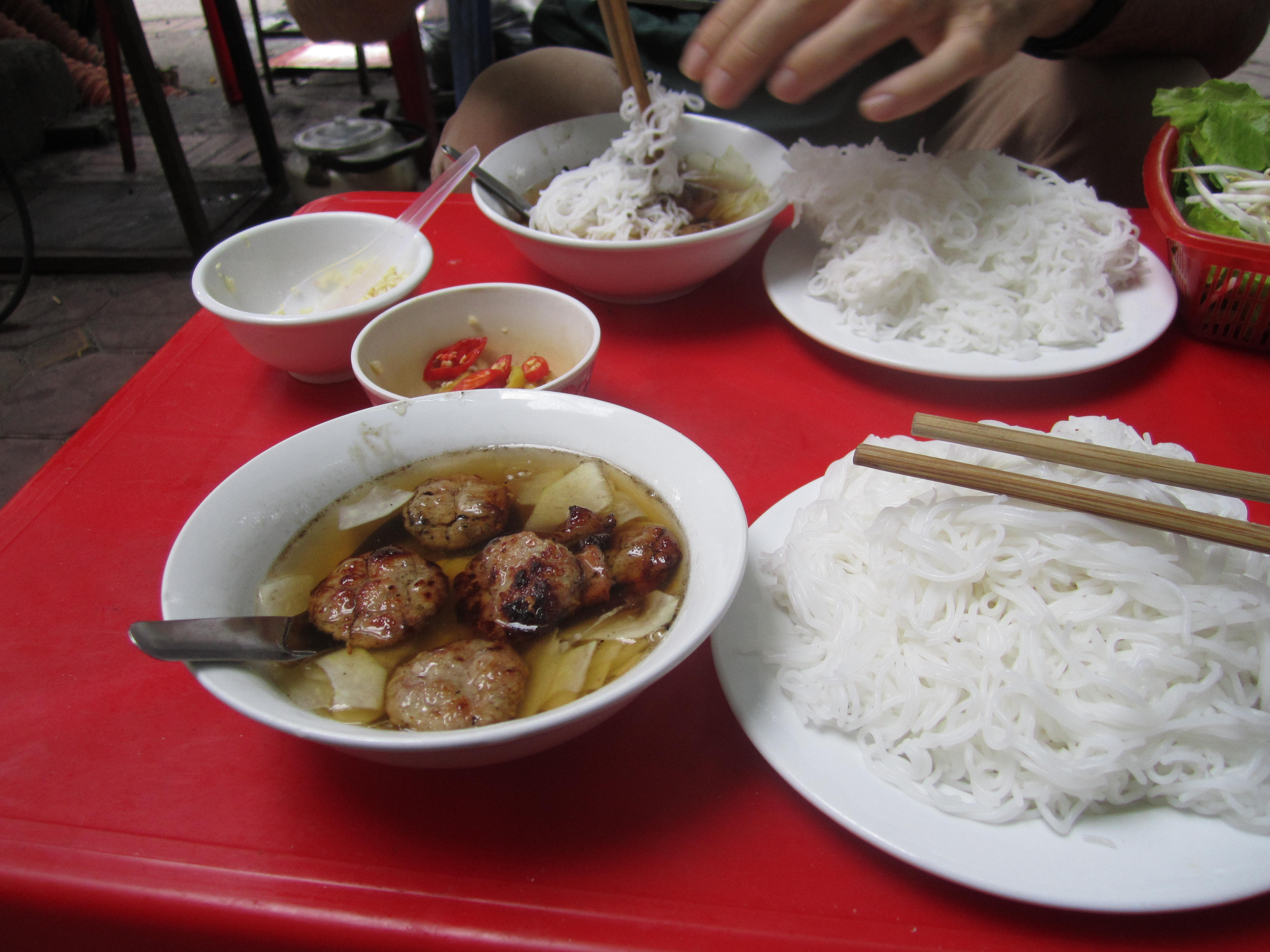 This morning we took our time and slept a bit longer and then packed up all of our things for our flight before checking out of the hotel at noon. We left our bags there and ventured out into Hanoi for the final time. I wanted to find a bookstore I had read about – Bookworm – so we set off for where it was supposed to be. When we eventually found the right address, it was no longer there. An Aussie couple was also looking for it and just as we were about to give up an older Vietnamese man came up to us and asked if we were looking for books. He communicated in short that the store had moved. He went back into his house and when he emerged he had 2 bookmarks with their new address! It was quite a bit further so we decided to go back around the corner for lunch at a Bun Cha place we had seen. That was the BEST DECISION. It was our first experience with bun cha and, WOW. Definitely my favorite dish of the trip. Oh man. Our combined meal was $3.50. What a deal! And it was so delicious. They just really know how to do pork here – and I LOVE pork.
