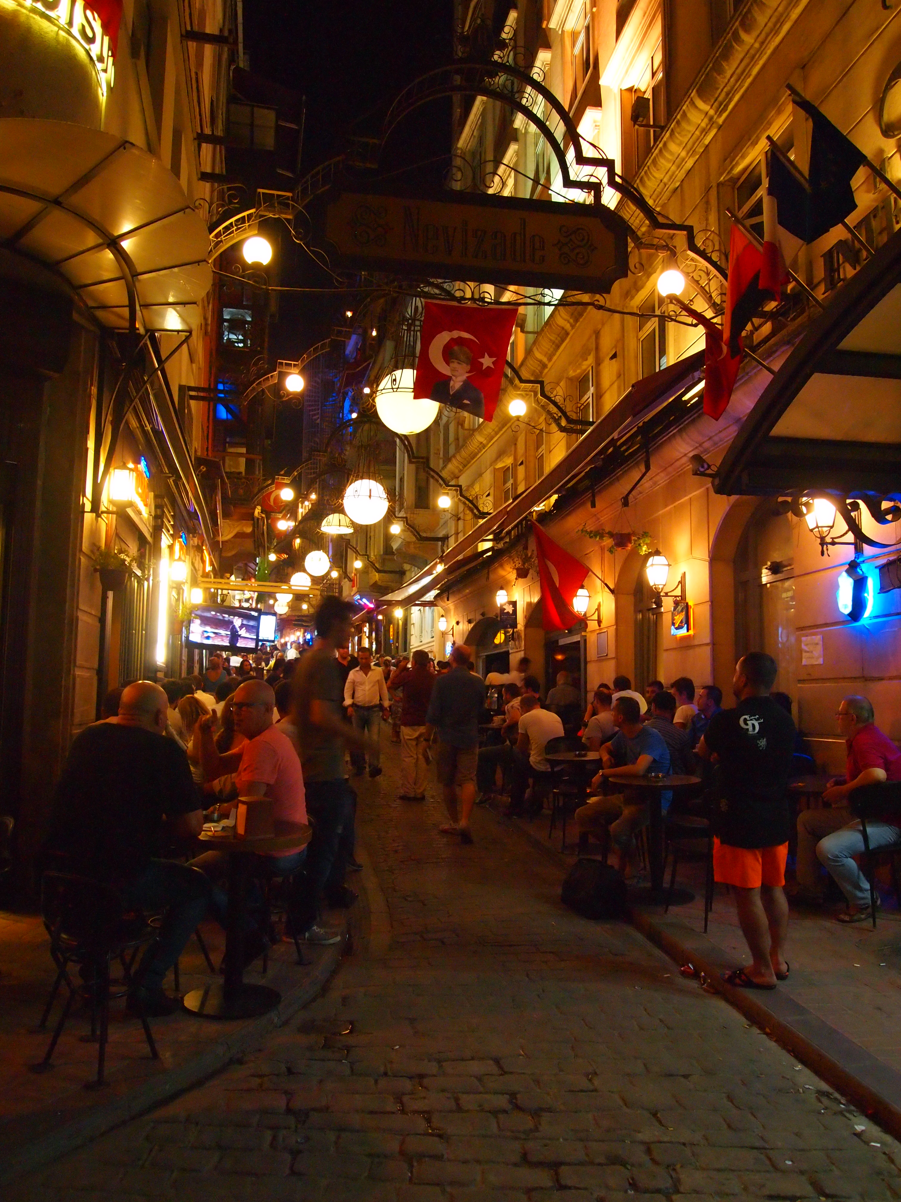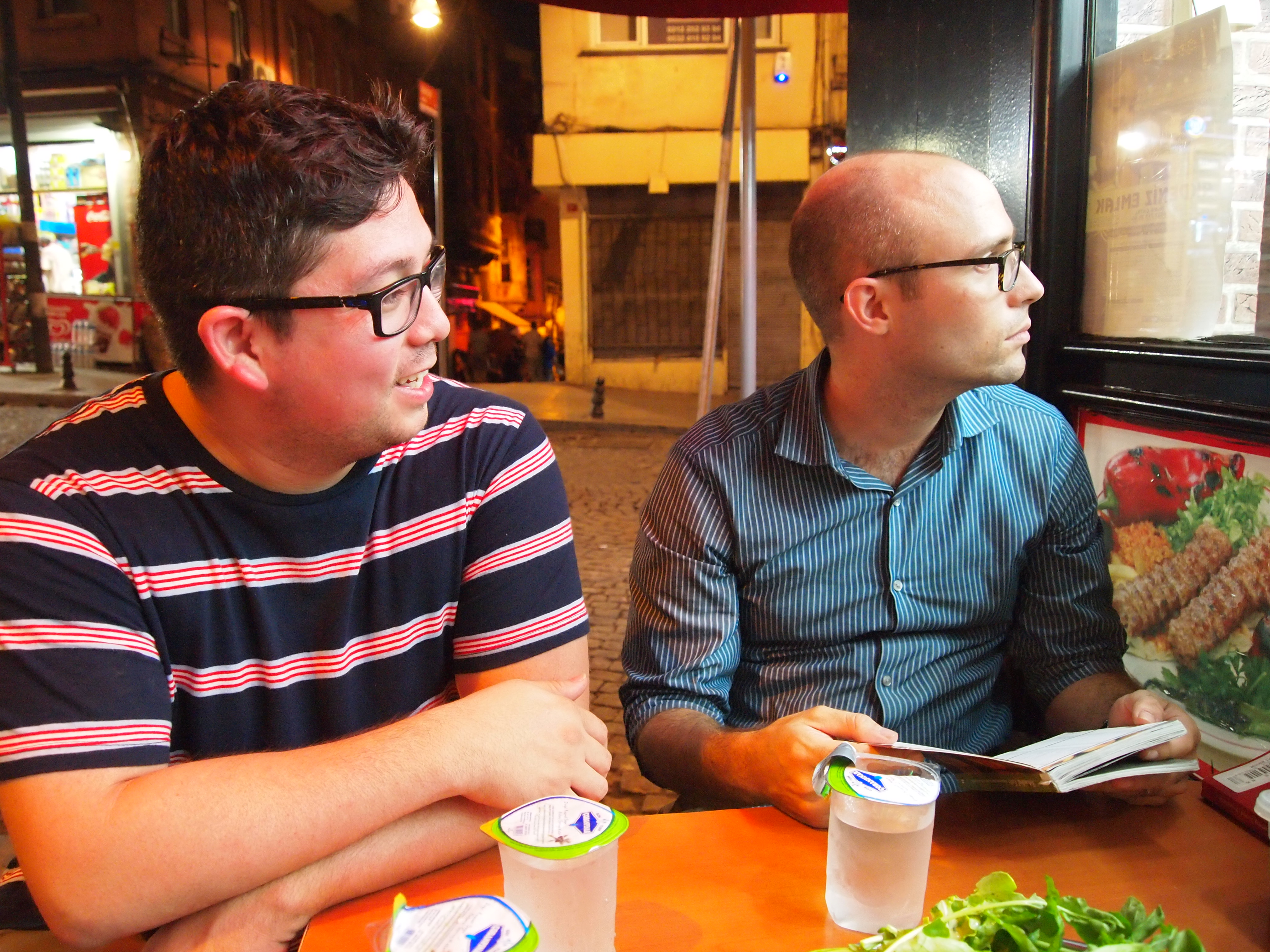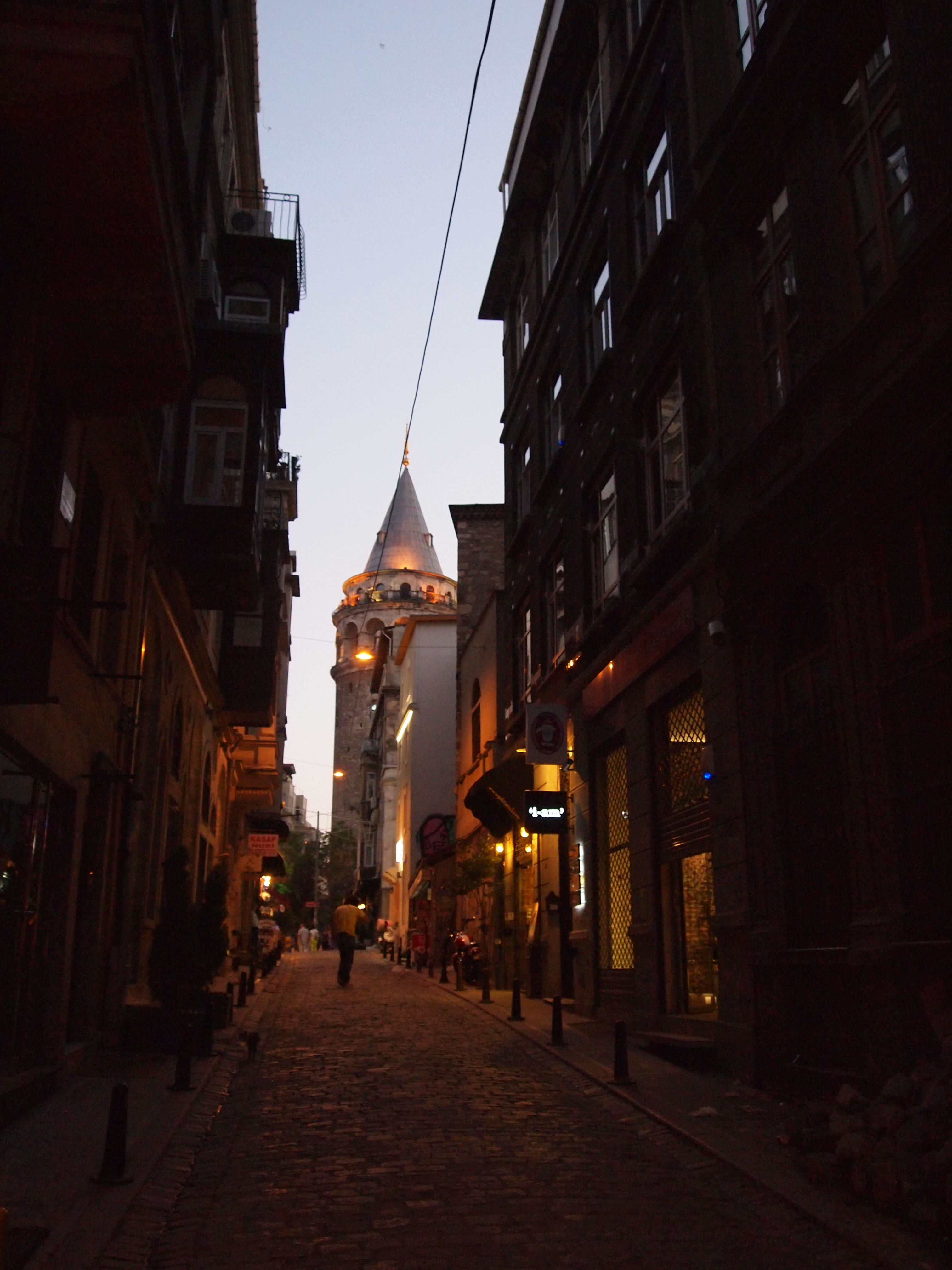 After Fatih left we decided to acquaint ourselves with the neighborhood and go for a little walk. We walked up to the tower and meandered down some narrow streets before grabbing a table outside and having our first cups of Turkish tea or çay (pronounced chai). Then we headed back to our apartment to collect Tim – who was napping – and head out for some dinner.
