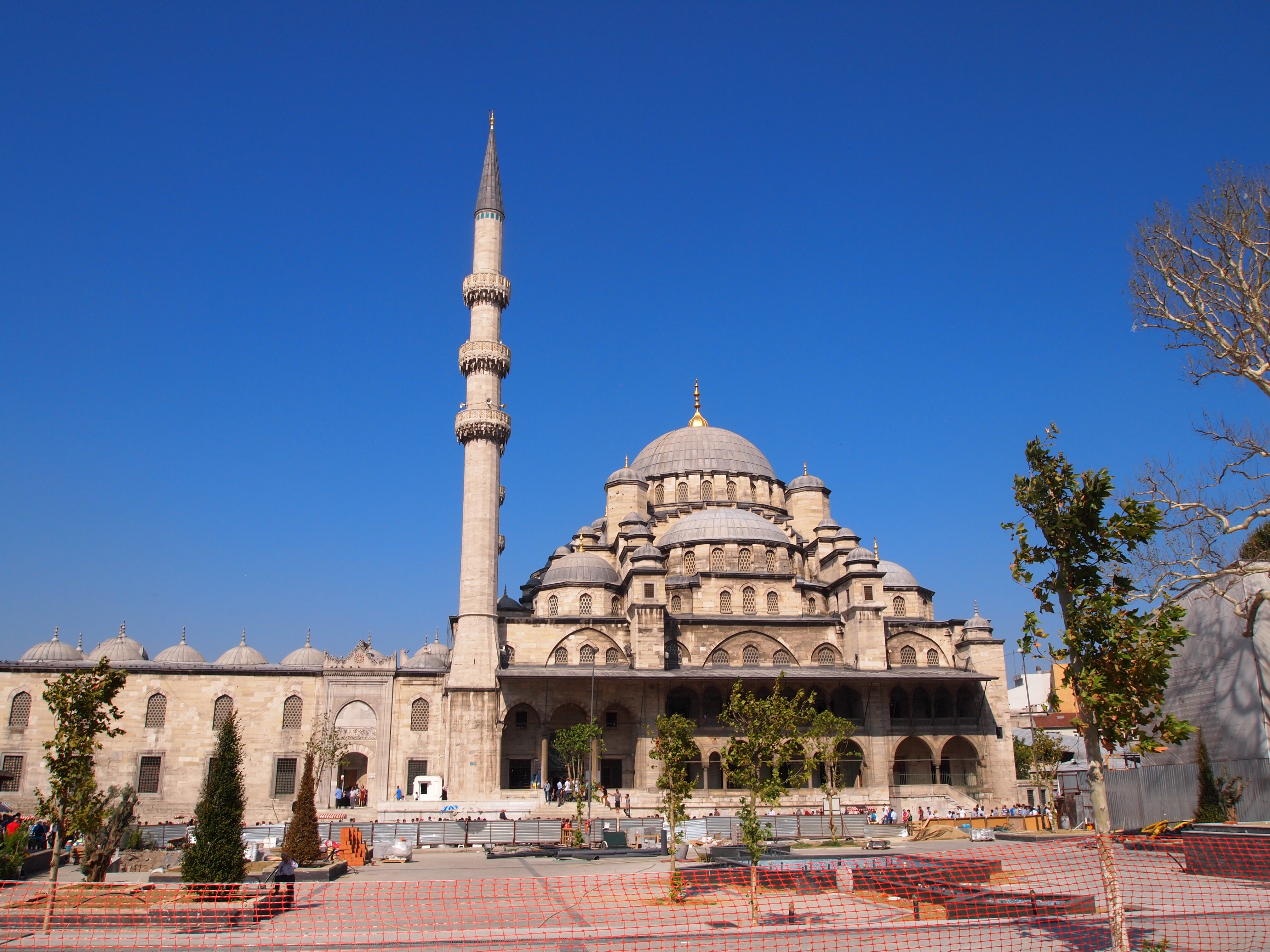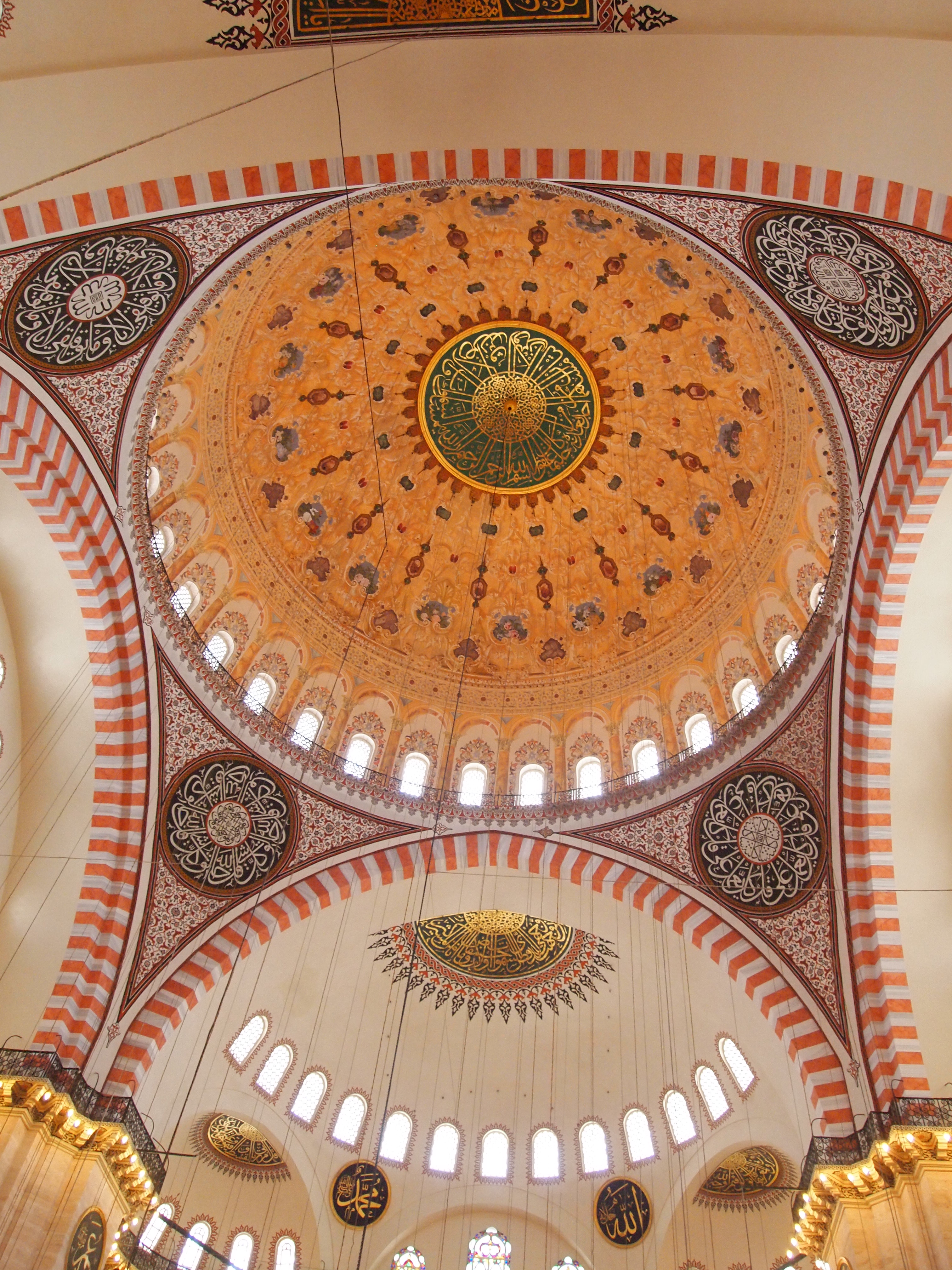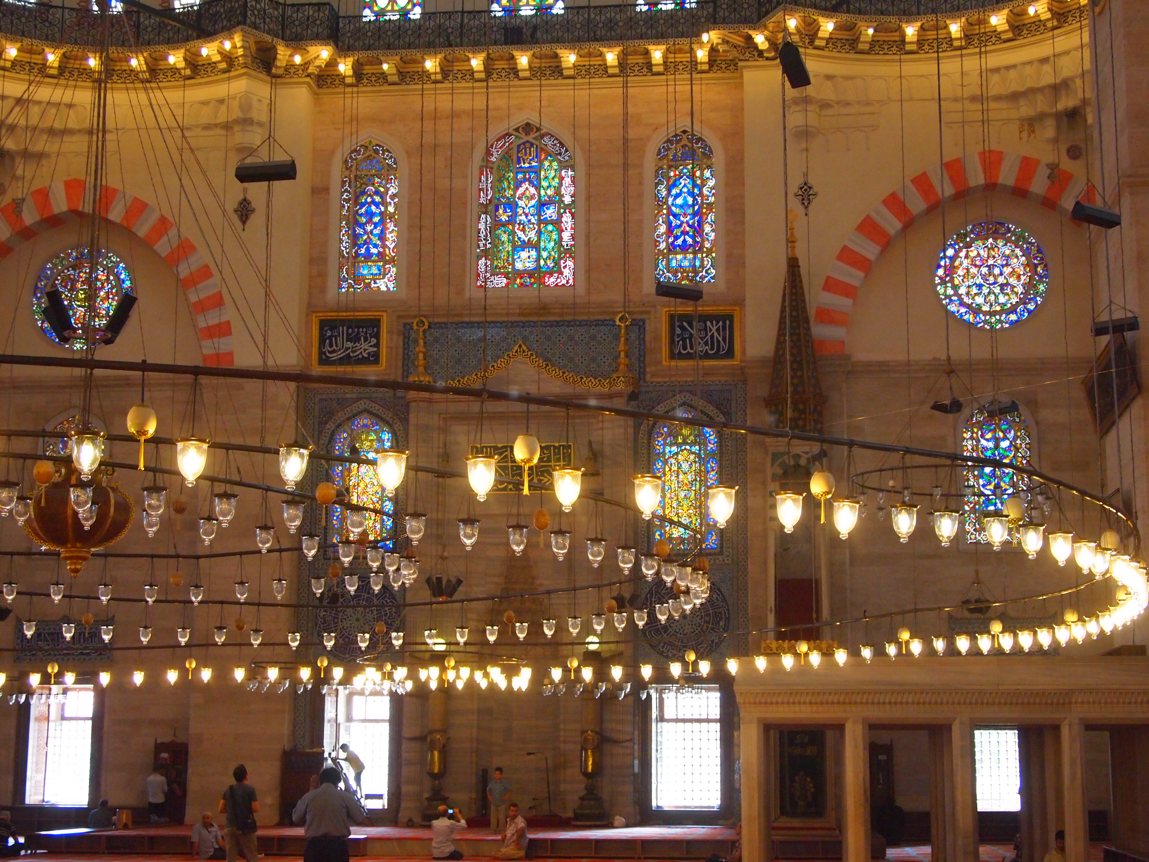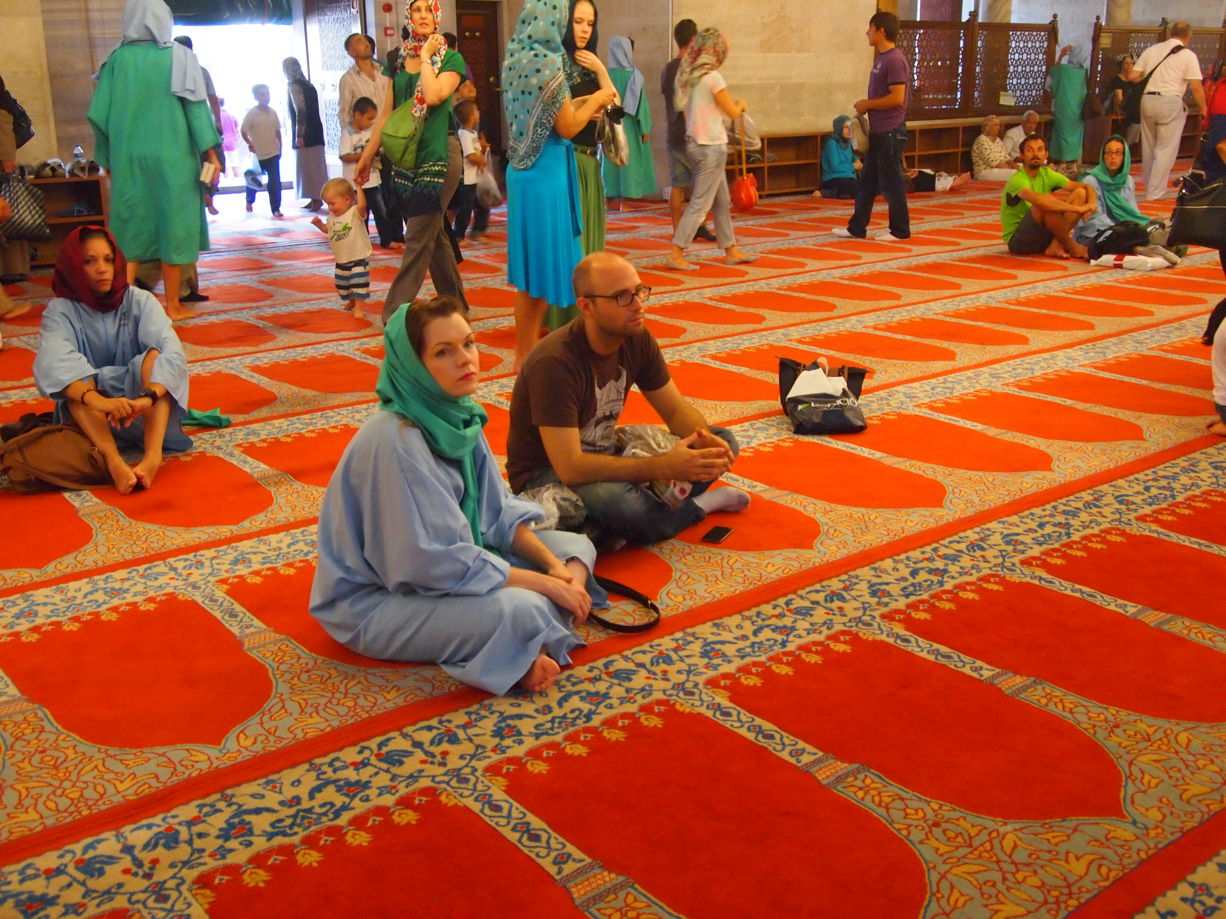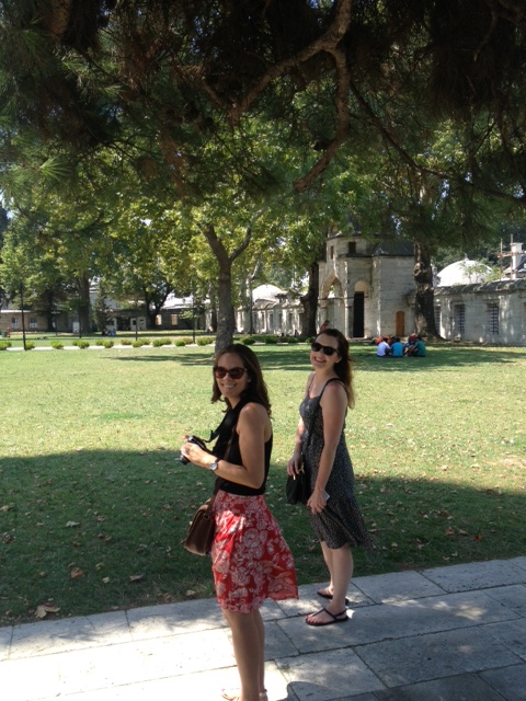 The walled green space surrounding the mosque lent an aire of serenity that we hadn’t experienced at the Sultanahmet Mosque (Blue Mosque). There were far fewer visitors as well and the entire atmosphere felt more reverent. Jenny and I decided not to wear mosque-appropriate clothing this time so we were given zip up dresses with attached headscarves to wear inside the mosque. The interior was certainly smaller than Sultanahmet, but was far grander. We took the opportunity to sit on the floor and bask in the grandeur. It was stunning. As the afternoon call to prayer approached we were asked to leave the mosque.