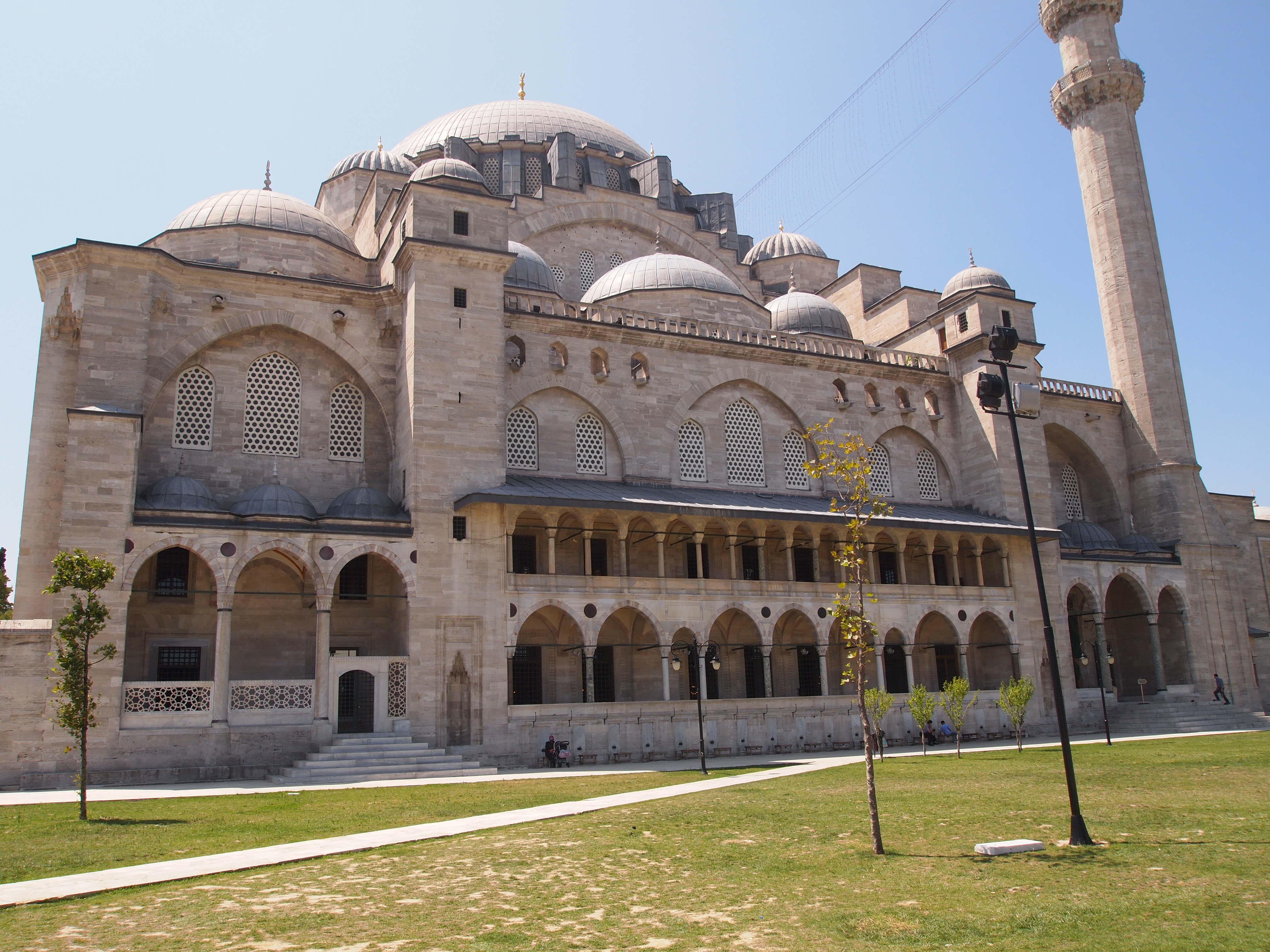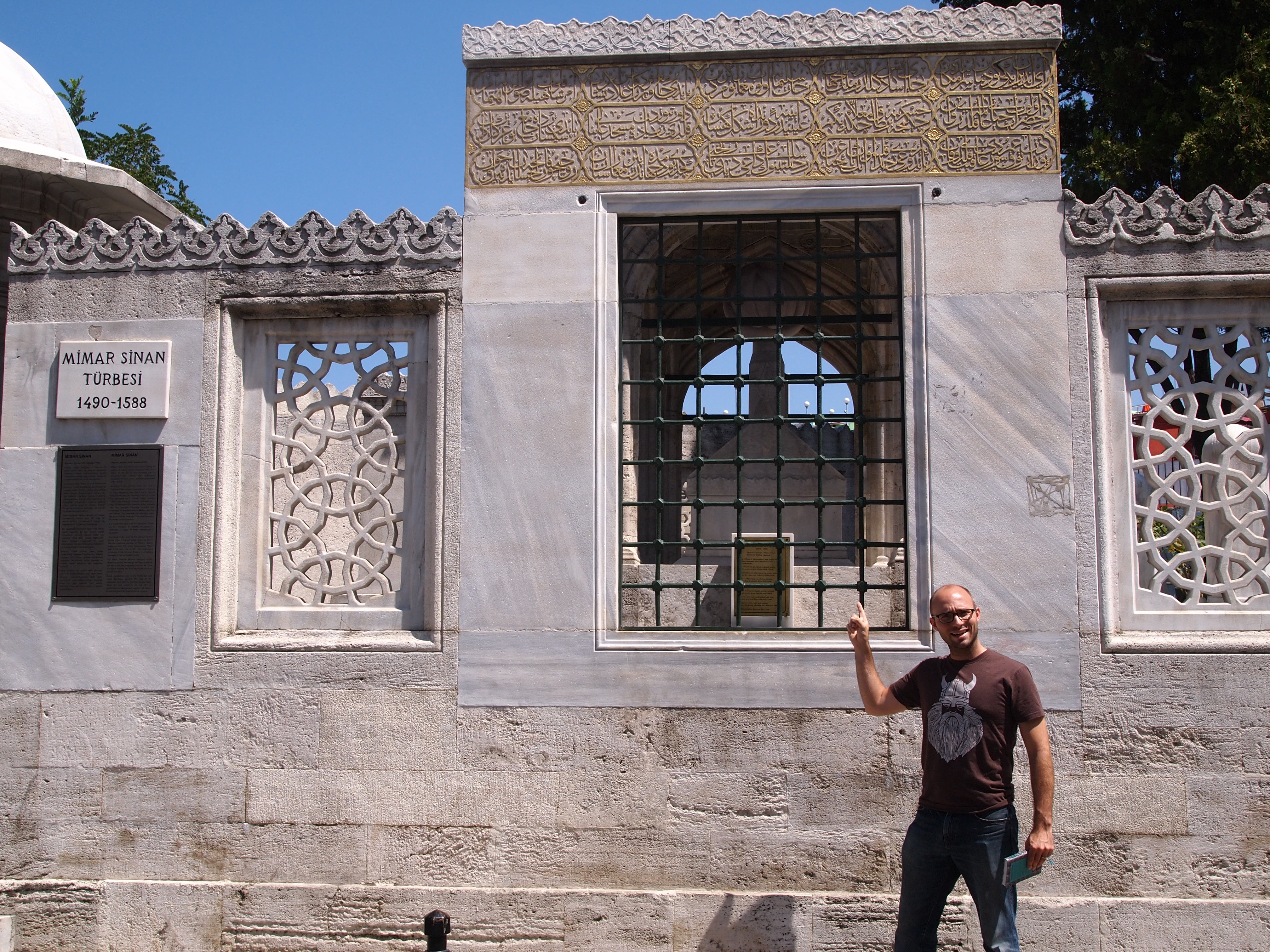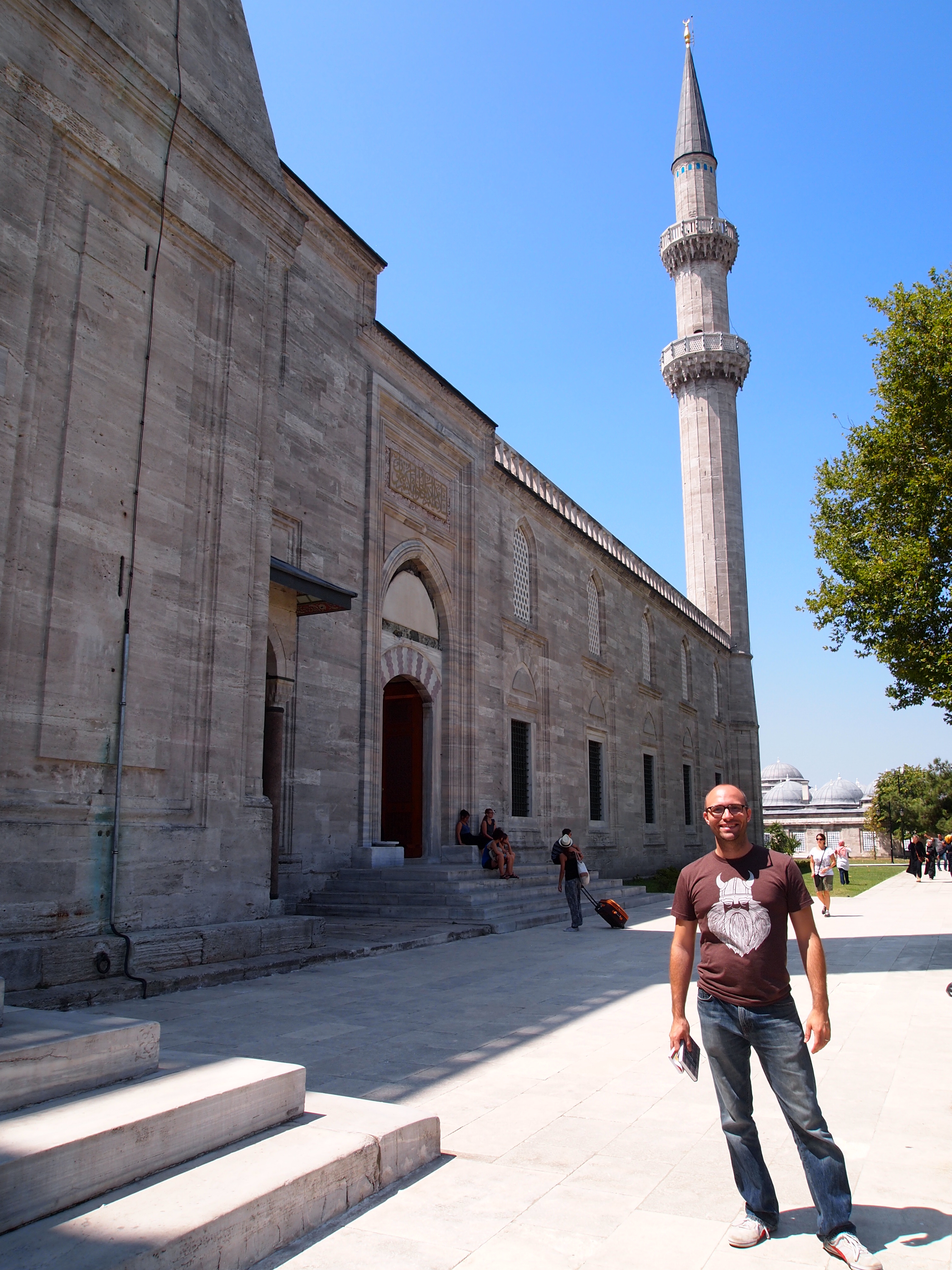 We wanted to see one more mosque before we left so we decided to visit Süleymaniye Mosque. It was commissioned by the richest and most powerful of the Ottoman sultans, Süleyman the Magnificent, and was designed by Mimar Sinan, Turkey’s most famous architect. Of the 321 buildings he designed in his lifetime, 85 are still standing in Istanbul. (The Ayasofya Hamami we visited was also designed by Sinan.) Sinan chose to be buried at the mosque and we passed his grave on our way to the entrance.