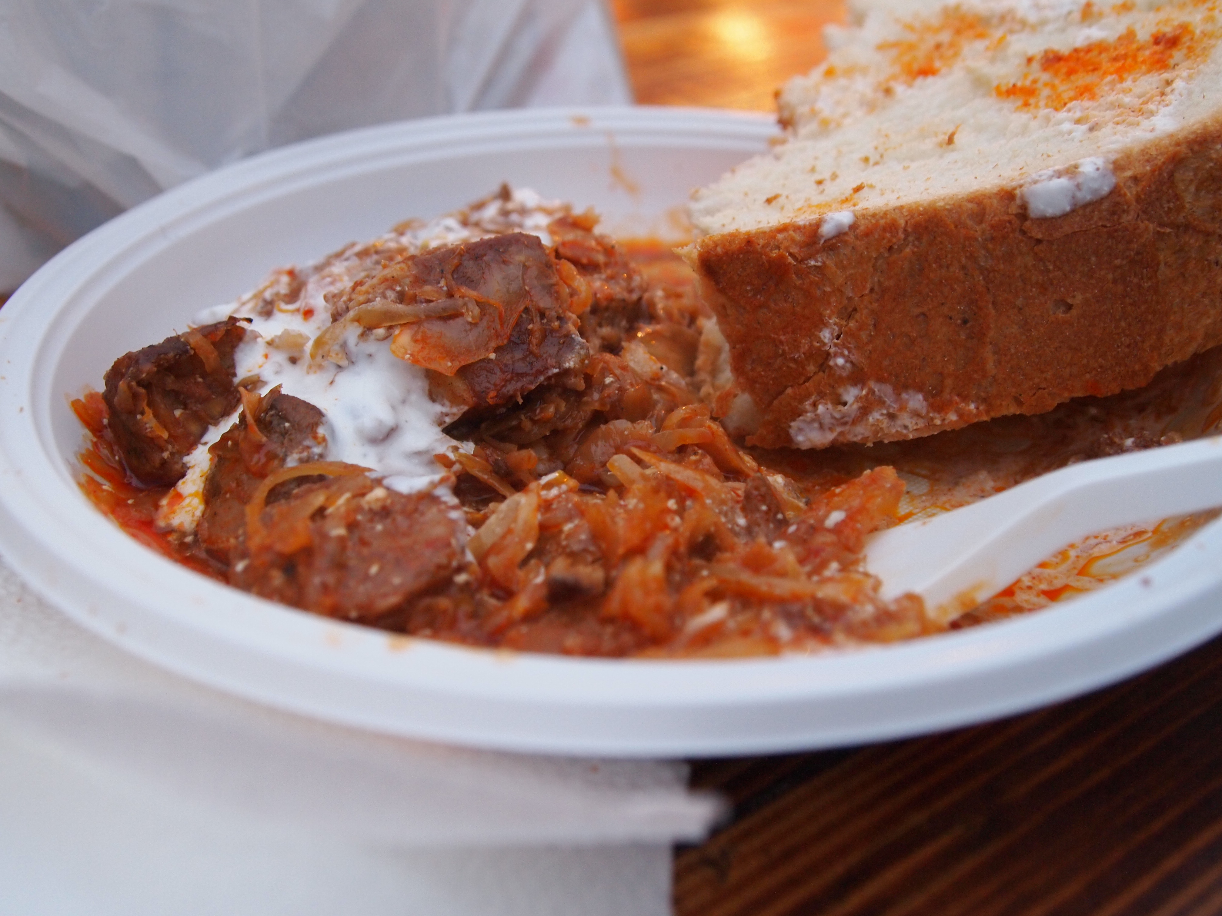 Following our tour of the cave church we were feeling pretty cold and in need of some mulled wine so we decided to venture over to the Christmas Market in Vörösmarty Square. It was wonderful! We walked around with our hot wine, perusing craft and food stalls, listening to Christmas music all while freezing our butts off! We bought a couple things and then sat down with more wine and a piping hot sauerkraut stew. I’m not really sure quite what it was, but it was exceptional. There was sauerkraut, there was sausage, another meat, and a sauce – it warmed us right up.