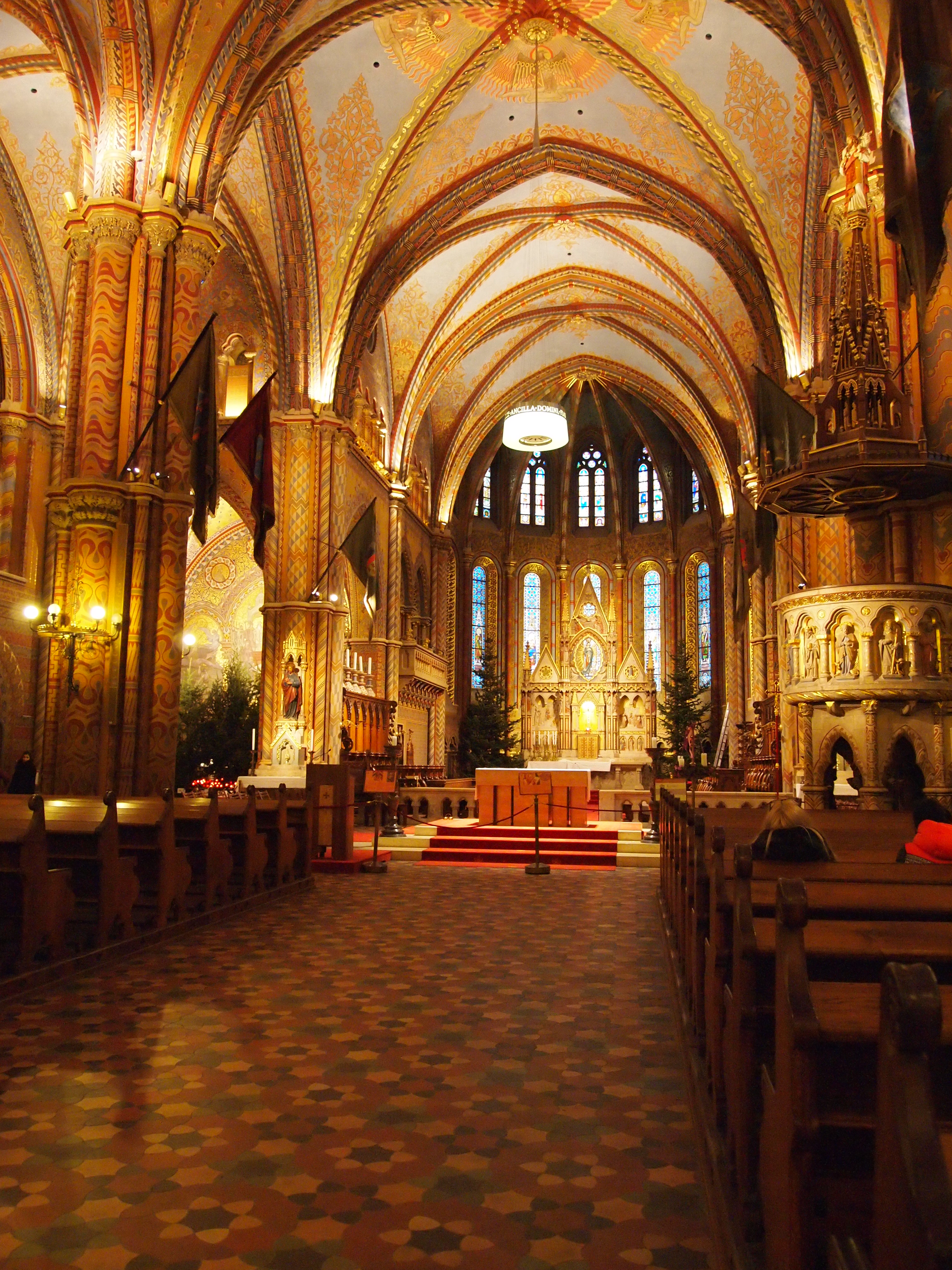 Once in Buda we took a funicular up to the Royal Palace and surrounding area (Castle District). We chose to forgo the palace and instead walked up to St. Matthias Church, a gorgeous neo-Gothic structure topped with a dazzling multicolored tile roof. It is spectacular. And the interior, which took me by surprise, is just as beautiful. The walls and ceiling are painted with different scenes and designs. The colors aren’t bright so sitting inside was calming and comforting. It really does give off a feeling of refuge from the outside world.
