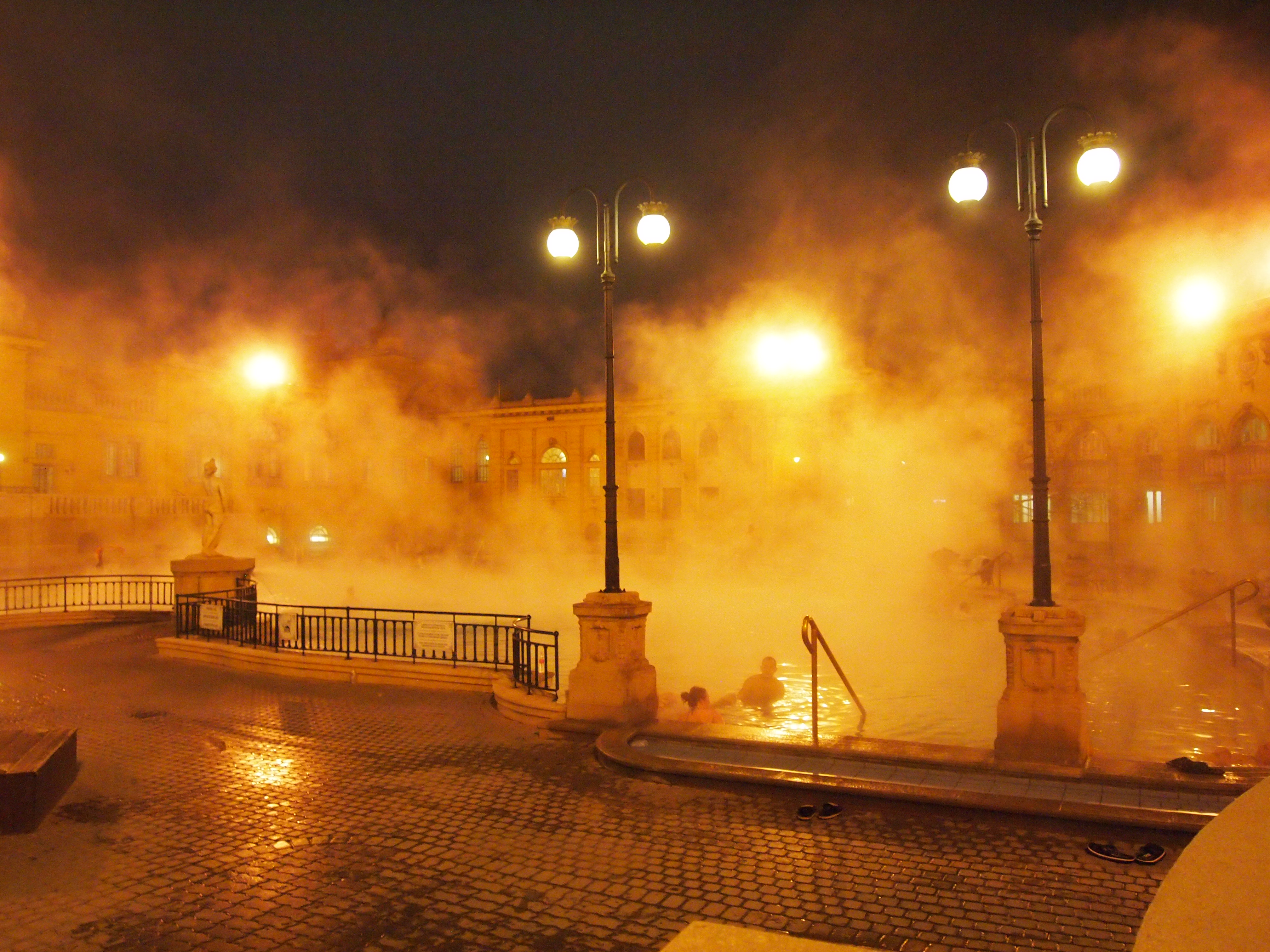 After watching some of the live music we decided to thoroughly warm ourselves by going to the thermal bath. There are a few in the city, but we chose Széchenyi which is in Városliget (City Park). It was a little confusing at first. The main entrance was closing in a hour when we arrived and we couldn’t find anyone to help us (we had seen online that the baths were open later). Finally someone told us to walk around to the back and there we could access the pools until 10. Once we made it back there we paid and were given “watches” to access our lockers and enter the spa area. The locker rooms are gender specific so after splitting up we each put our belongings in a locker, changed into our swimsuits, and met in the hallway. We rented towels and then went up to the outdoor pools. There’s nothing quite like walking outside in 30 degree (F) temperatures in just a swim suit and a towel. BRRRRR. We quickly set our towels on a bench and high-tailed it into the pool. It was glorious. I think we stayed in the pool for about 1.5 hours before getting out to shower and change. The steam rolled off the pool all around us, sometimes getting so thick we could hardly see in front of us. It was beautiful. And warm.