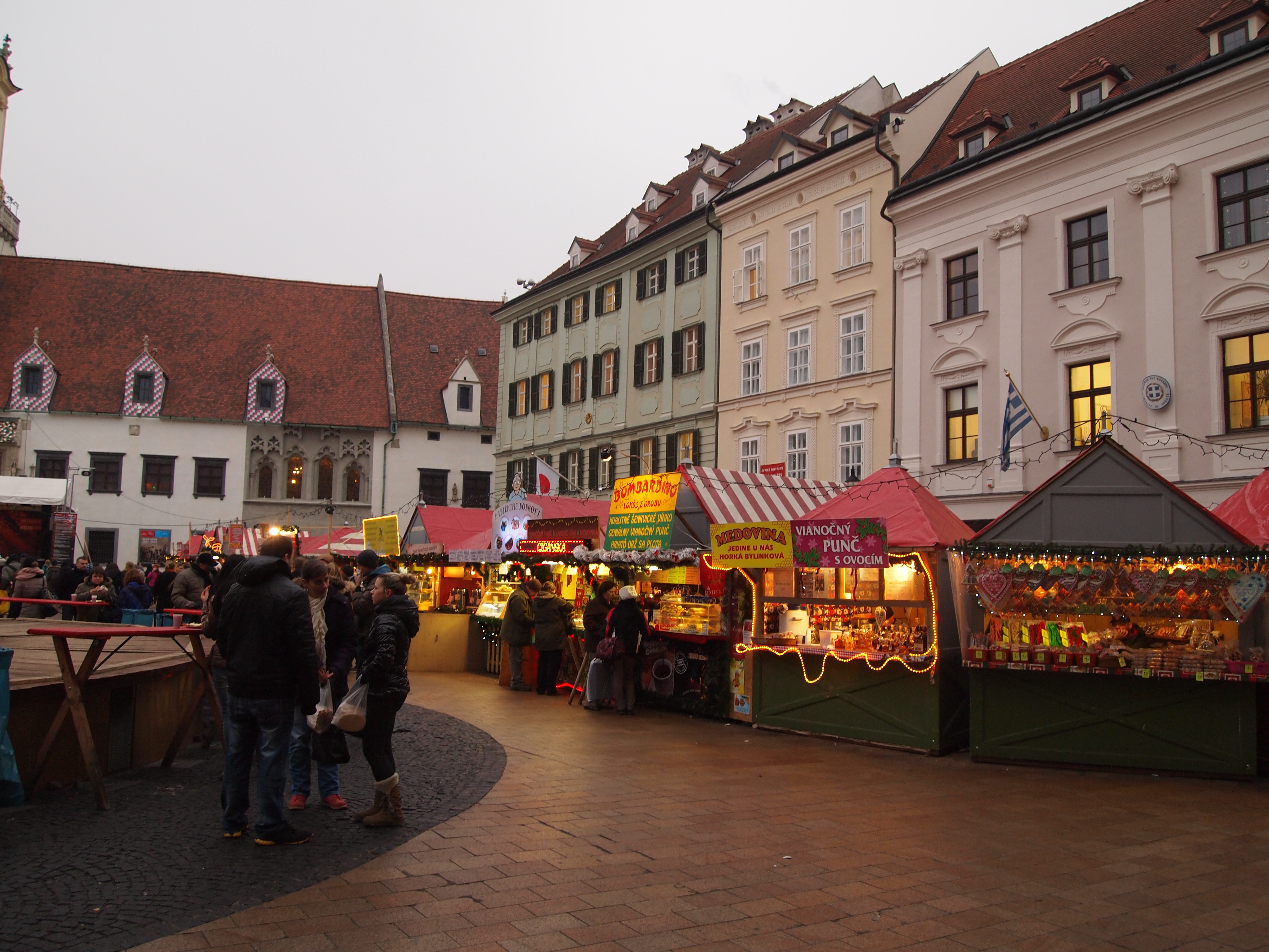 After heading back out into the cold we tried to visit a couple of museums that we had read about; unfortunately our late arrival caused us to miss the last tours in both the Clock Museum and Hummel Museum. So instead we went to the Christmas Market and indulged in a few different types of mulled wine – a white wine, honey wine, and red wine and bought some gifts for others and ourselves. We also ate some type of nutella pastry – kind of like a crepe, but rolled up and drizzled with nutella. We walked slightly further to another square where the market continued and then up to St. Martin’s Cathedral. Directly in front of the cathedral is a highway which was designed during Slovakia’s communist days. When Bratislava was the capital of Hungary (while the Ottomans occupied Budapest) 19 Hungarian kings and queens were crowned in the cathedral. Unfortunately it was already too late for us to go inside and take a look around. Plus we had decided to catch the 6:43 train to Vienna so we needed to get back to the train station.