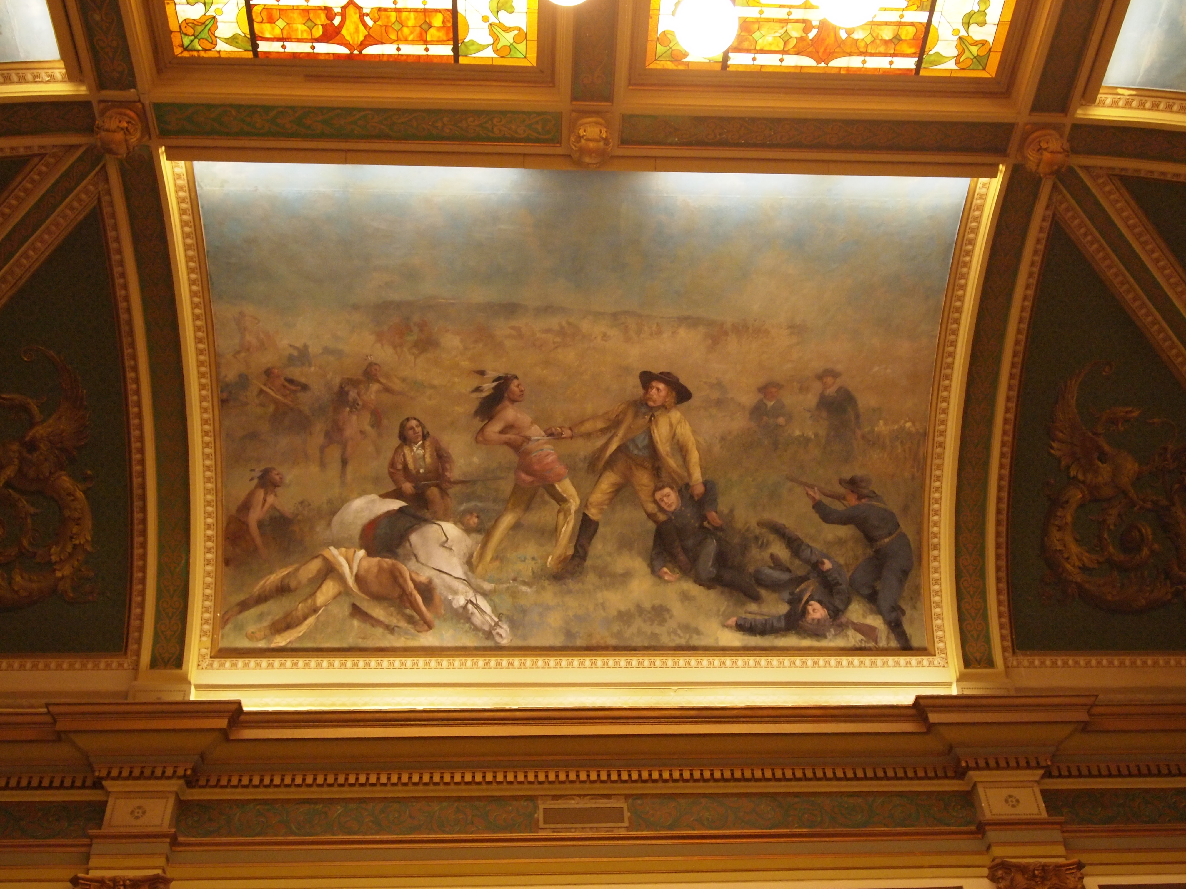 We stopped first at the Capitol and took a tour. We were the only two people on it for most of the tour. Their Capitol was finished in 1902 and later expanded in 1912 to accommodate their growing legislature. The original part of the Capitol is sandstone and the extension is Montana granite. Like the Texas Capitol, the building underwent a renovation in the early 2000s to restore its interior to its original appearance. It’s a lovely building and the stained glass is phenomenal. We learned a bit about some of the historical figures in Montana’s history and about their legislative process which is also part-time (though their sessions are shorter).