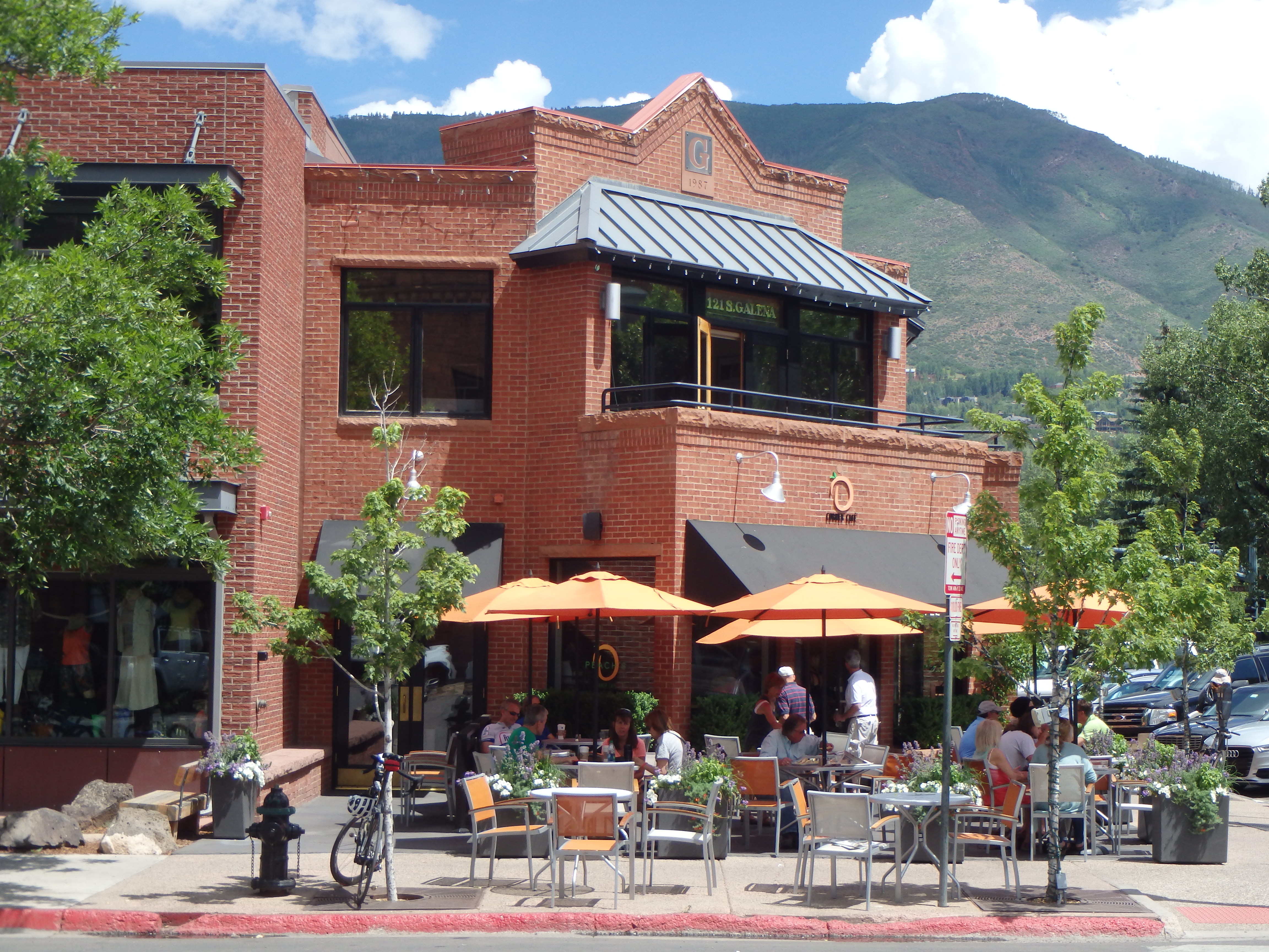 This morning we left Glenwood Springs and went to Aspen for breakfast. Wow. Aspen is a very tidy town. All of the homes have landscaped lawns and patios, the downtown district has recycling bins, and beautiful hanging baskets of overflowing flowers. Zach chose a café for breakfast – Peach’s Corner Café. It was cute. We had a nice breakfast there and then walked around the town a little bit.