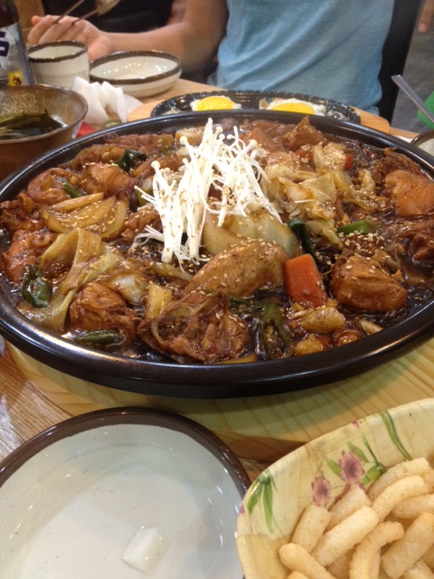 We were very fortunate to catch a cab from Jusangjeolli – until we got in and the driver didn’t understand where to take us! We have David’s address written in Korean and Zach pulled it up on a map but he ended up dropping us off in the center of town. So we walked the rest of the way and were quite tired. We showered and rested a little bit before meeting up with David, his girlfriend, and her daughter for some dinner nearby. Dinner was excellent – sorry, we forgot what it was! – and now we’re discussing our plans for our final full day on Jeju.
