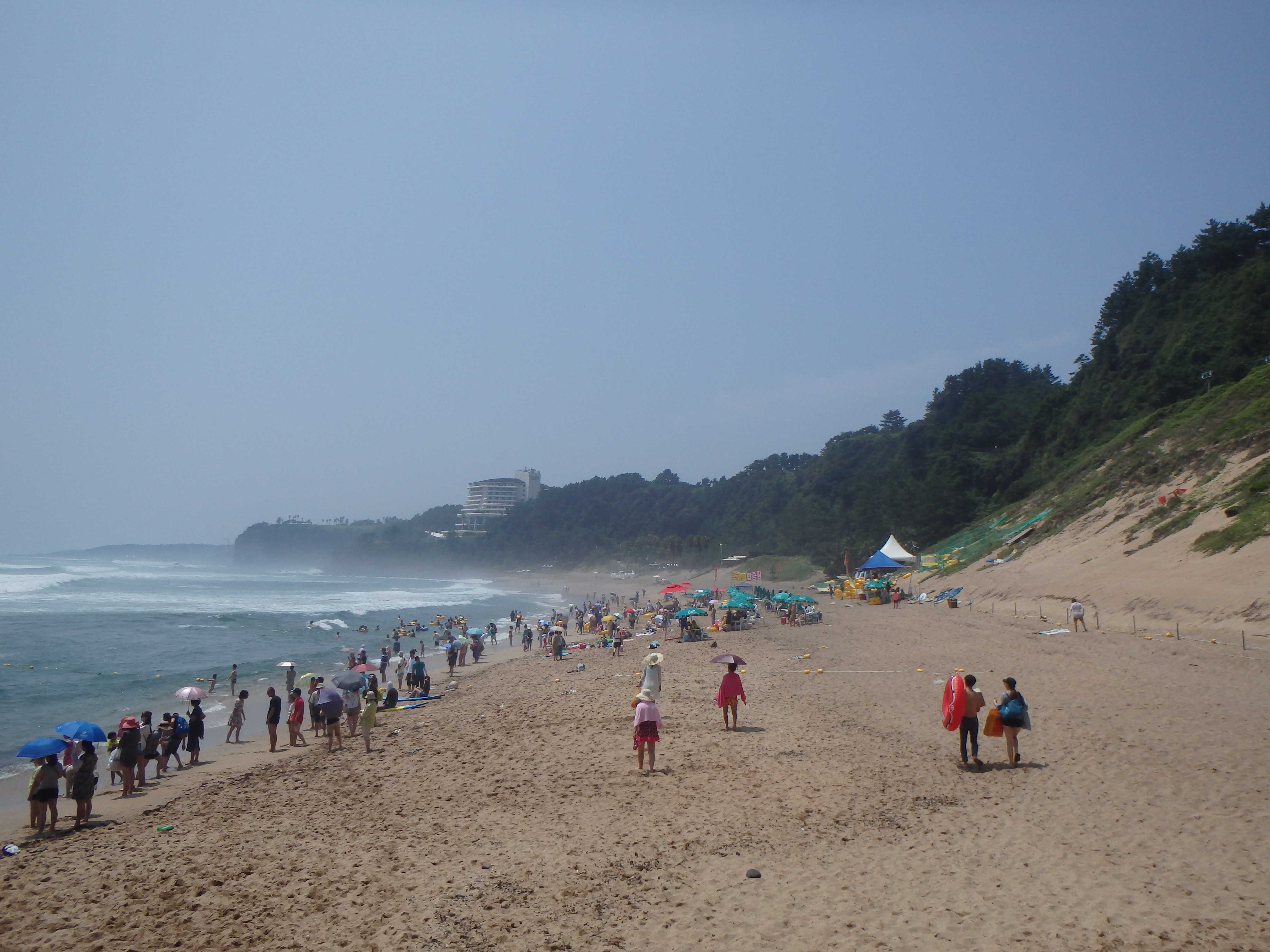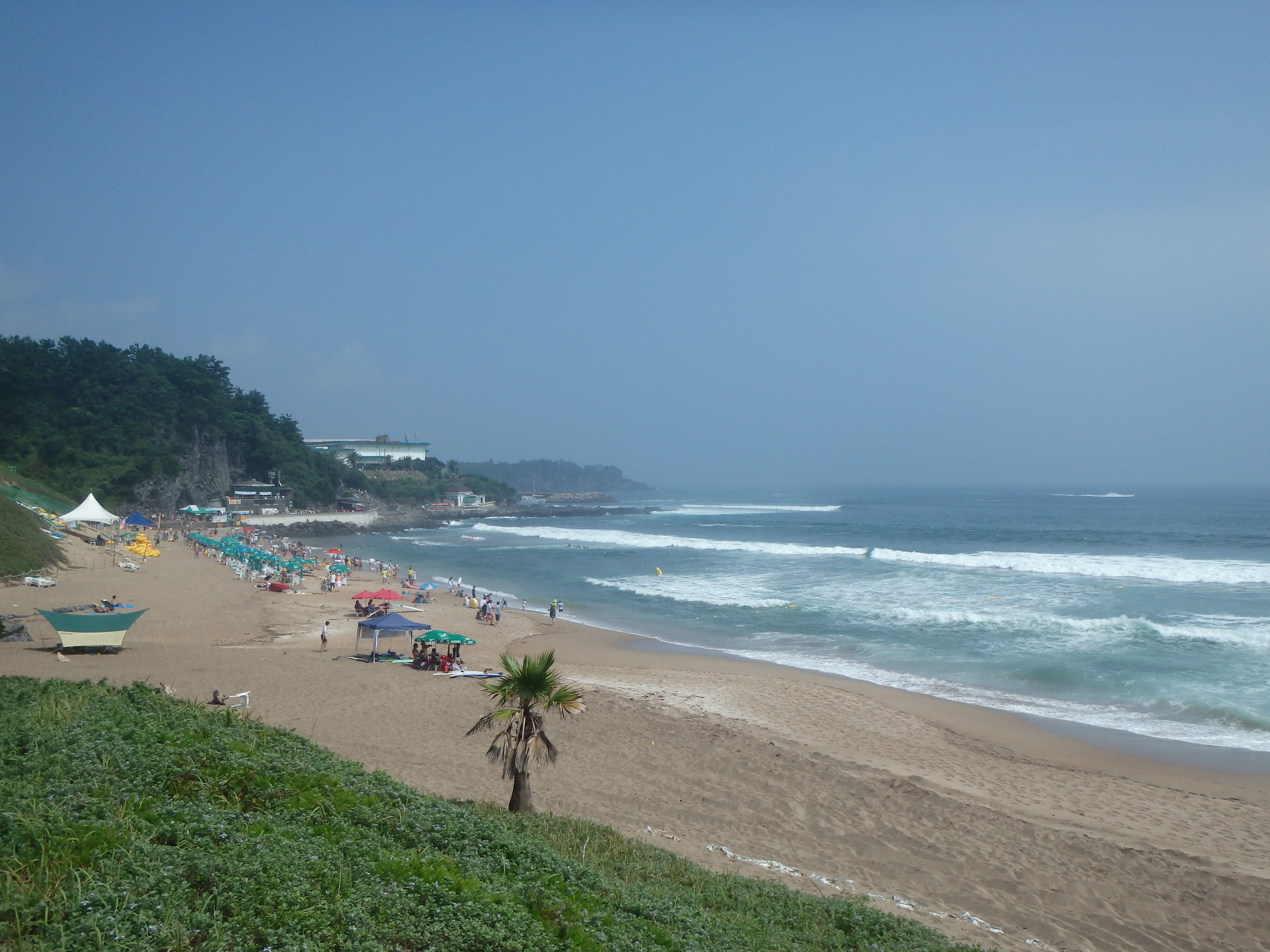 We took a bus over to the Jungmun Resort area which has a lot of hotels, stores, strange museums (Teddy Bear Museum, Museum of African Art, Ripley’s Believe It or Not), and a nice beach. We have been lucky because there were back-to-back typhoons in this area and we think a lot of people may have cancelled their trips. So the weather has been great – maybe a little too sunny – and the crowds have been minimal by Asian standards. The beach was fairly uncrowded so we were able to get a nice spot on the edge of the swimming area. Unfortunately, the umbrellas and chairs were more than we were willing to spend ($40) so we just had to rough it with our towels and rain umbrellas. The beach was pretty and we could cool down without getting all the way in! The waves came up to the shore and drenched us a couple of times as we were trying to get in. We stayed out for a about an hour and a half and then decided to pack up.