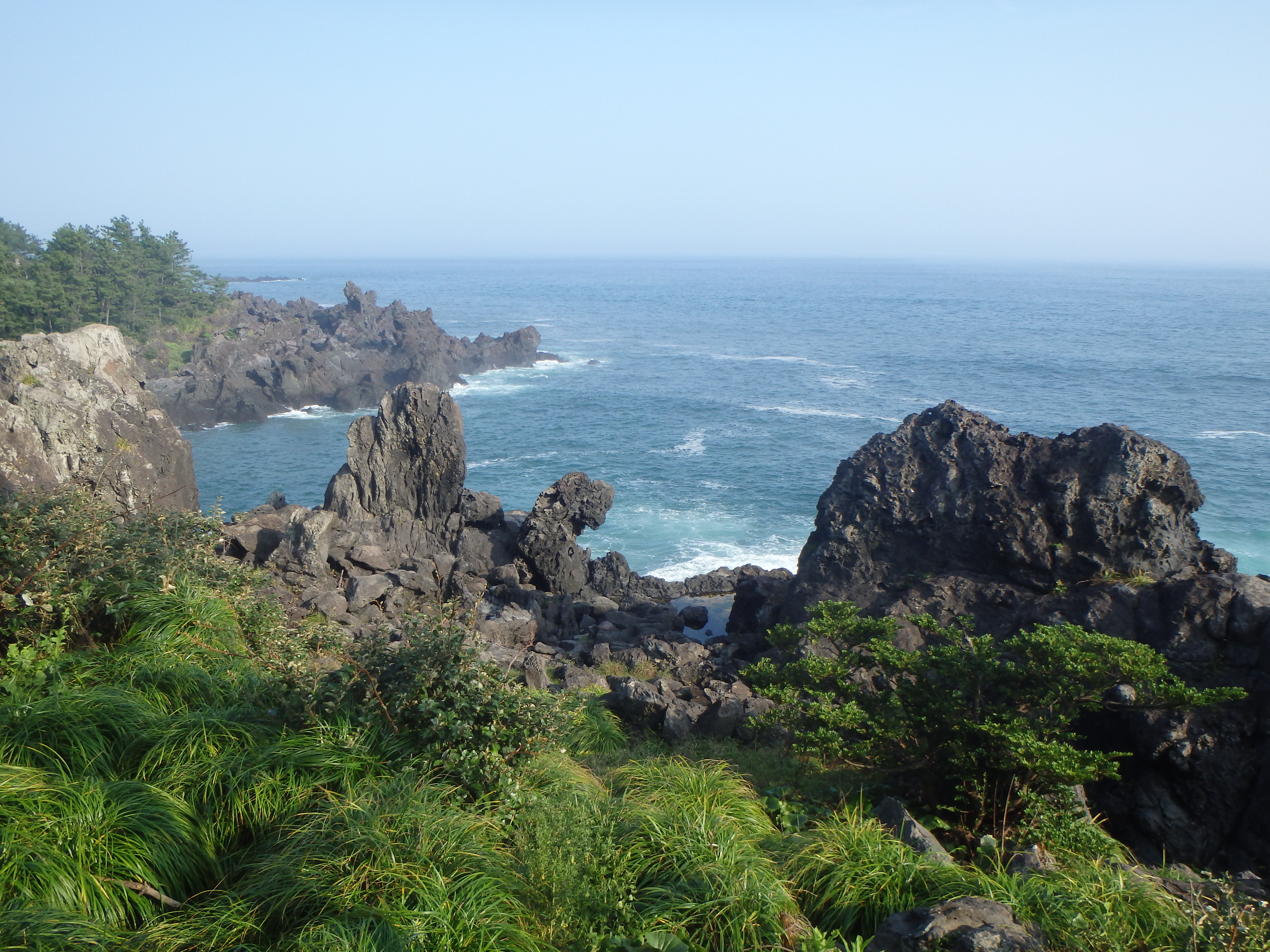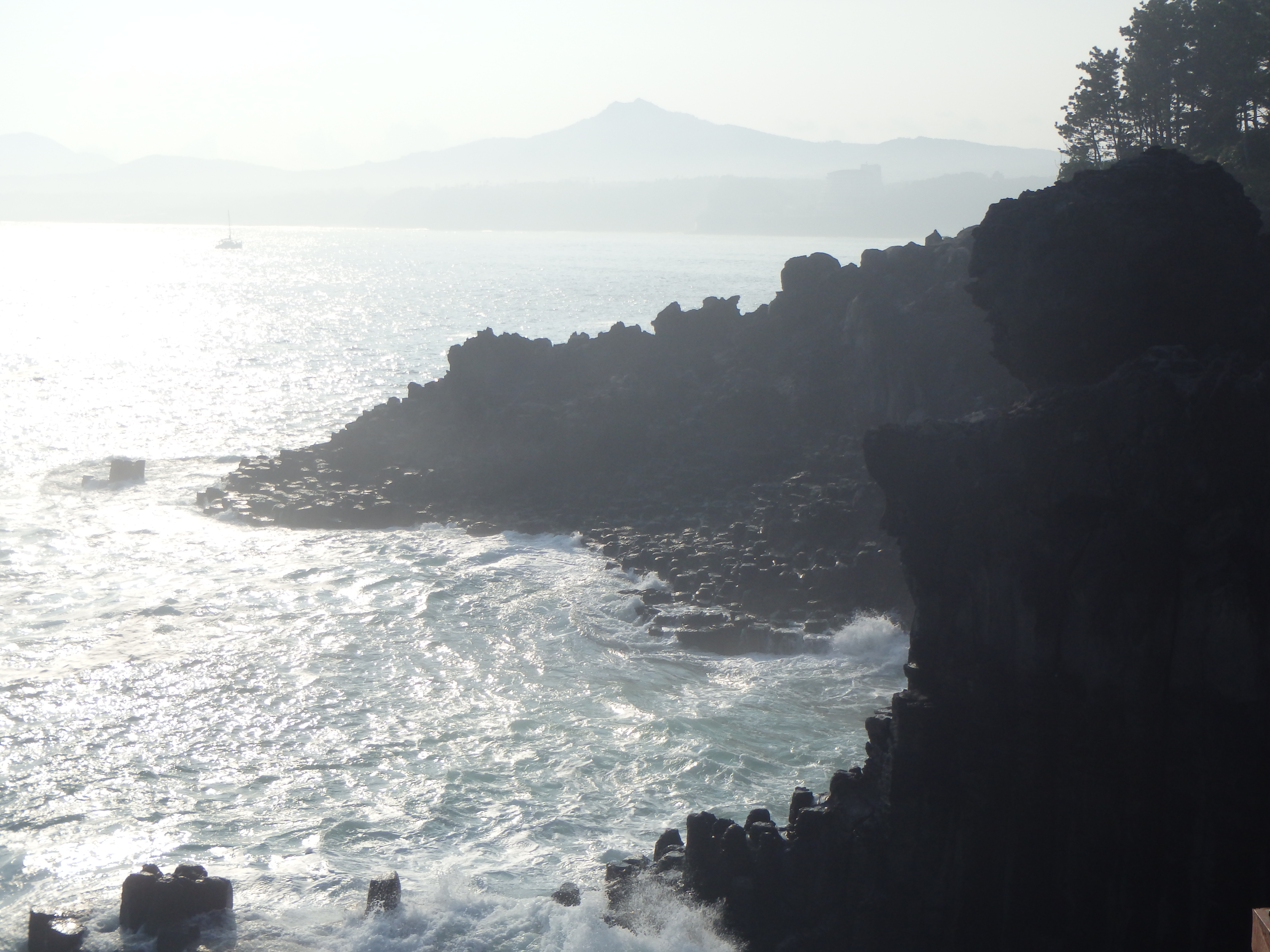 We caught a cab at the Hyatt to go see one last thing on this side of the island – Jusangjeolli Rocks. The Jusangjeolli Rocks are really cool, but are a major tourist attraction – too big of a tourist attraction in my opinion. It costs roughly $2 just to look at them. The rocks – really a stretch of coastline – were formed when lava flowed into the sea and cooled rapidly forming perfect hexagonal columns of rock. It reminded me of the Giant’s Causeway in Northern Ireland. I thought it was beautiful, but unfortunately the sun was right in our faces and there were busloads of Chinese tourists when we went. Oh well.