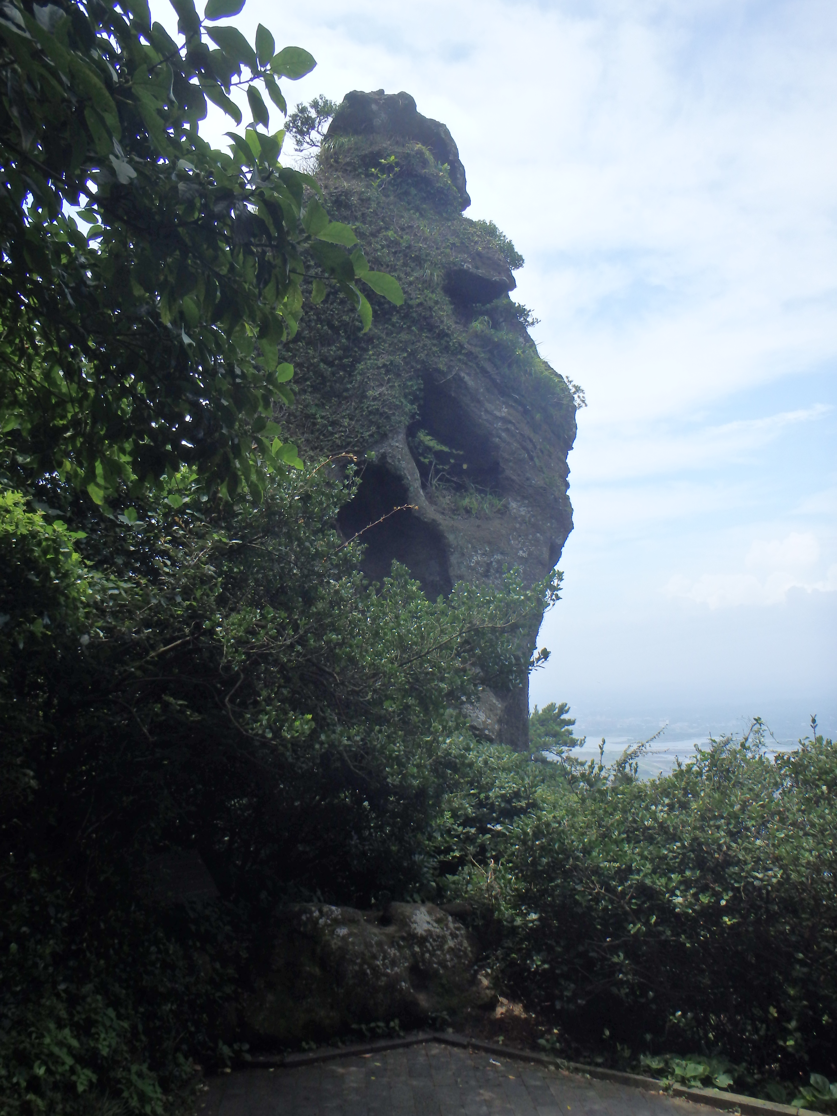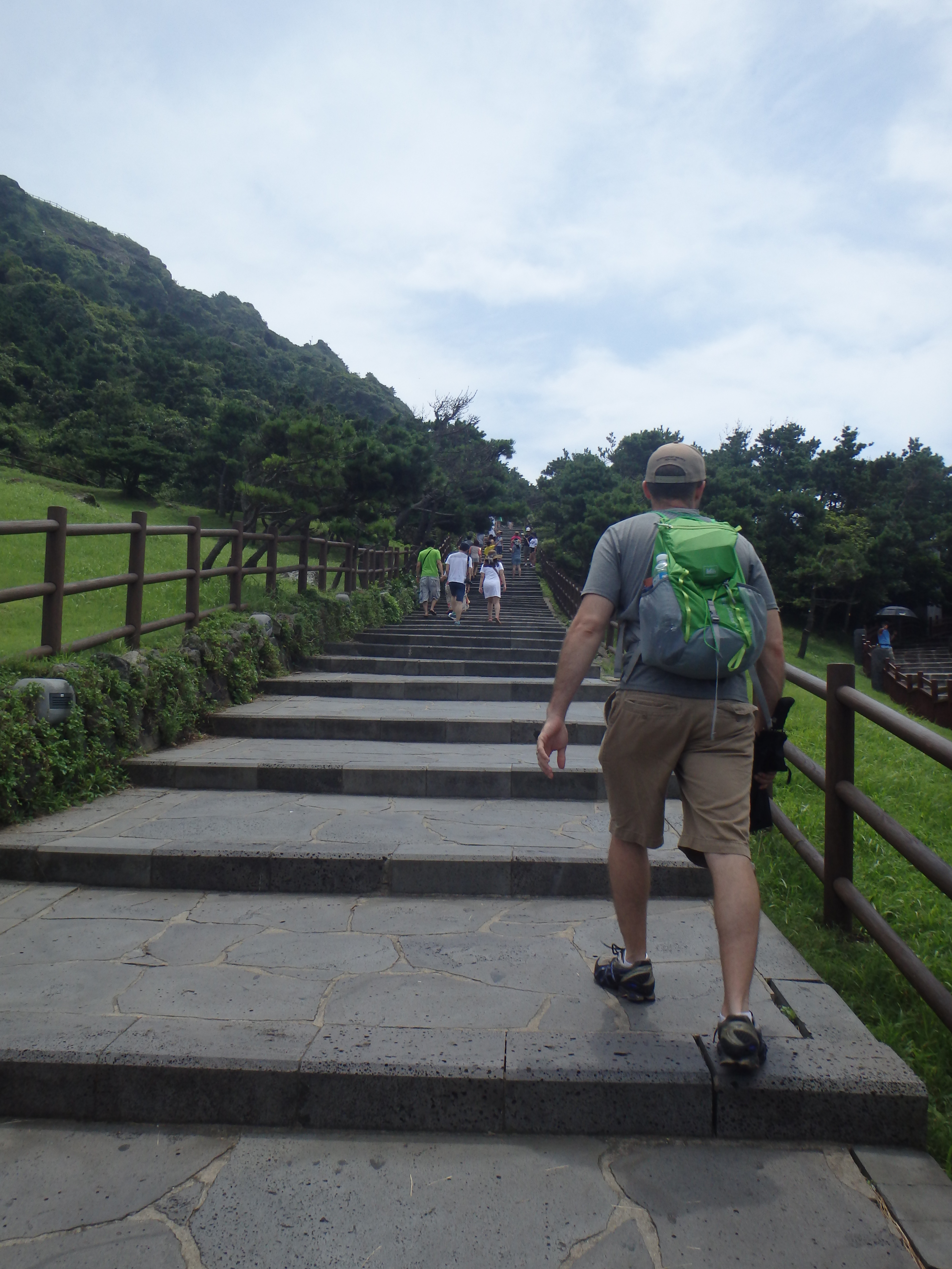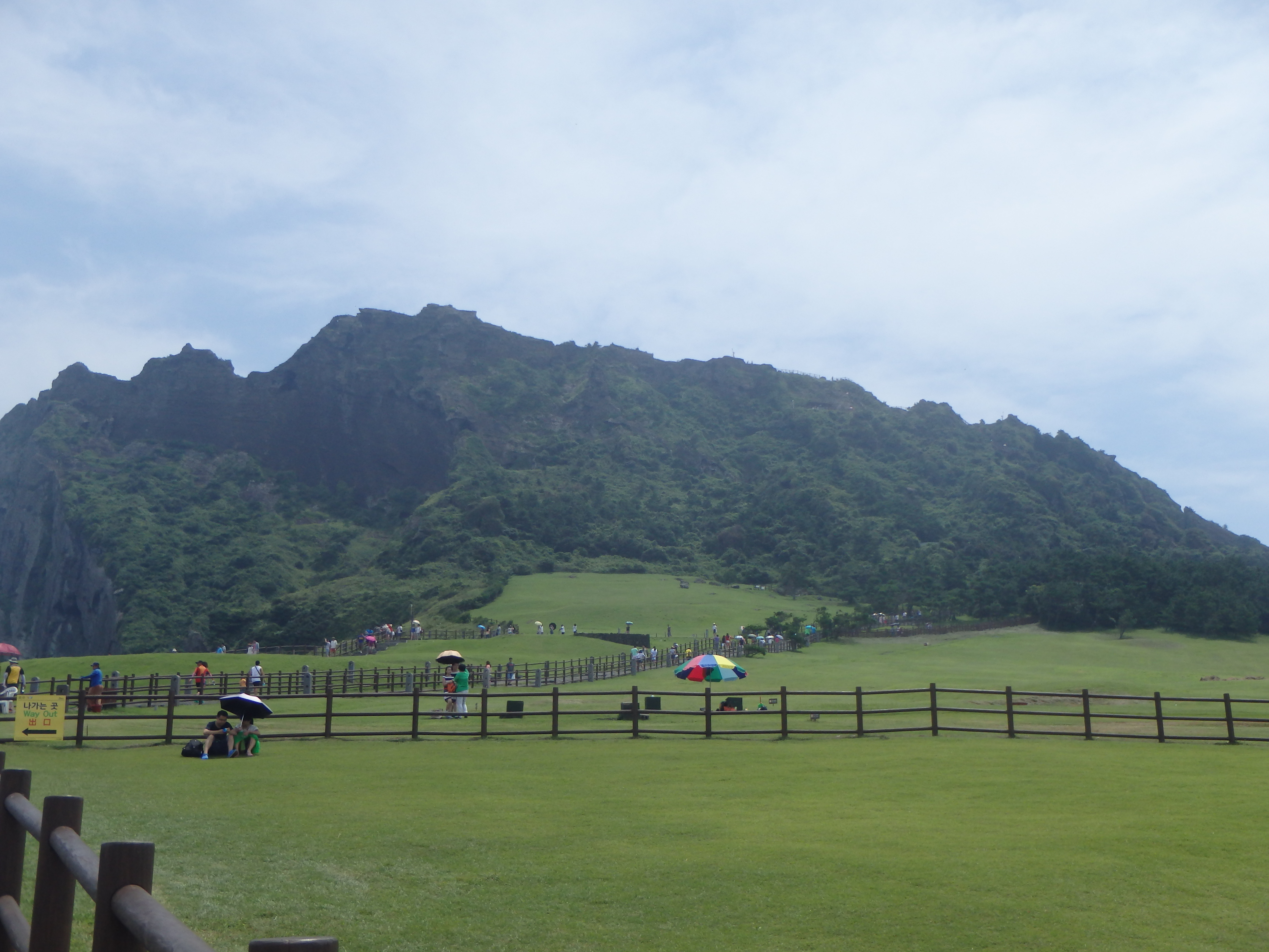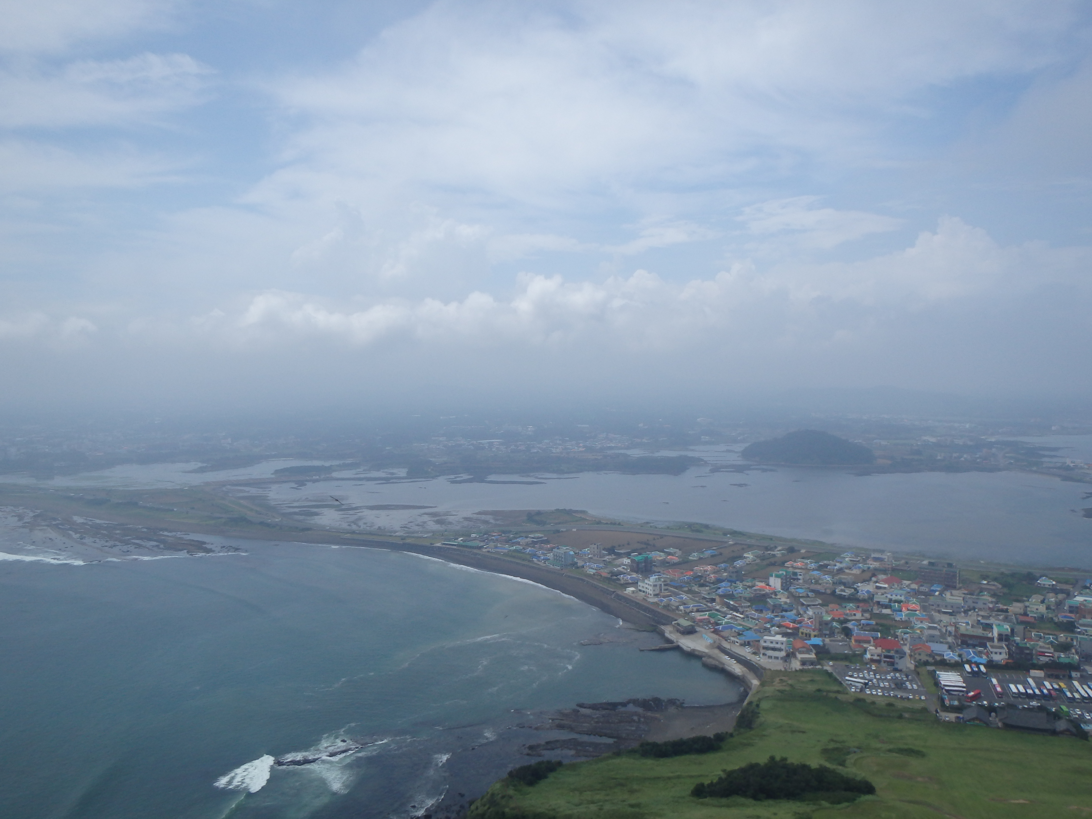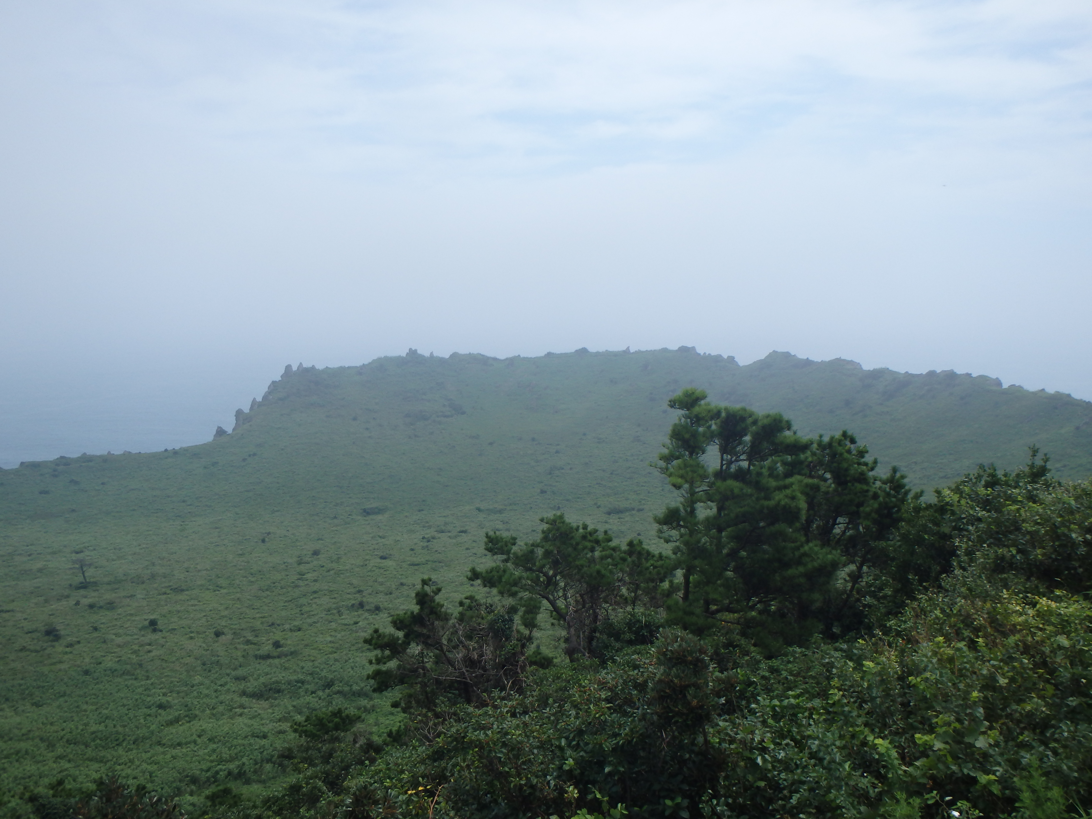 Once we reached the top, sweat running down our bodies and panting, there was a nice long viewing deck on the northwest end. We had great views of Seongsan below and the crater itself. It was quite sunny out, but as you can see in my photos, still a bit hazy.