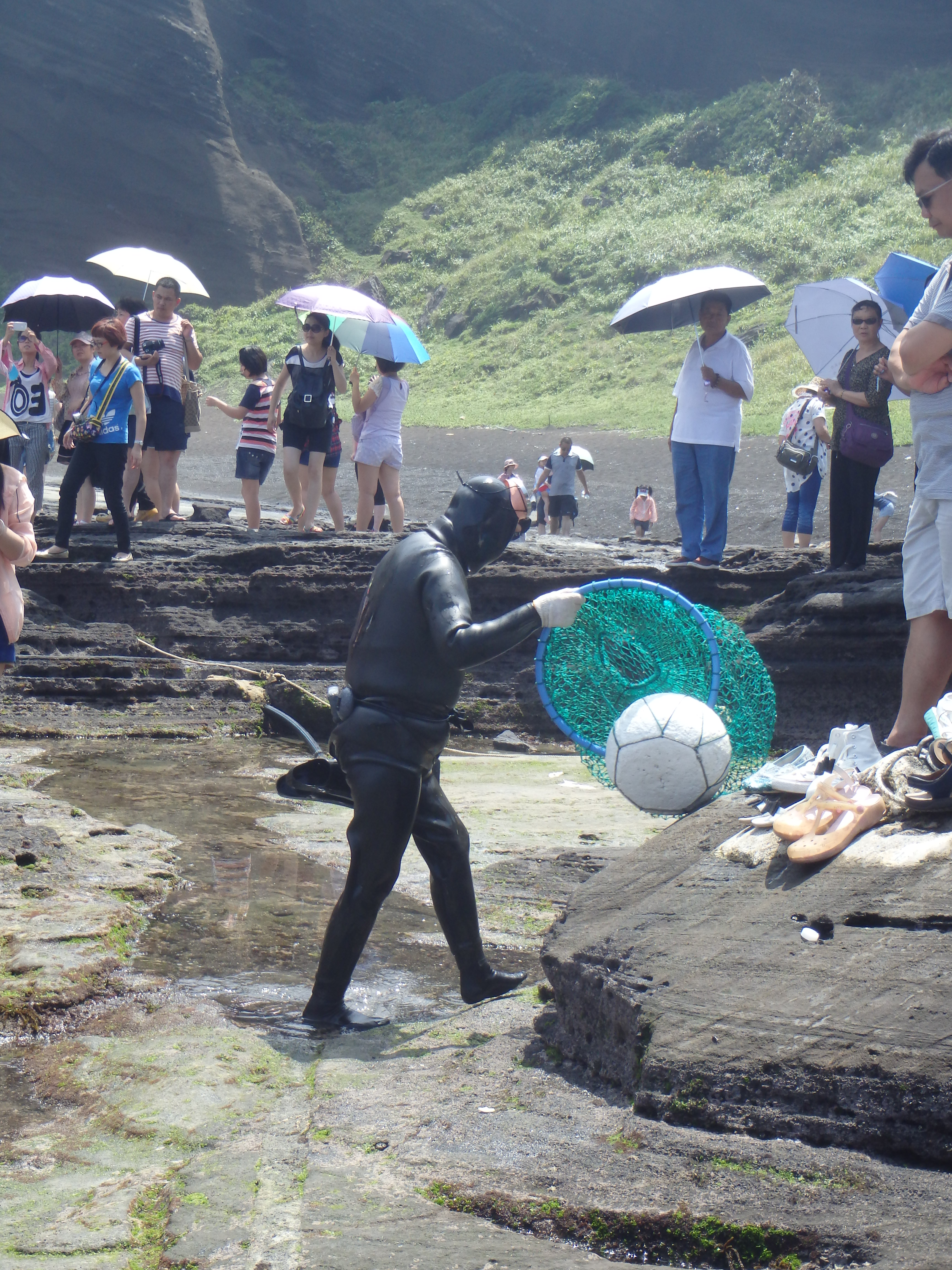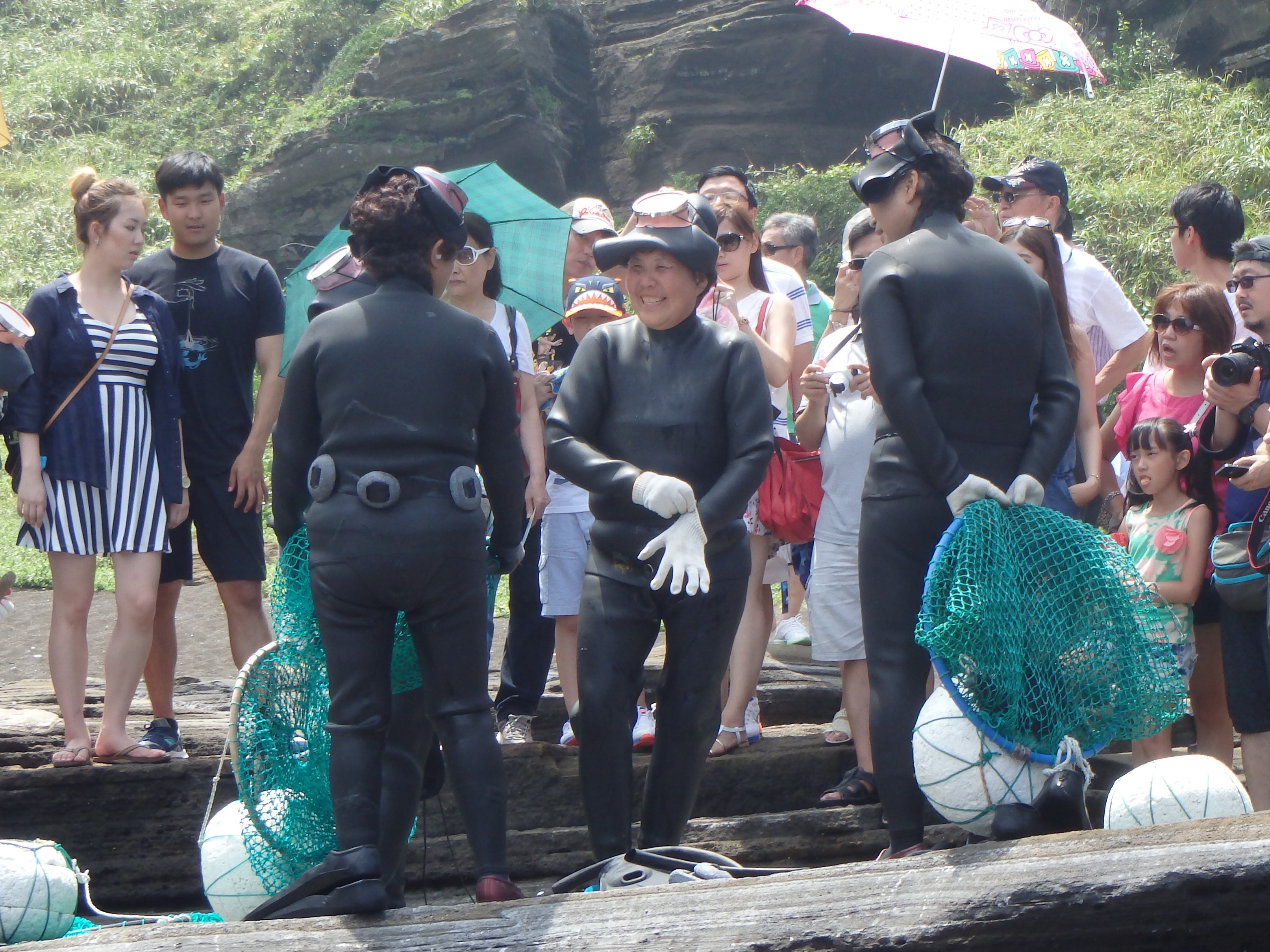 The haenyeo dive next to Seongsan Ilchulbong in the morning and then they do two performances in the afternoon for the tourists. We weren’t sure what a “performance” entailed so we went down to check it out. Basically, they sing and do a dance and then they dive. It’s just a show for the tourists but I’m glad we got to see it anyway.