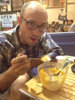 I realized after I published the previous post that I forgot to talk about bing su! We tried bing su (pronounced bingsoo) for the first time at our favorite neighborhood coffee shop, ToPresso. Bing su is a Korean summer treat made with shaved ice, condensed milk, and usually fruit syrup and chopped fruit. There are several variations. The most popular is red bean, but we’ve seen all sorts of bing su – green tea, chocolate brownie, and coffee. All the bing su we’ve seen has been in gigantic portion sizes. We opted for the mango and we split it between the two of us. It was really delicious! Next time I definitely want to try the chocolate brownie one.