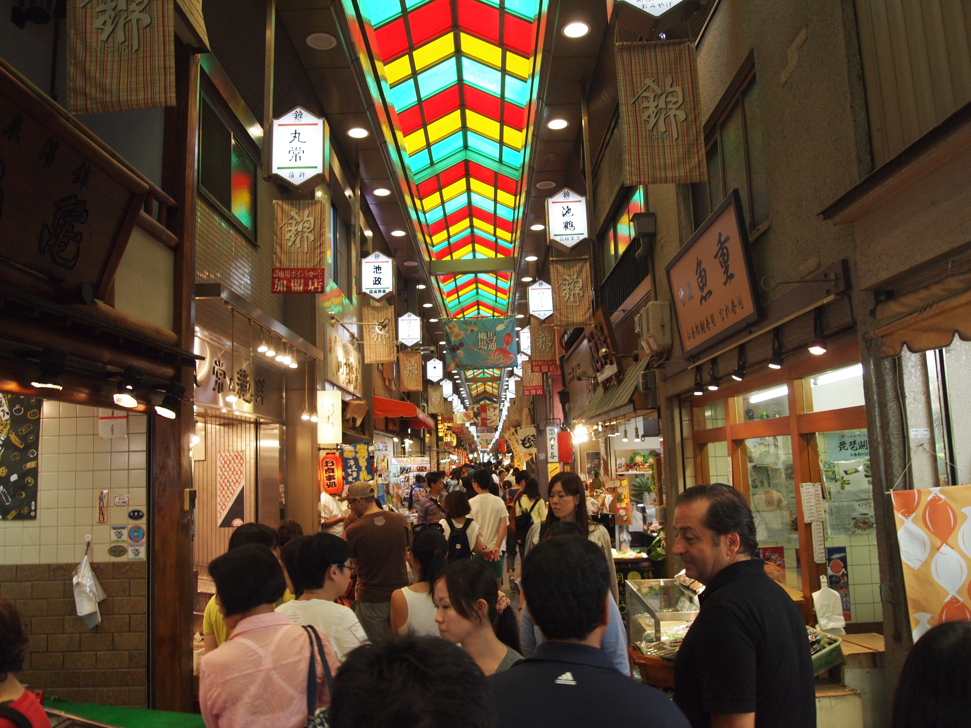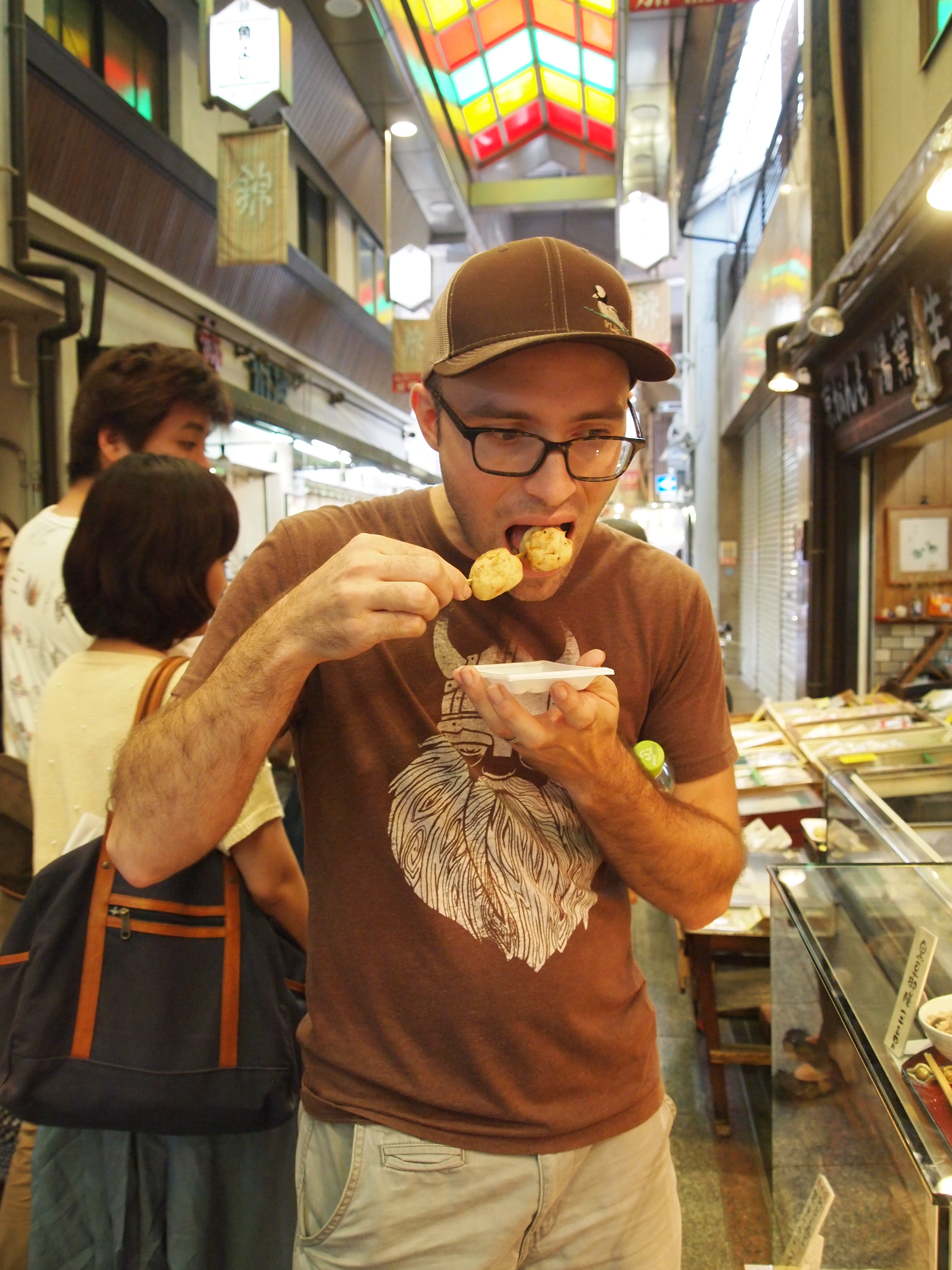 Zach wanted to check out the Nishiki Market so we went there next. Nishiki has been a retail market since the end of the Edo Period (1868) and was a wholesale fish market before that (1600-1868). However, some even believe that stores were on the same site as early as the 14th century. Nishiki’s center walkway is extremely narrow and it was pretty difficult to leisurely walk through. There was definitely a little of everything!