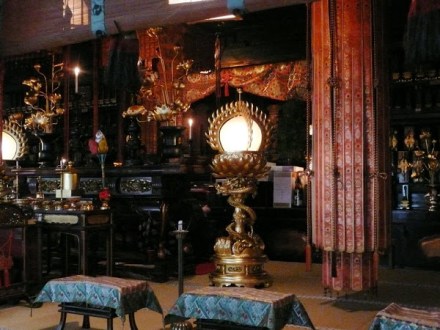 The room itself was long and deep. It was dark at the rear and you could occasionally see the smoke billowing up from a stick of incense. We were seated against the back wall of shōji (wood frames covered in translucent paper) which let in a nice amount of early morning sunlight. The room was draped in the rich tapestries you can see in the photo and there were a lot of gilded objects. There were only two monks and one was blocked from our view. However, we were able to see the head monk as he led the morning prayers. It was quite mesmerizing. If there had been a back to the bench we were seated on I would have eventually dozed off. It was all very measured. The chants were rhythmic and harmonious, and the head monk’s movements were deliberate yet delicate. He did everything with a precise grace.