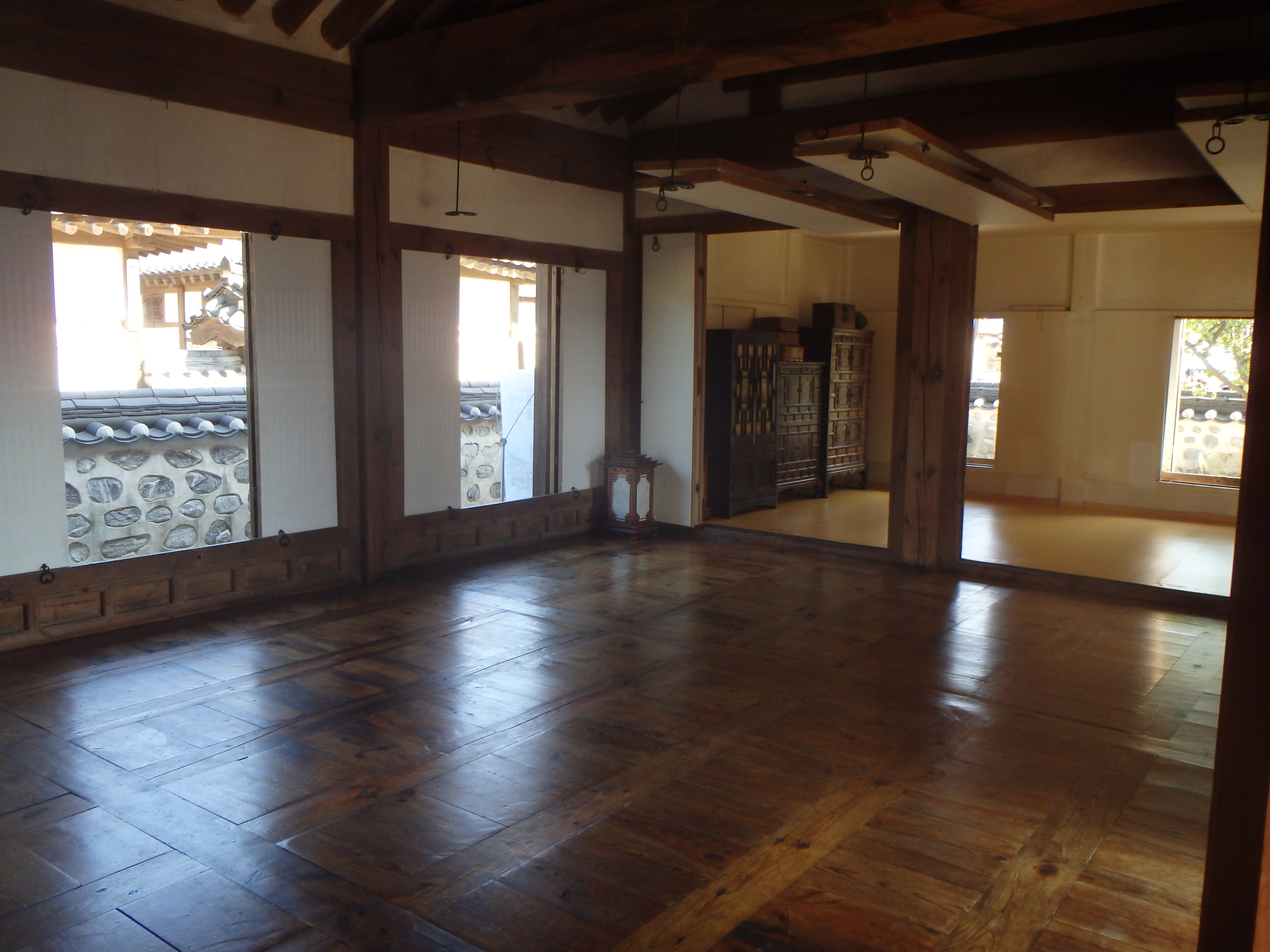 Hanoks are shaped according to their environment. In the northern part of the country where it is colder, hanoks are shaped like the Korean letter, ㅁ, and have a courtyard in the center with different parts of the house on each side of the rectangle. The house of Empress Sunjeong’s parents was built like this. In the southern part of the country, hanoks were built in a single line like the Korean letter, ㅣ, with lots of windows and high ceilings. In the central part of the country, the northern and southern styles converged to create a shape like the Korean letter, ㄴ.