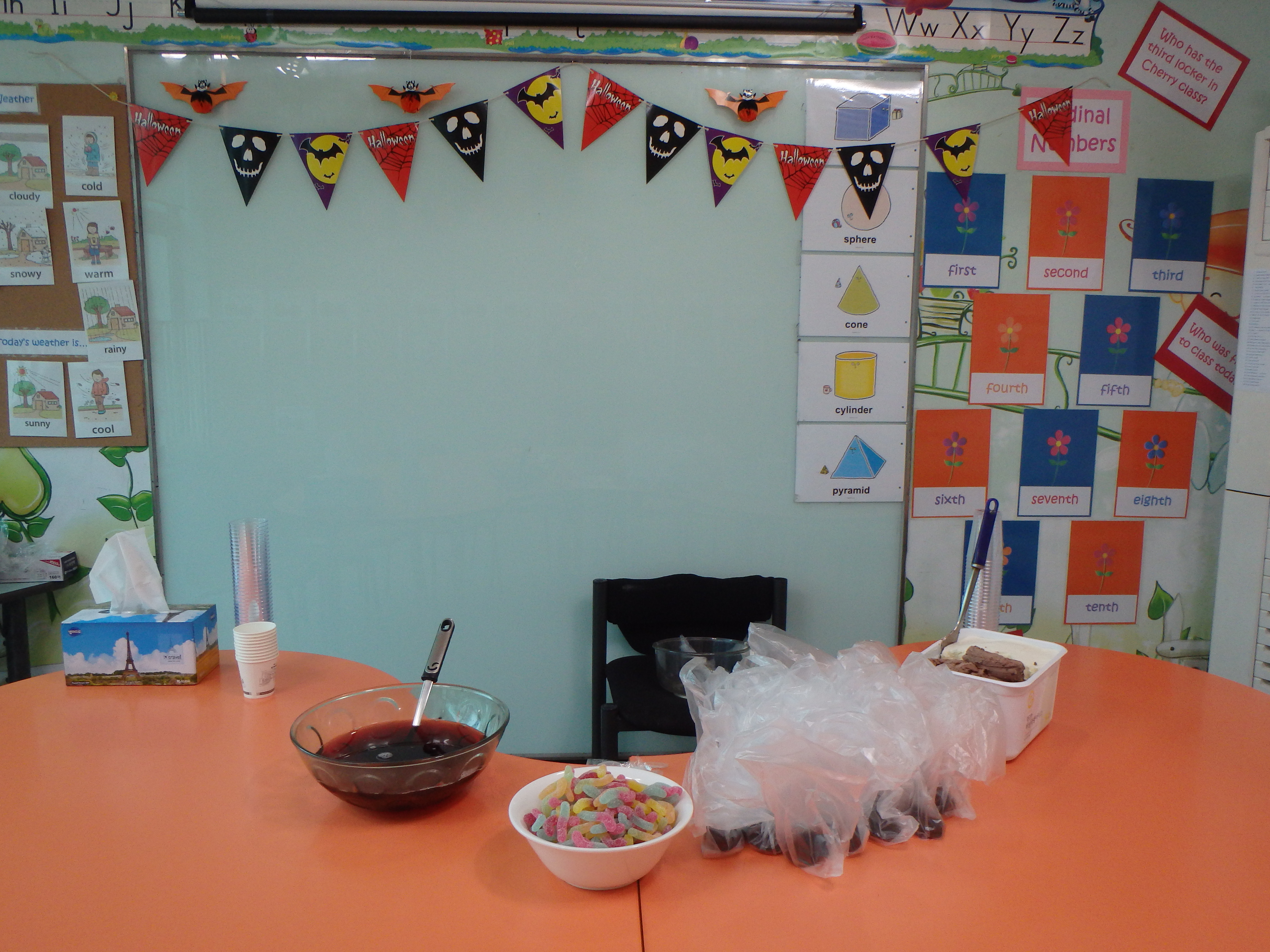 We decorated our kindergarten classrooms and had a Halloween Party on Thursday and Friday for the younger classes. They “trick or treated” (sort of) by lining up and getting candy, we sang the Trick or Treat song (which I did not know!), and we had a costume contest. It was an exhausting day for me but a really fun day for the kiddos.