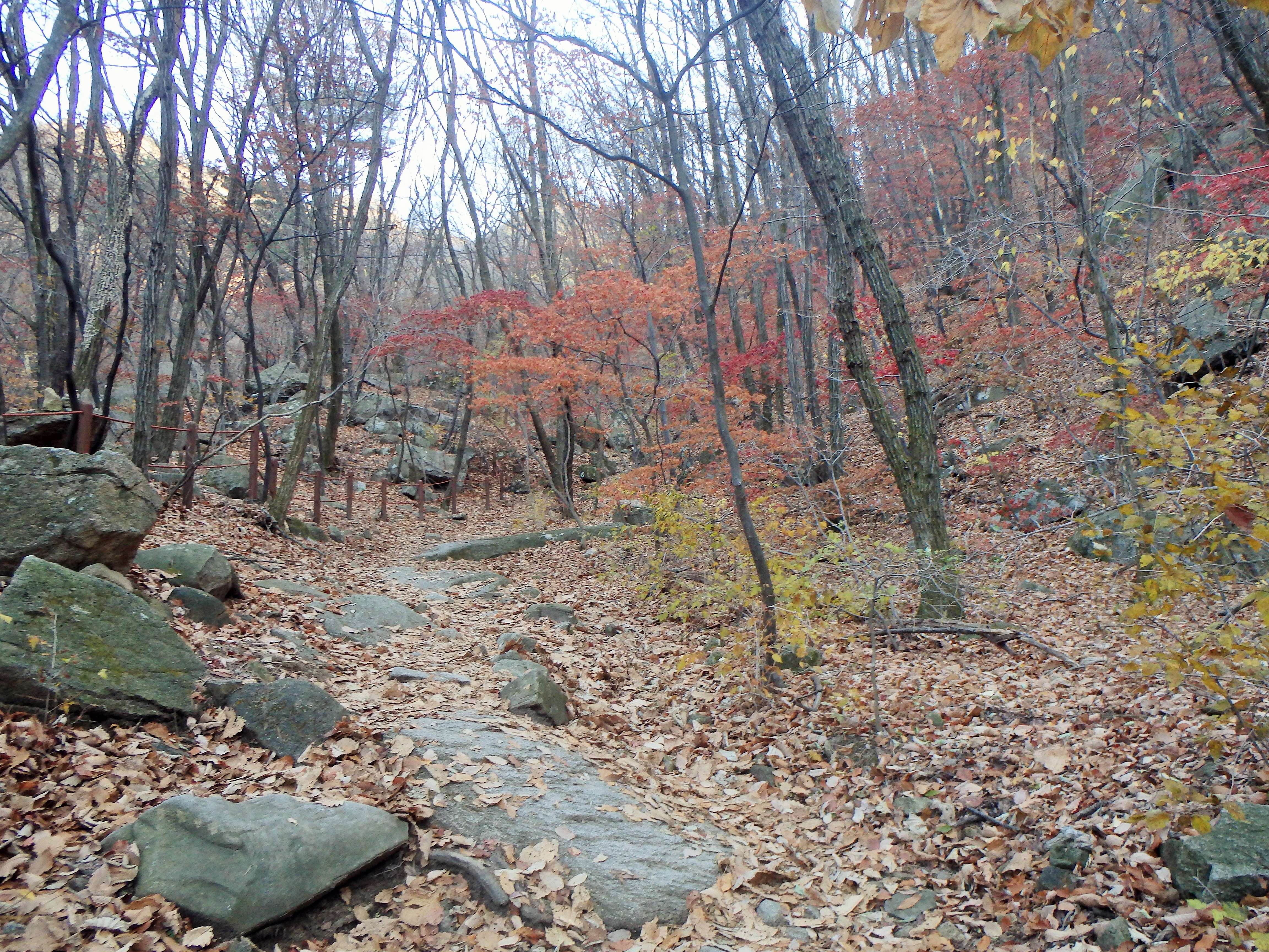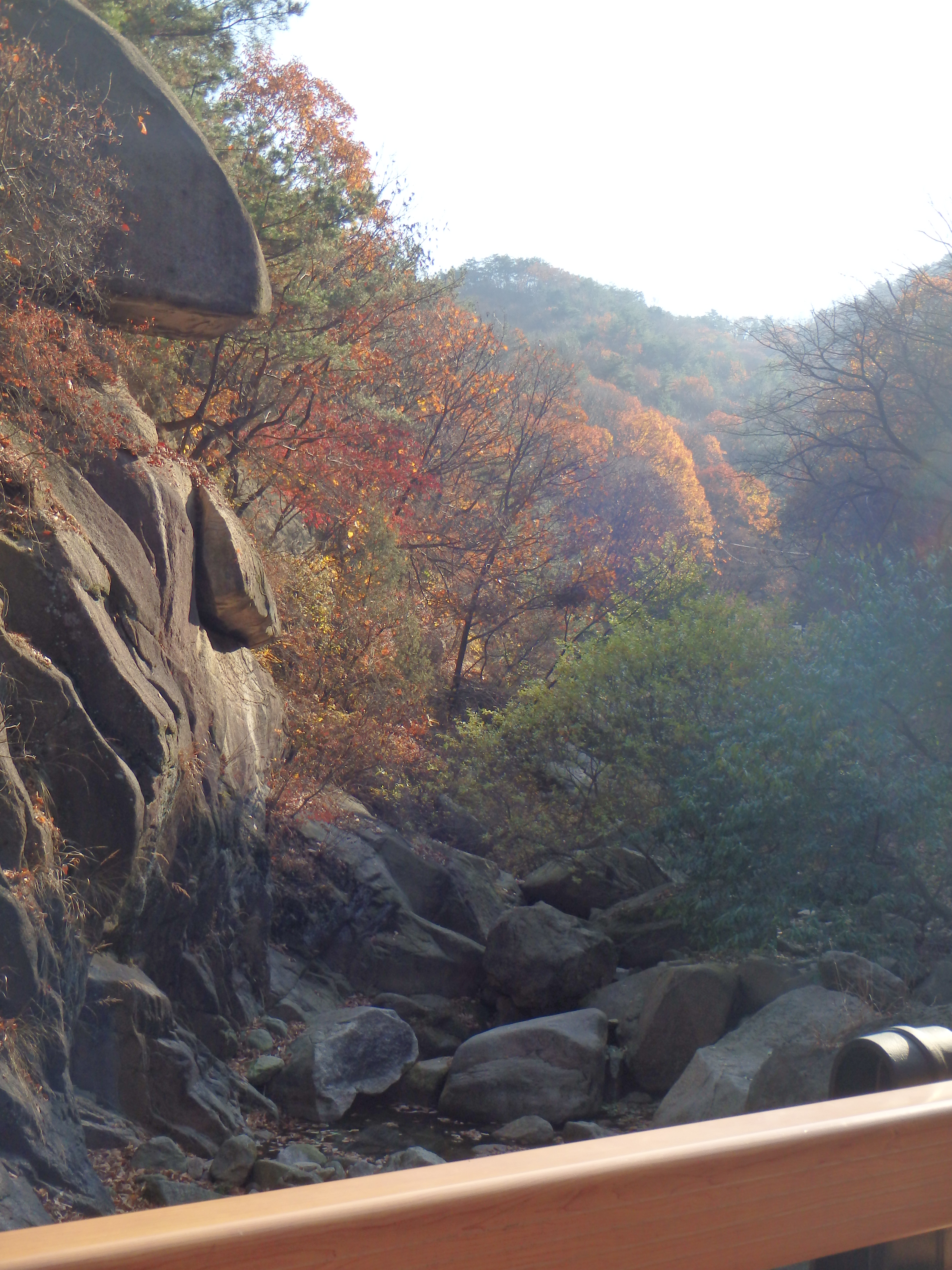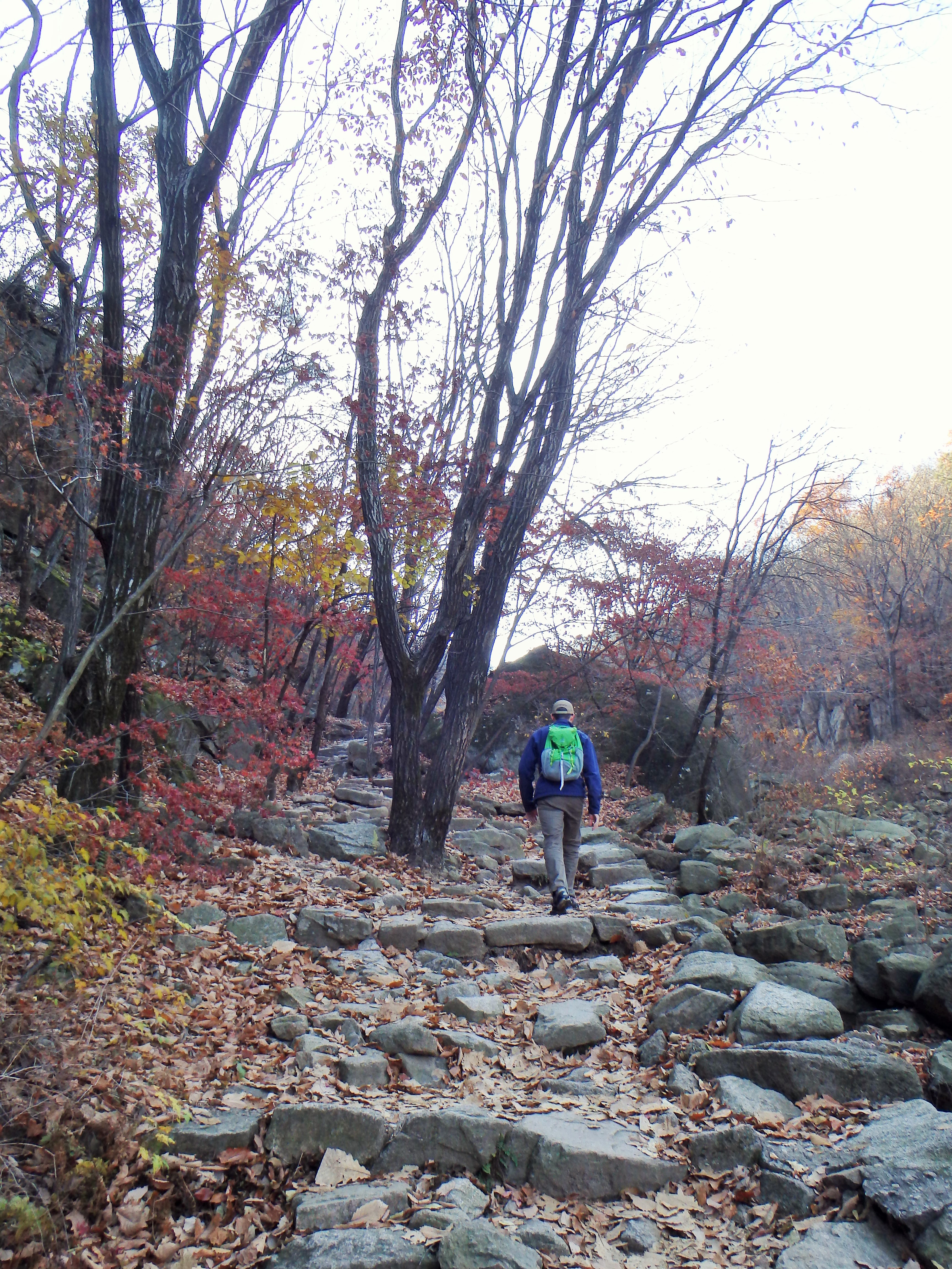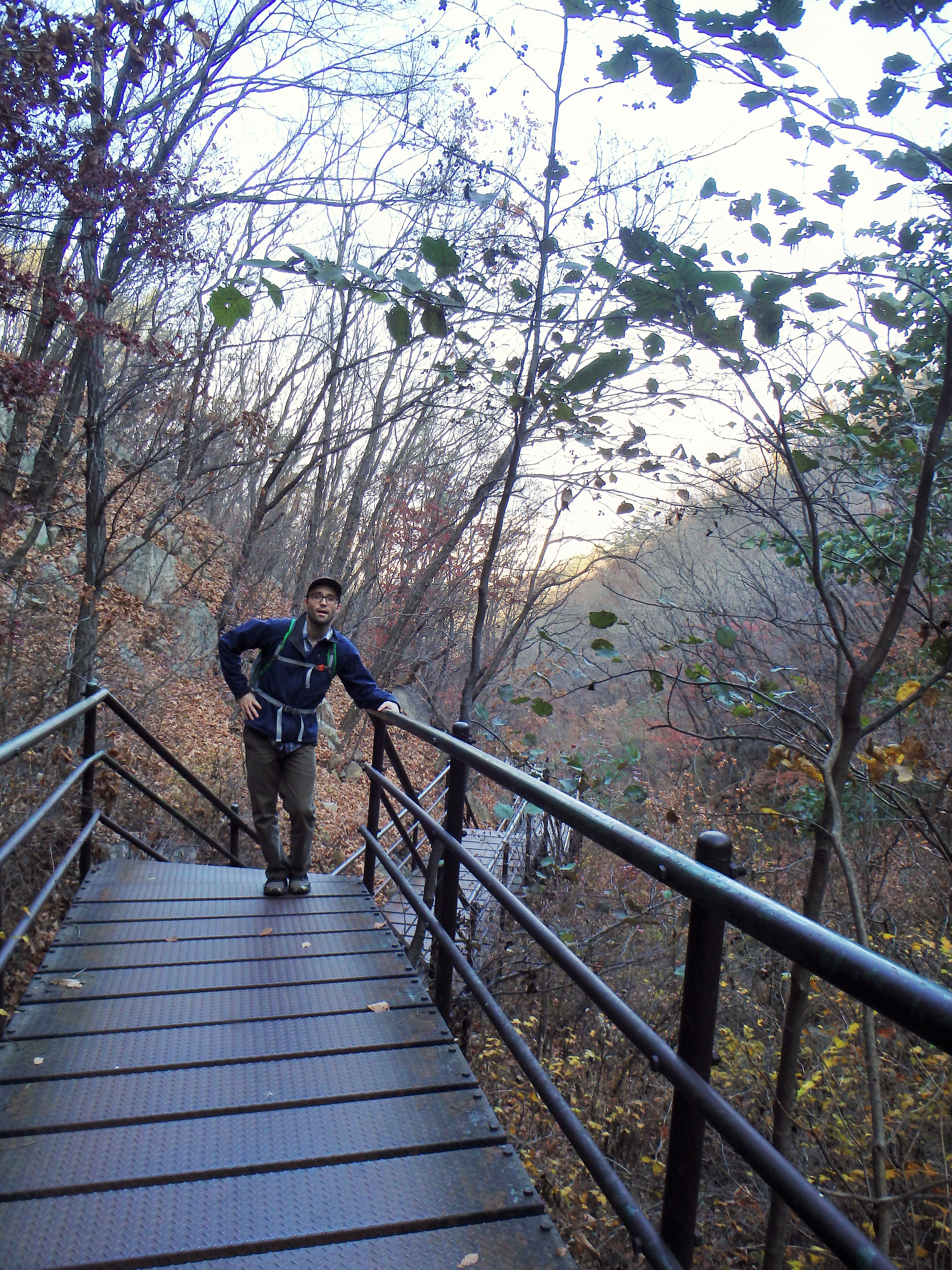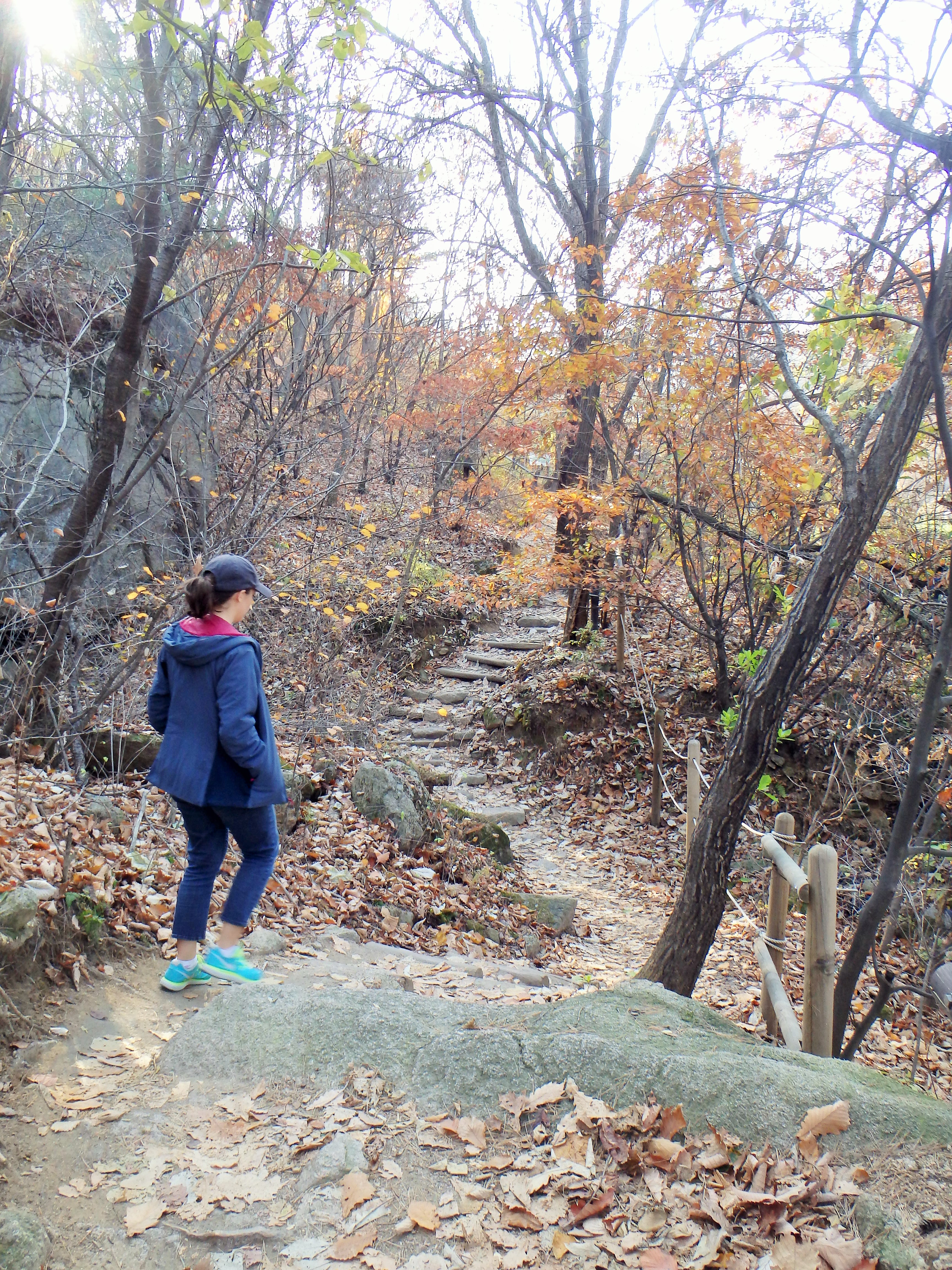 Once we made it to our next turn off, it became clear that we should have stayed up on the ridgeline. We had started our hike rather late in the day (2:40) and knew that we would be racing the sun to get off the mountain before dark. I think it was around 4 or so when we began walking toward Songchu Falls and the Obong Crossroads – a longer and steeper undertaking than I realized. As we walked in the direction of the peak the trail got steeper and steeper. Some Korean hikers even told us it was too late to be heading that way – “too late” – and another group just laughed at us! But we continued on. It was on this stretch of our hike that I began to feel really panicked about being up on the mountain as the sun went down. What I thought would be a nice stroll through the valley was actually a tough ascent up toward the ridgeline. And don’t forget, when I say ascent, I mean essentially hiking straight up. There wasn’t much relief for our knees, and of course, there were more staircases.