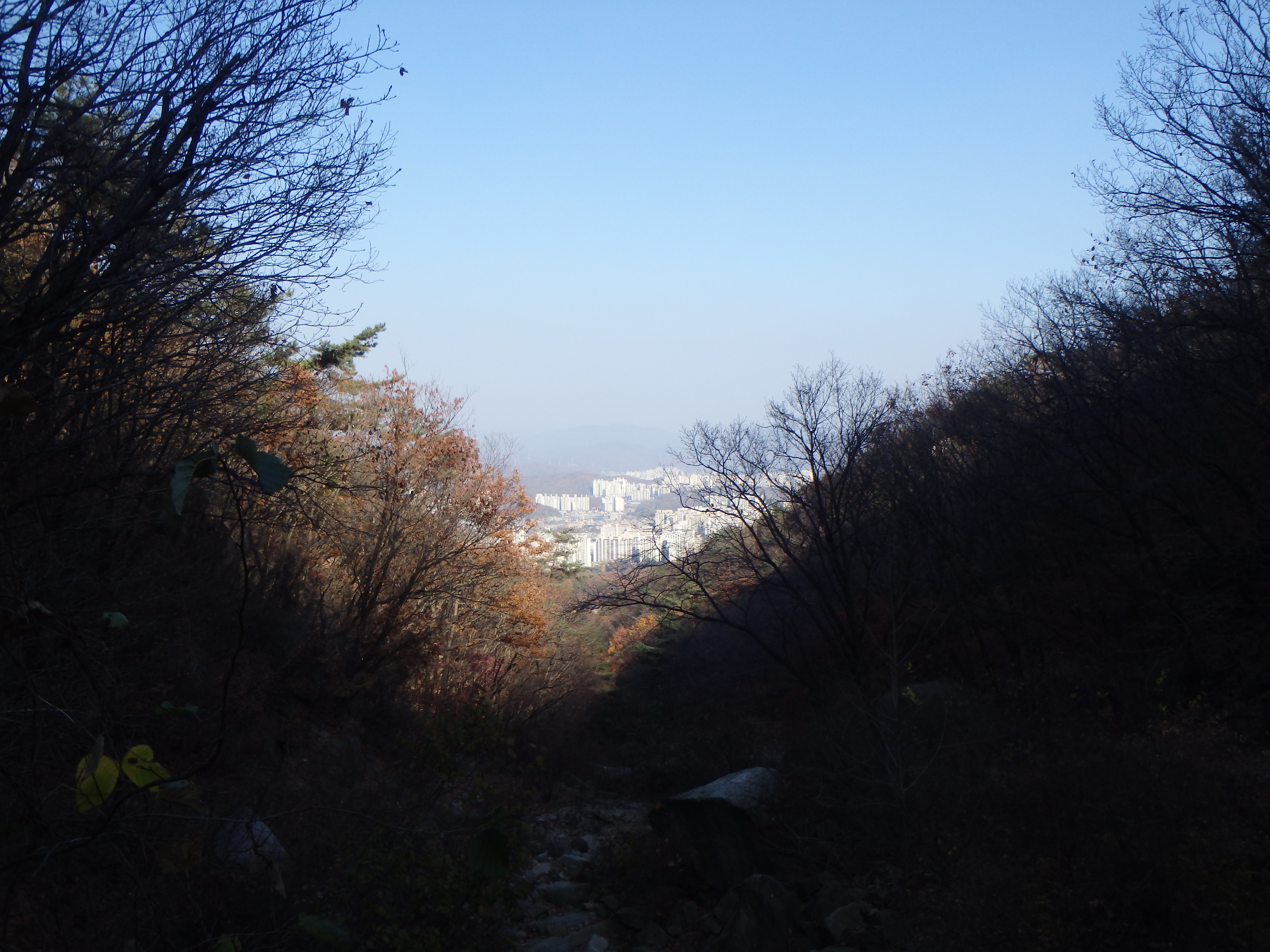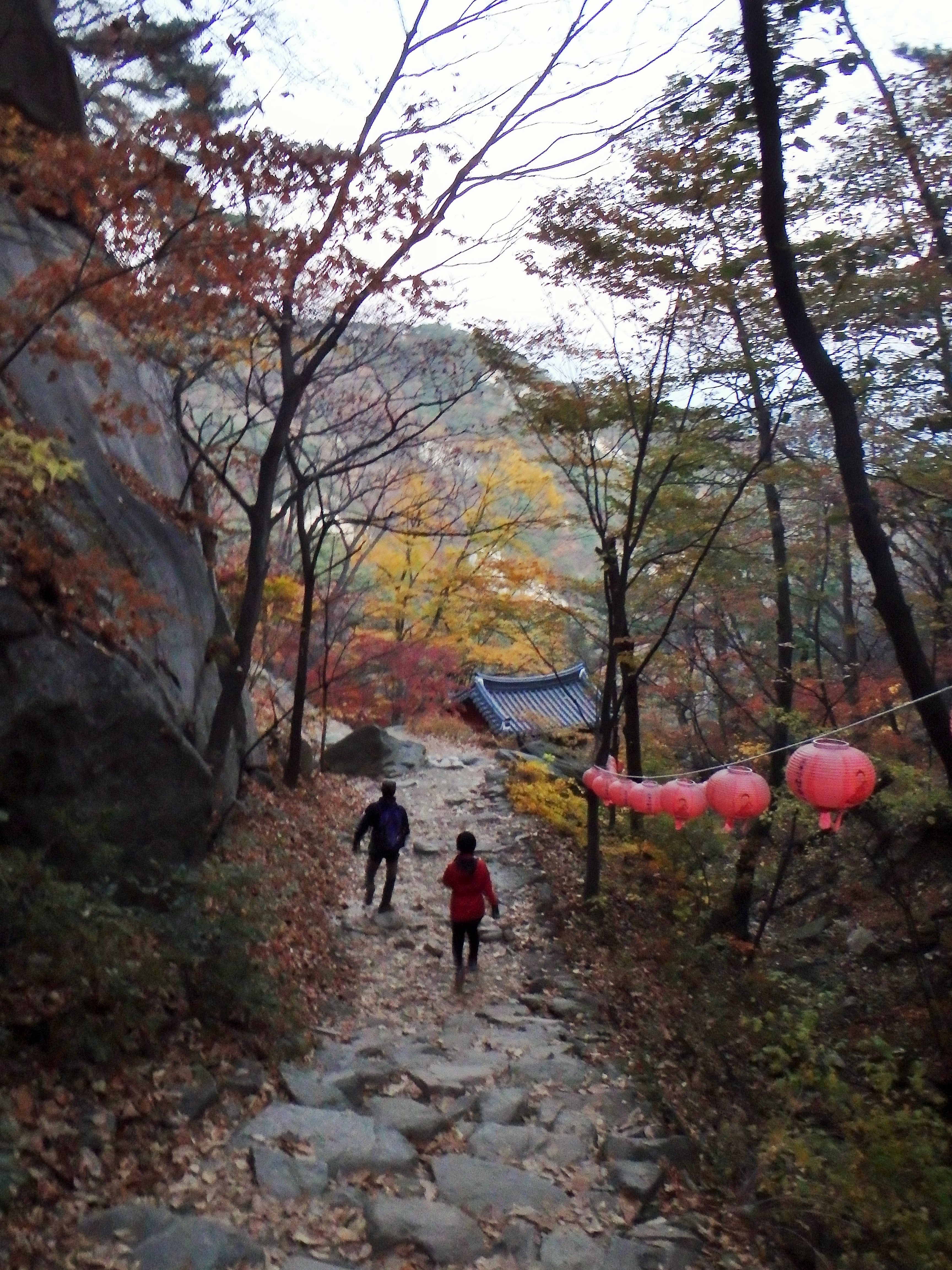 We decided to start down the mountain when we got to Jubong so that we could at least get through the most difficult part of our descent before we lost the sunlight. Once we reached Madangbawi I was relieved to see that there were several other hikers enjoying the sunset view. The rest of the way we were always behind other hikers. We only ended up hiking in the dark for the tail end of the hike and even then it wasn’t too difficult since our eyes were acclimated. Unfortunately, the trail was pretty steep and full of steps so at the end our knees were killing us. I’m unsure of the exact route we took down because we couldn’t read the signs in the dark but we passed a couple of temples and possibly the shelter.
