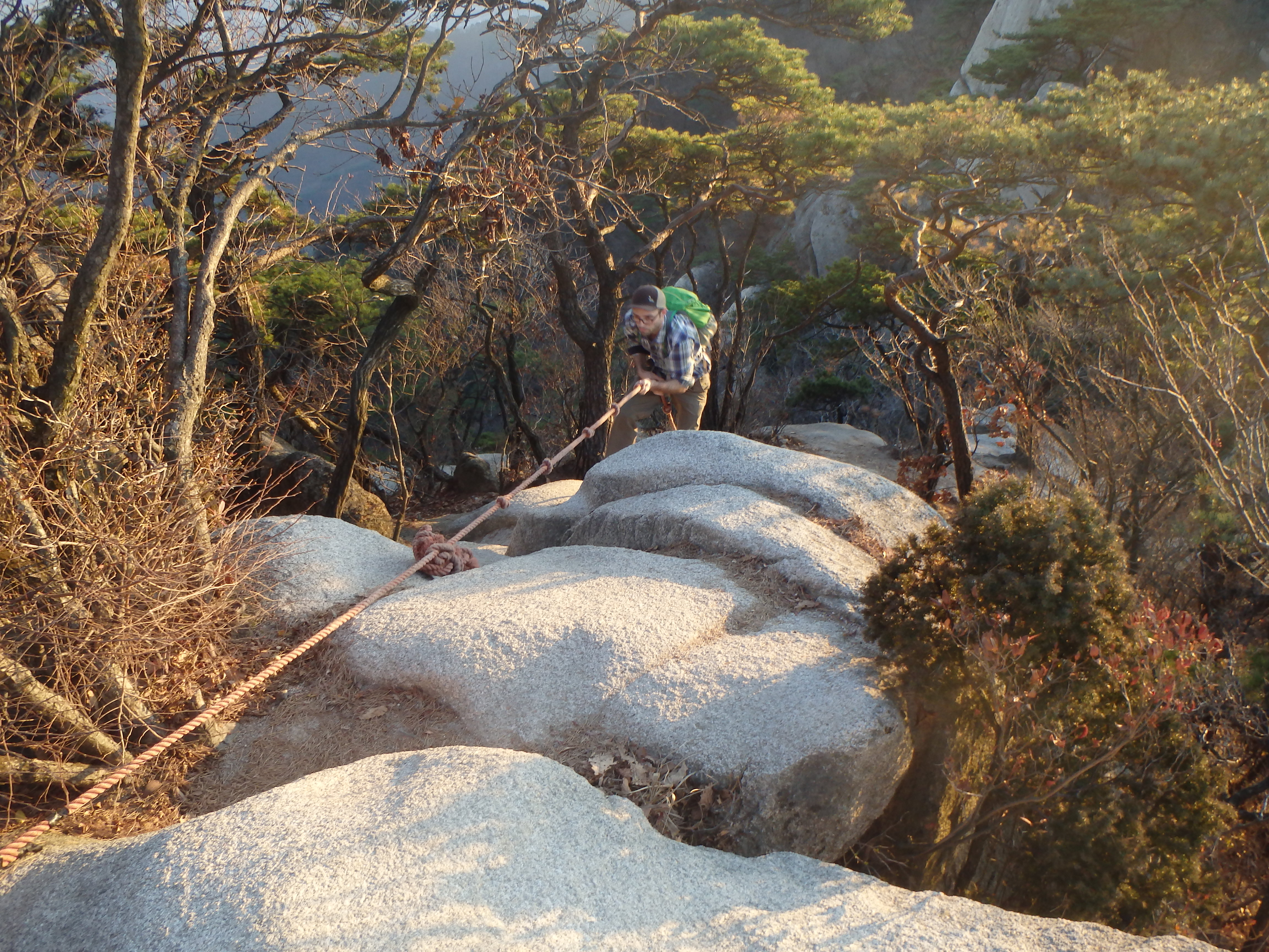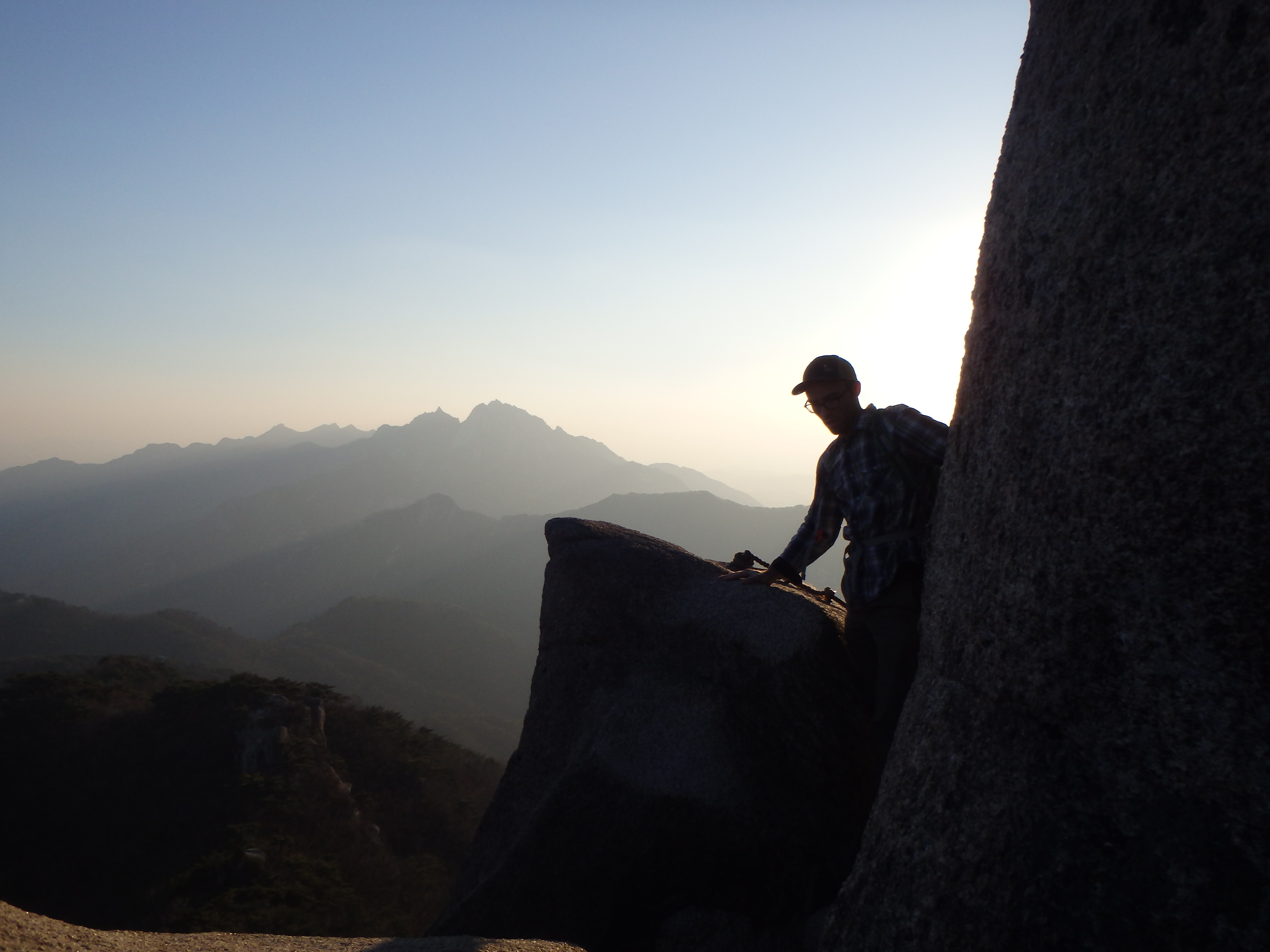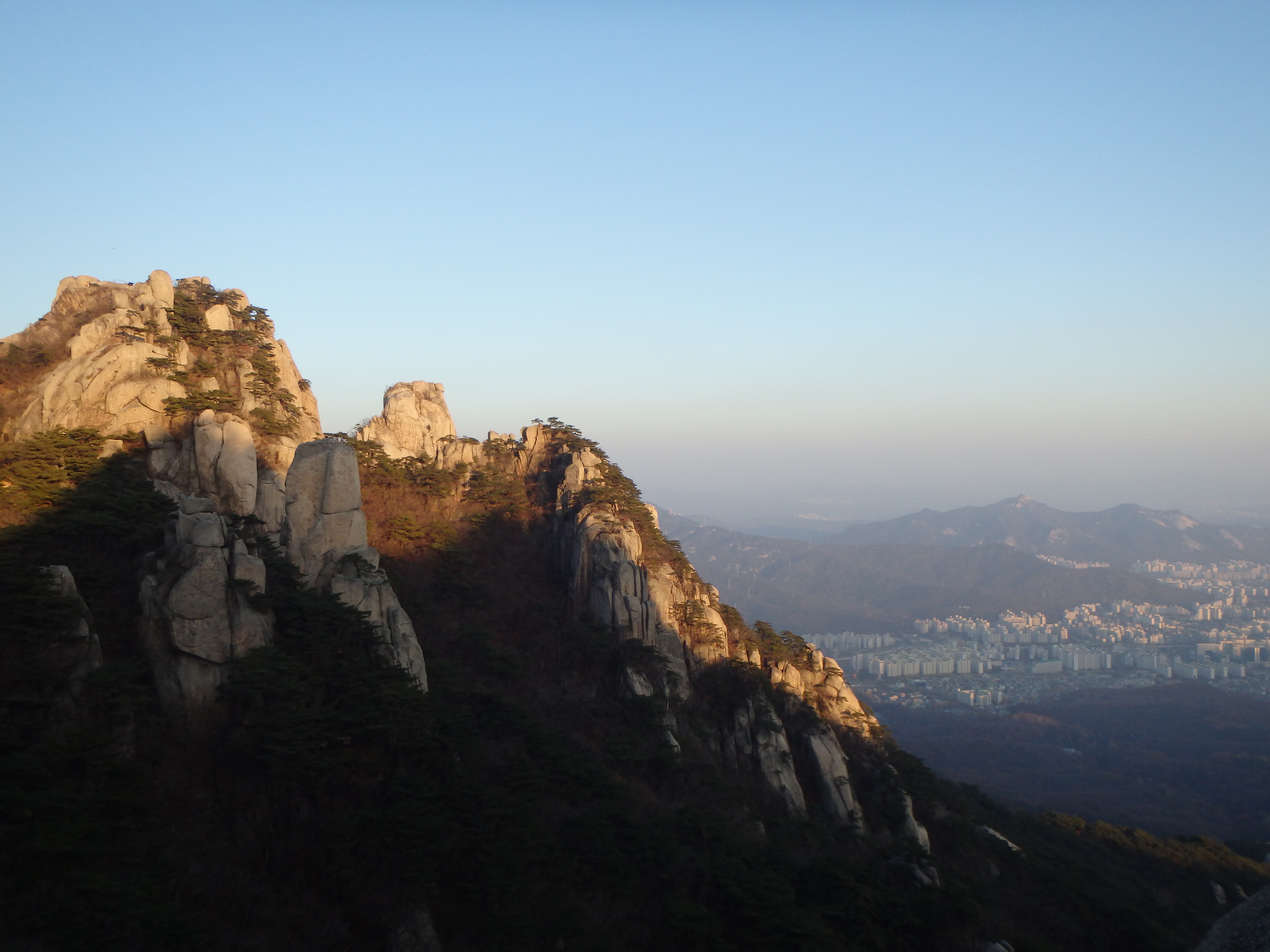 At last we made it up and out of the valley and back to the ridgeline. We knew we couldn’t make it to Obong Peak and get back down the mountain before the sun set so we headed in the opposite direction toward Jaunbong (Dobongsan Peak). This path was daunting at first but much more exciting. We were climbing over the rocks with beautiful views all around us. It ended up being the perfect time to be up there as the sun’s warm glow was beginning to set over the range.
