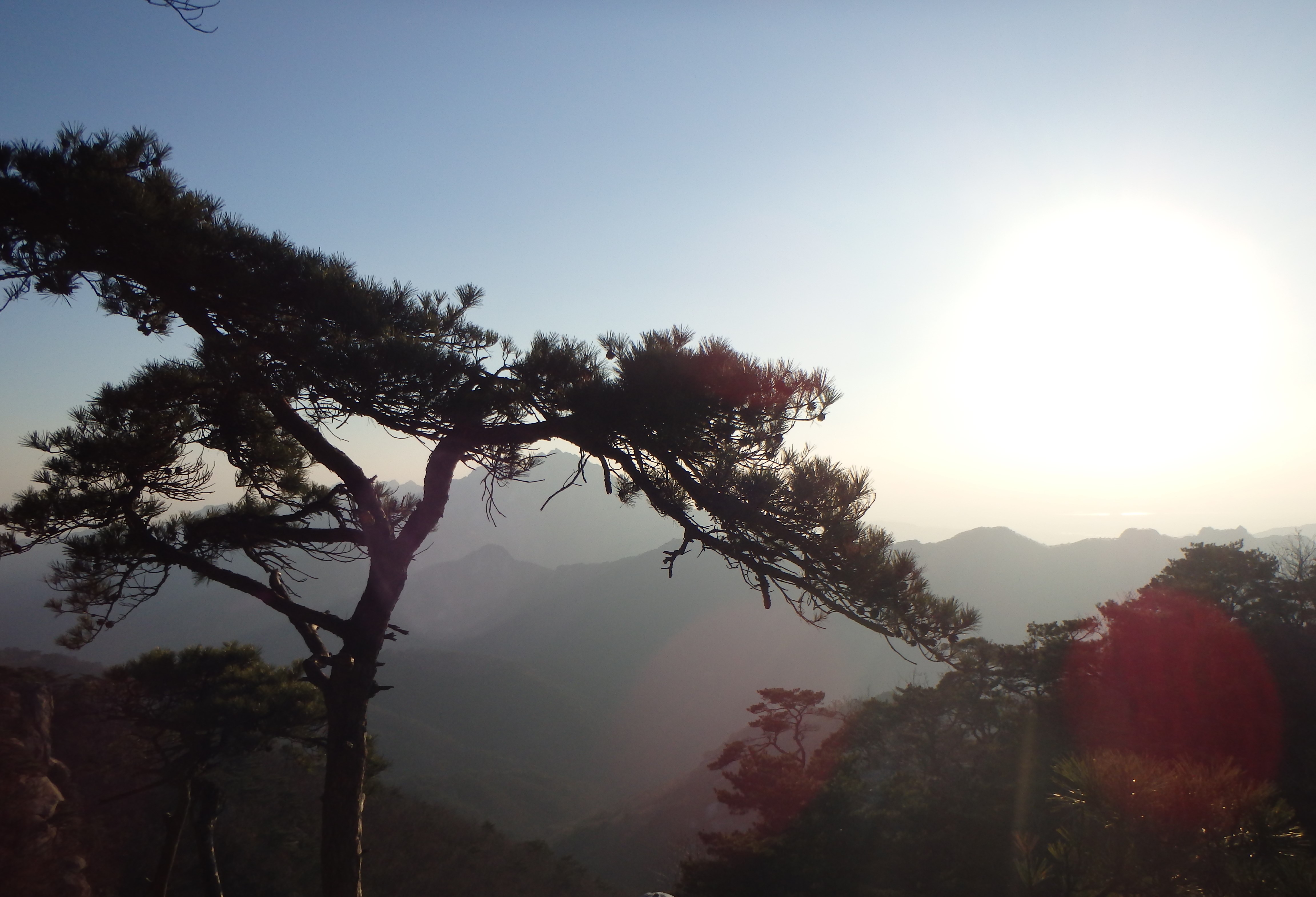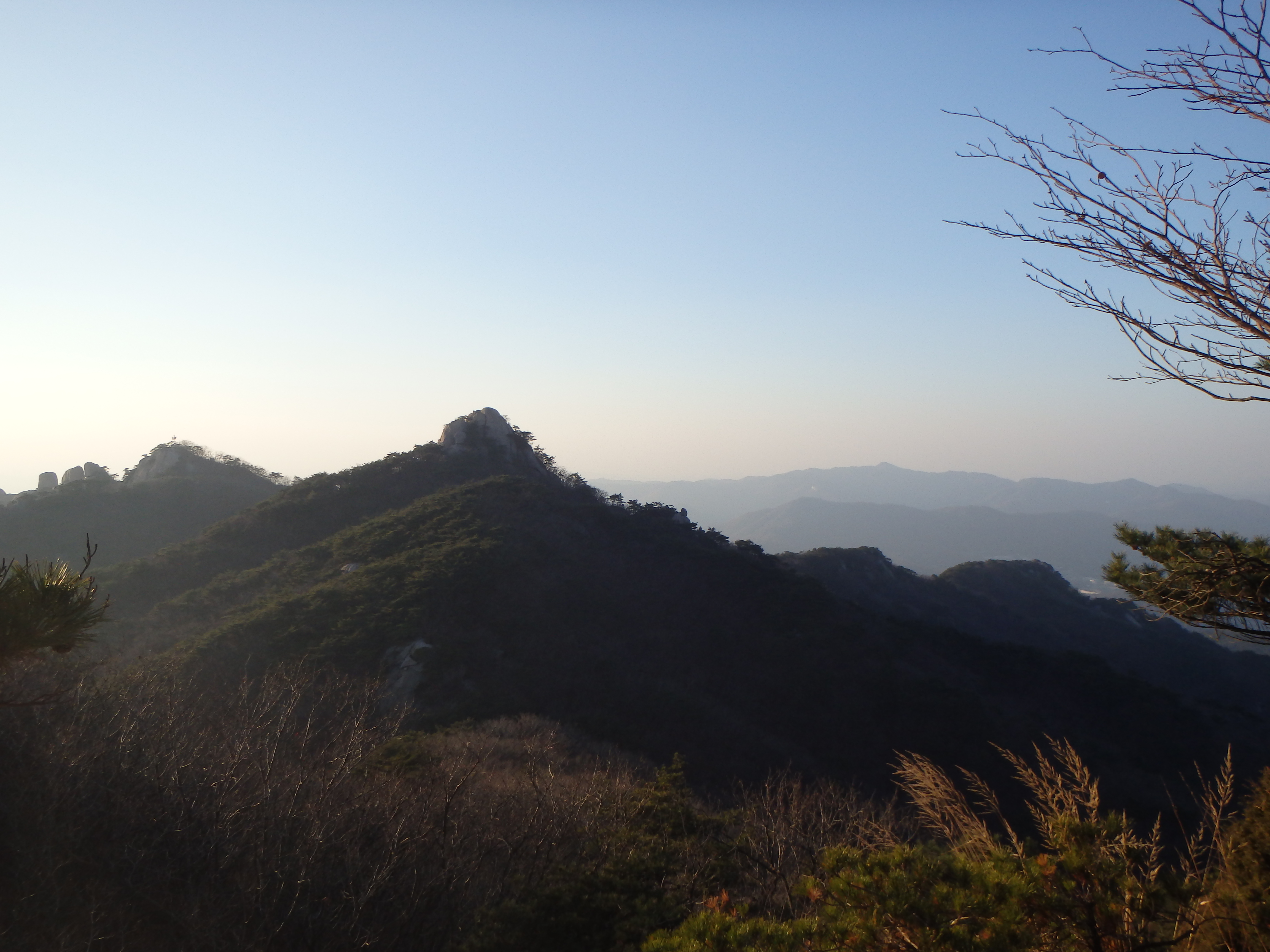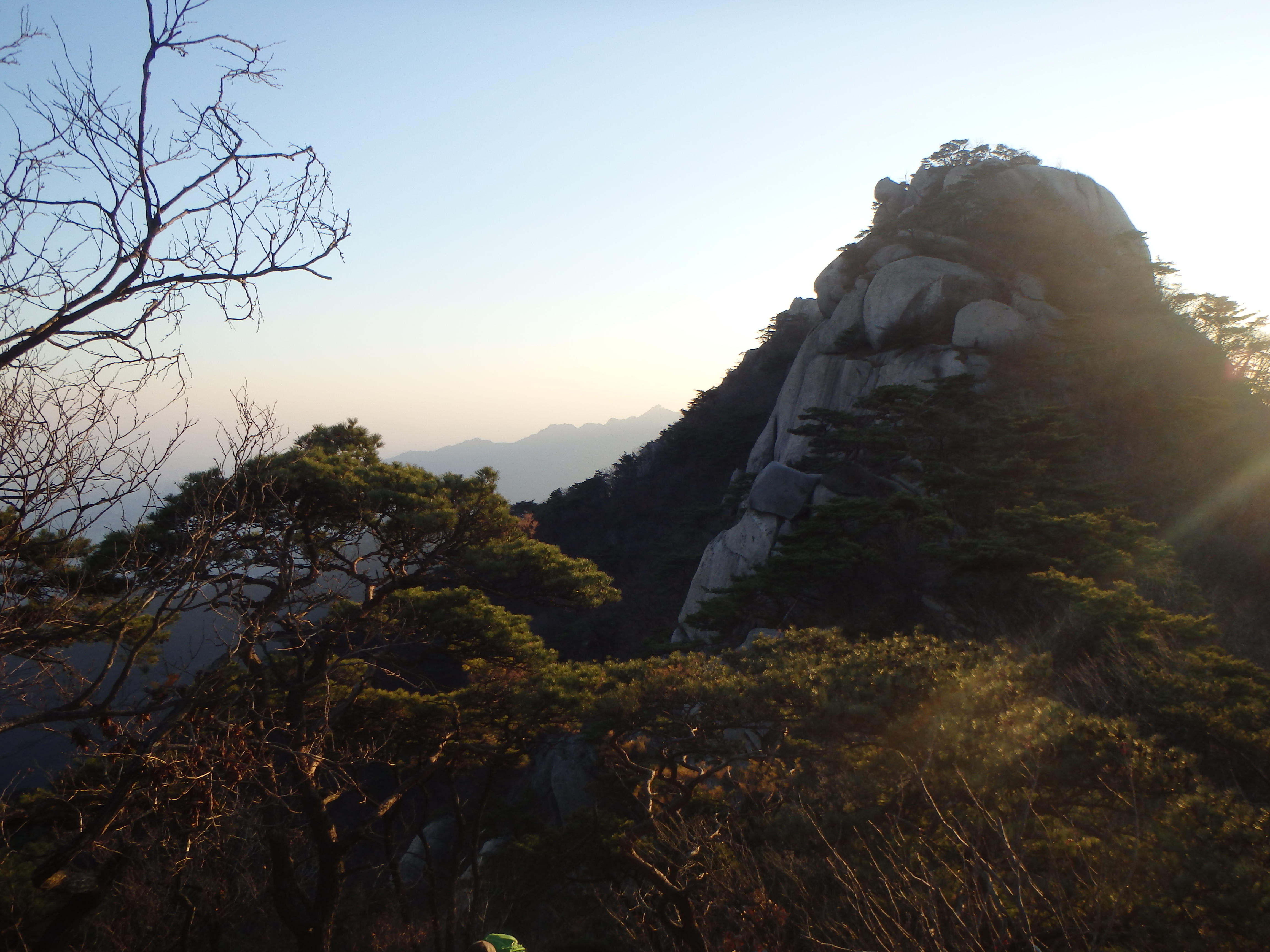 At last we made it up and out of the valley and back to the ridgeline. We knew we couldn’t make it to Obong Peak and get back down the mountain before the sun set so we headed in the opposite direction toward Jaunbong (Dobongsan Peak). This path was daunting at first but much more exciting. We were climbing over the rocks with beautiful views all around us. It ended up being the perfect time to be up there as the sun’s warm glow was beginning to set over the range.