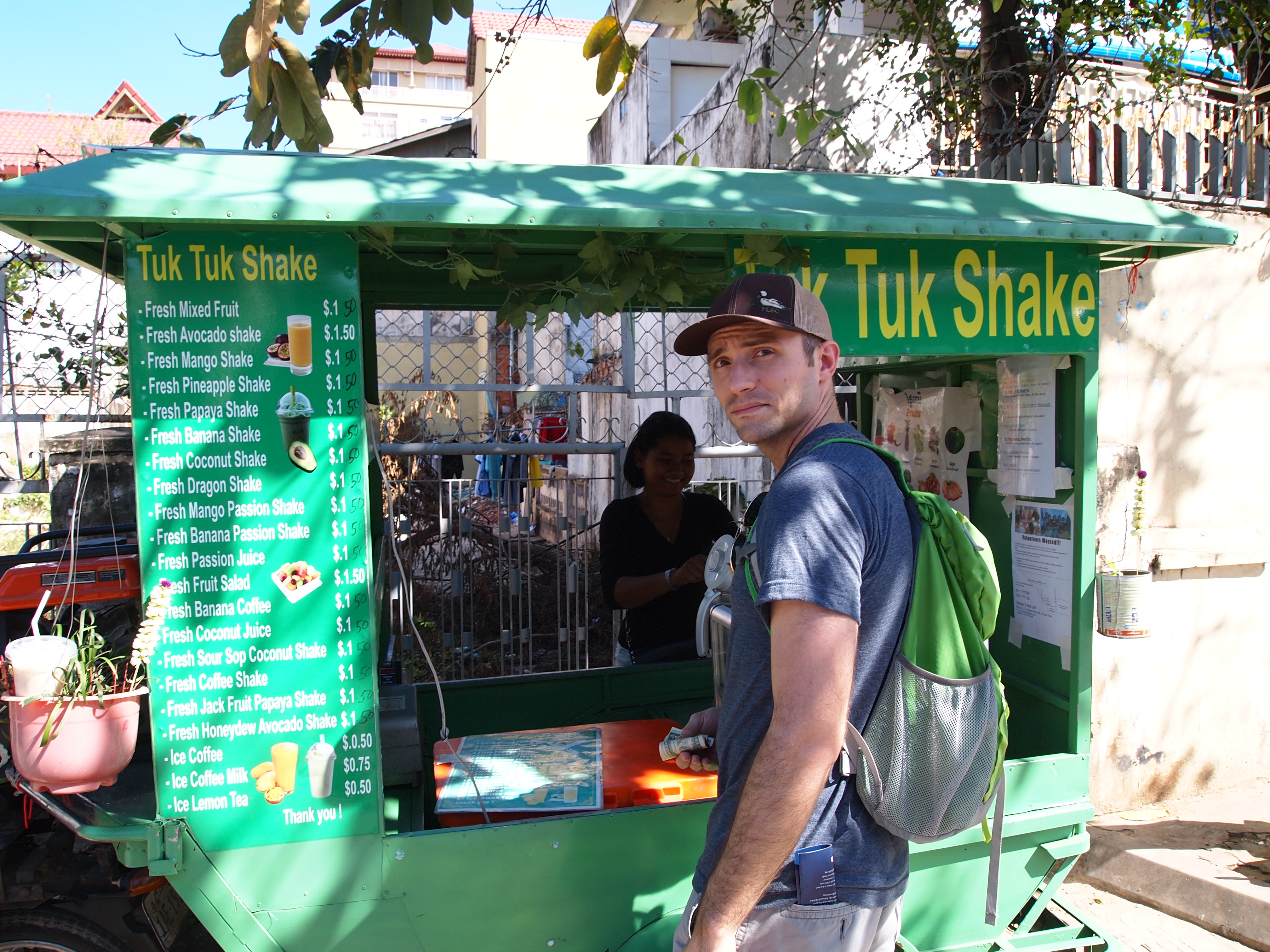 Mr. Day dropped us off at a Khmer restaurant after we finished shopping. We were famished, sweaty, and tired. We each ordered Angkor beers and food – I had stir-fried chicken and mango and Zach had an amok curry with pork. They were both delicious!