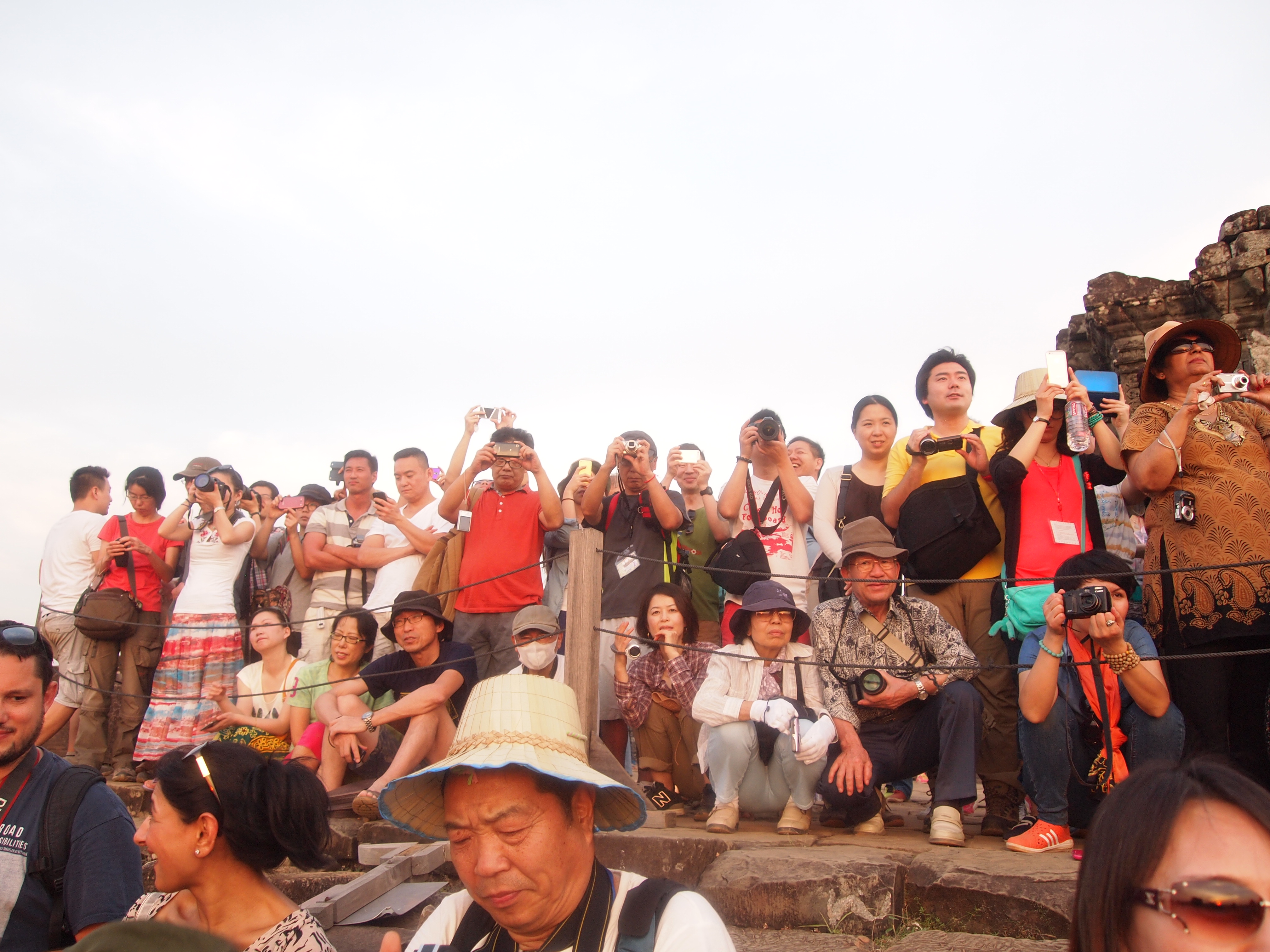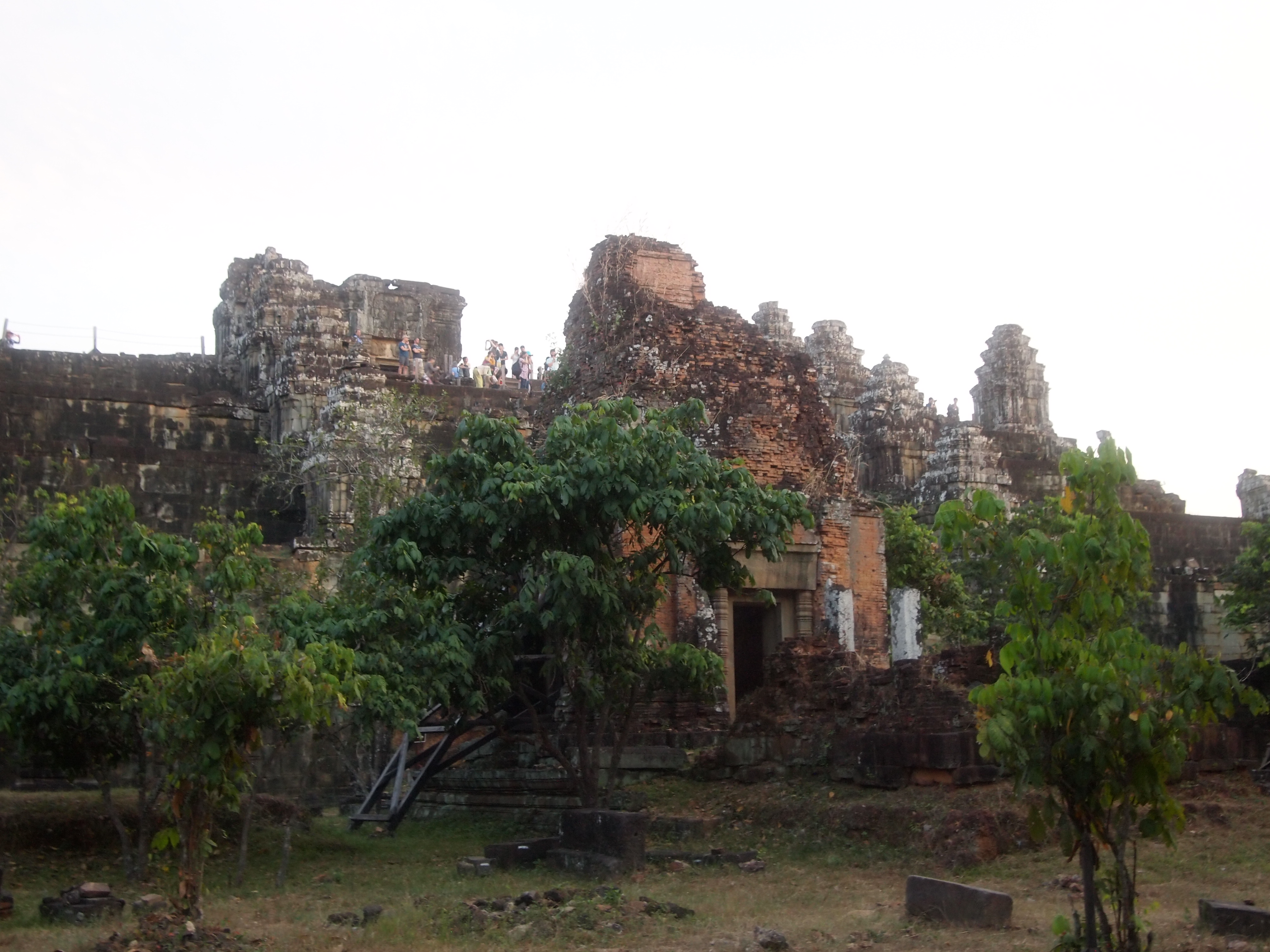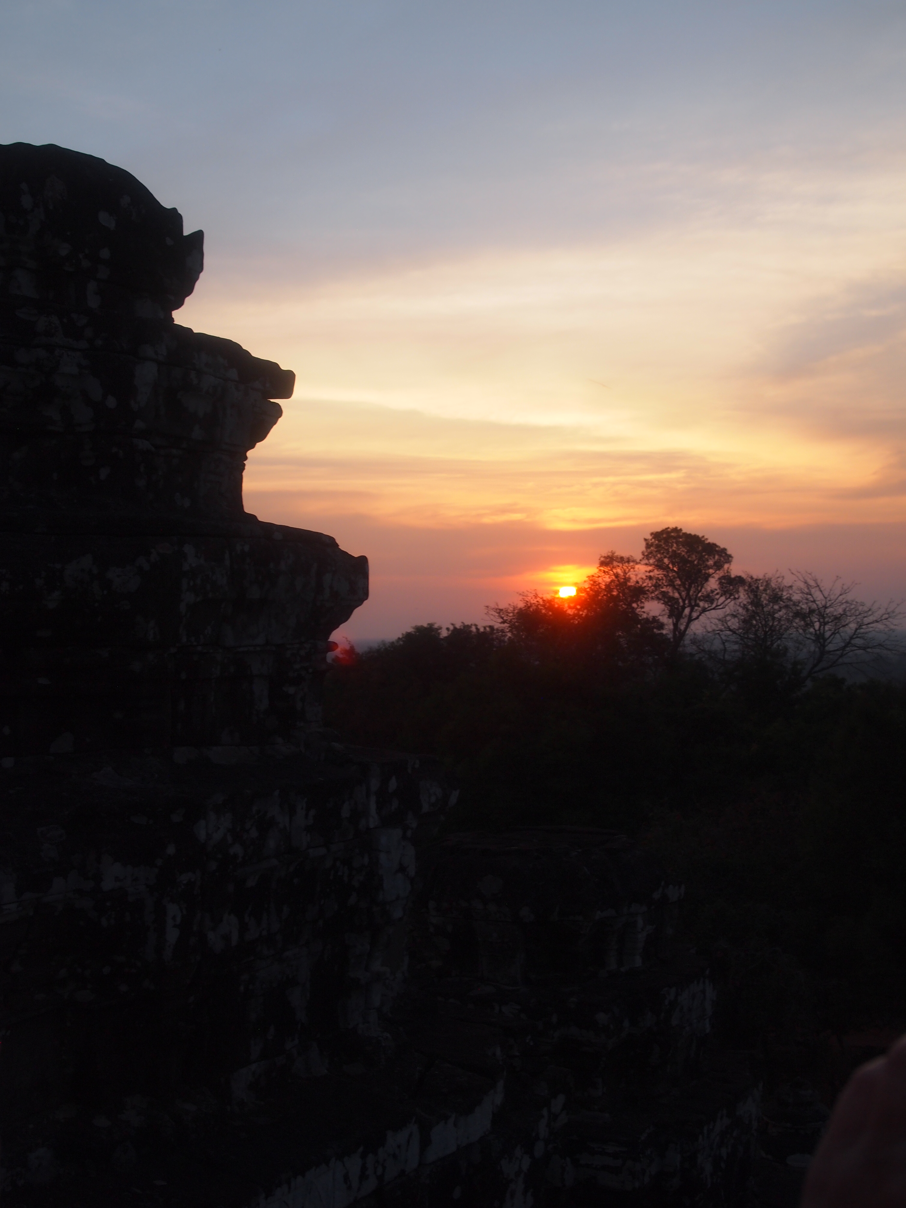 We had read that if we bought our one day pass into Angkor the day before we could go watch the sunset. So we decided to grab a tuk tuk and buy our pass for the following day so we could watch the sunset at one of the temples. I regret not doing some research on which places were best for sunset. We simply relied on our driver for a recommendation. He took us to Phnom Bakheng which was constructed between 889-910 and was the first of the mountain temples near Angkor. It is now an extremely popular place to watch the sunset – a little too popular for my taste. We walked up a fairly steep dirt path and eventually made it to the temple ruins. It was overrun with hordes of tourists! I was pretty under-whelmed by the whole thing and it made me skeptical of going to Angkor Wat at sunrise the next morning. But we had already told our first tuk tuk driver to pick us up at 5am so we were already committed.