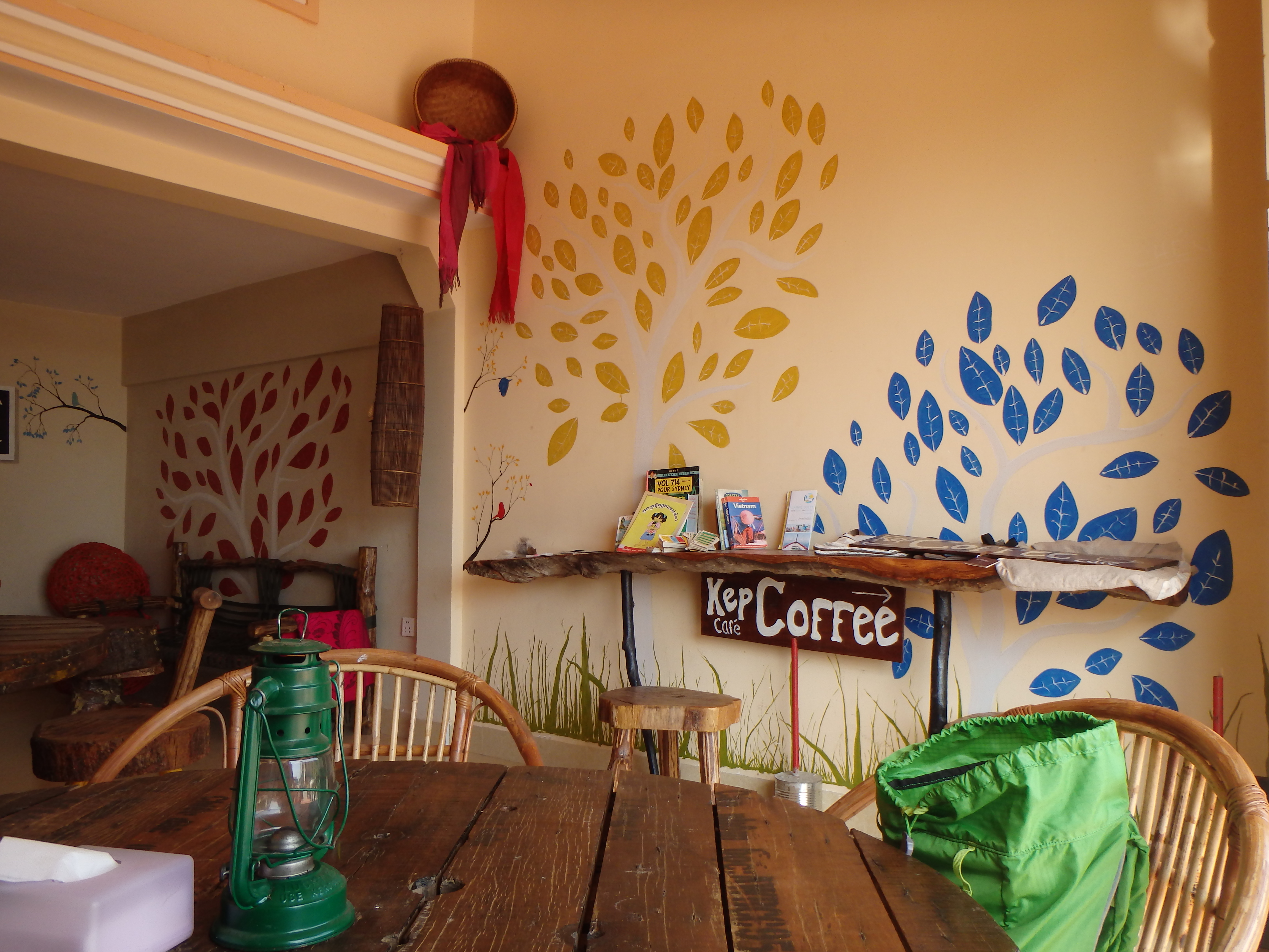 We rode around Kep and discovered a delightful coffee shop run by an American family – Kep Coffee Shop. They had real coffee and cake! I don’t think I truly realized how much I missed cake with frosting until I had a slice of their chocolate cake with peanut butter frosting. Mmmmm! (I’m still dreaming of it…) We really enjoyed talking with Brian and Savvy about their time in Cambodia and our time in Korea. It was really wonderful being able to chat with them. Their goal is to establish a self-sustaining business that can employ and provide a safe space for Cambodian women. We wish them all the best in their efforts; it’s such an important project. So, if you’re in Kep make sure you stop by and pay them a visit!