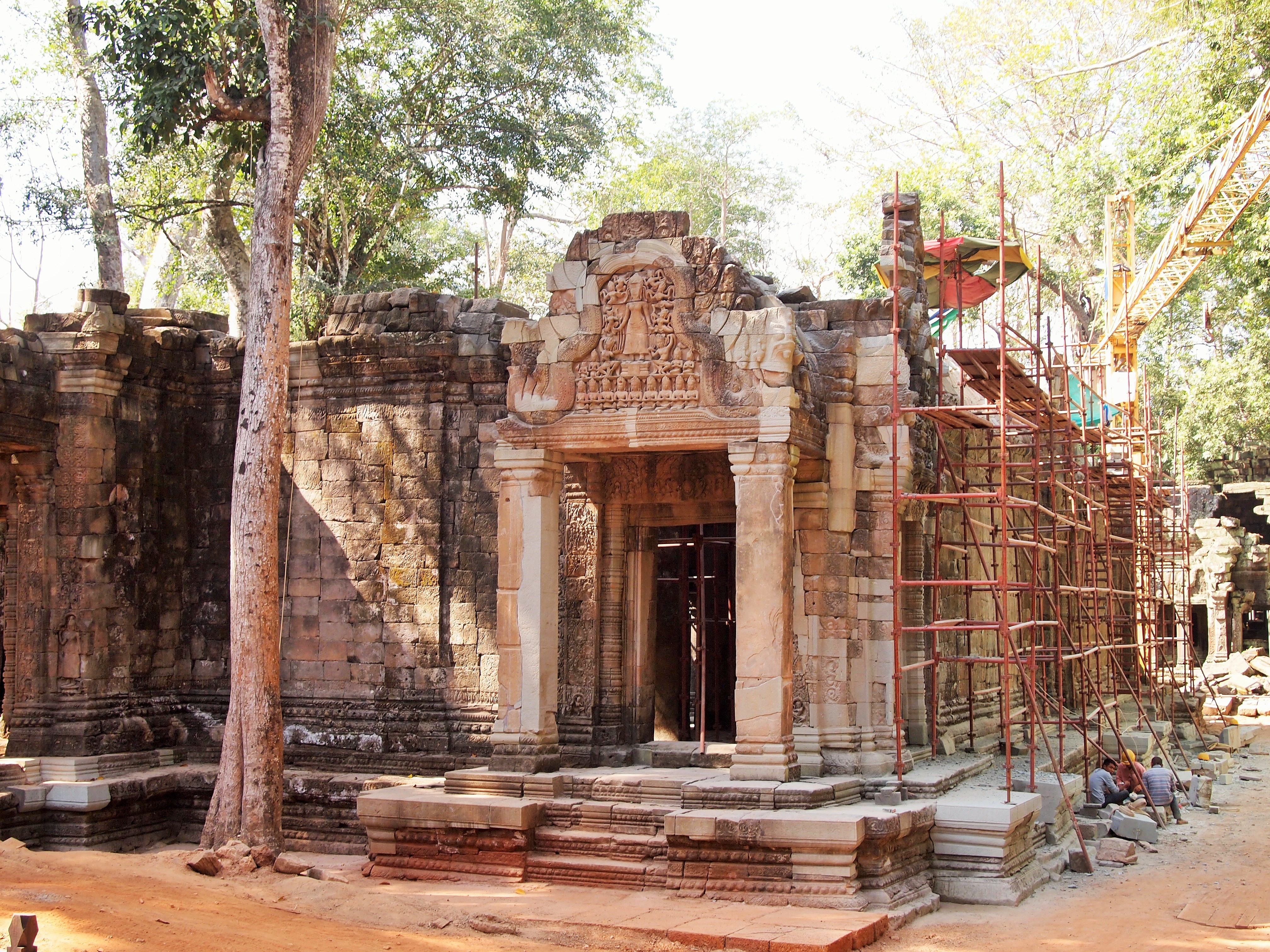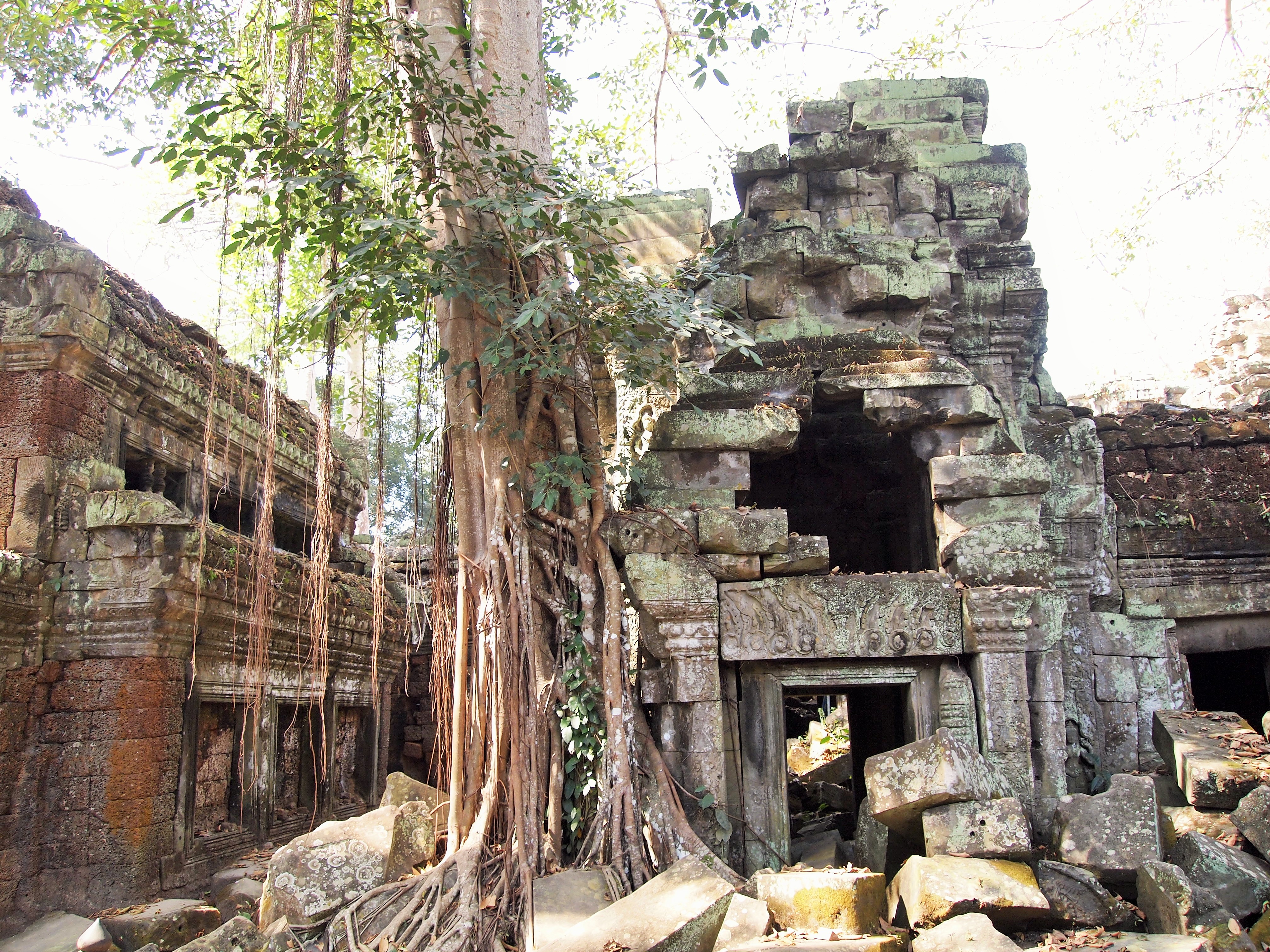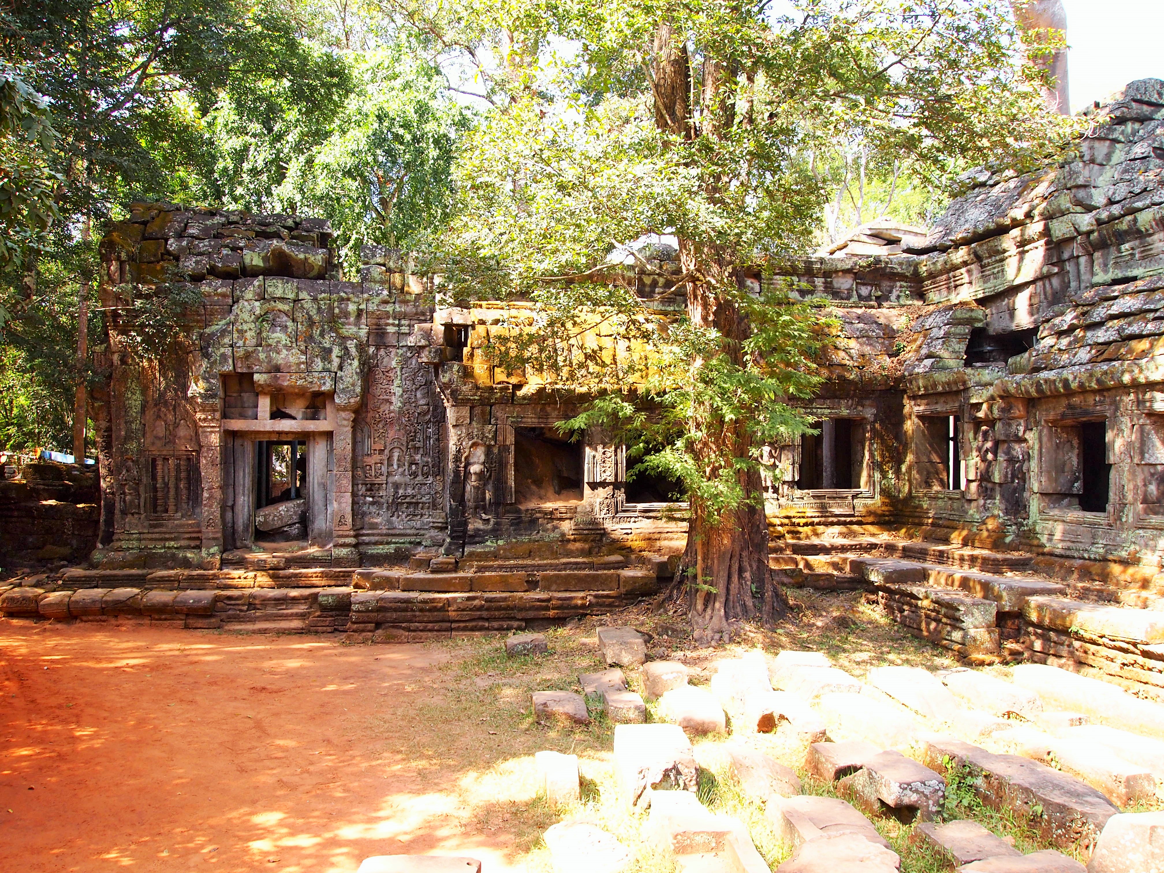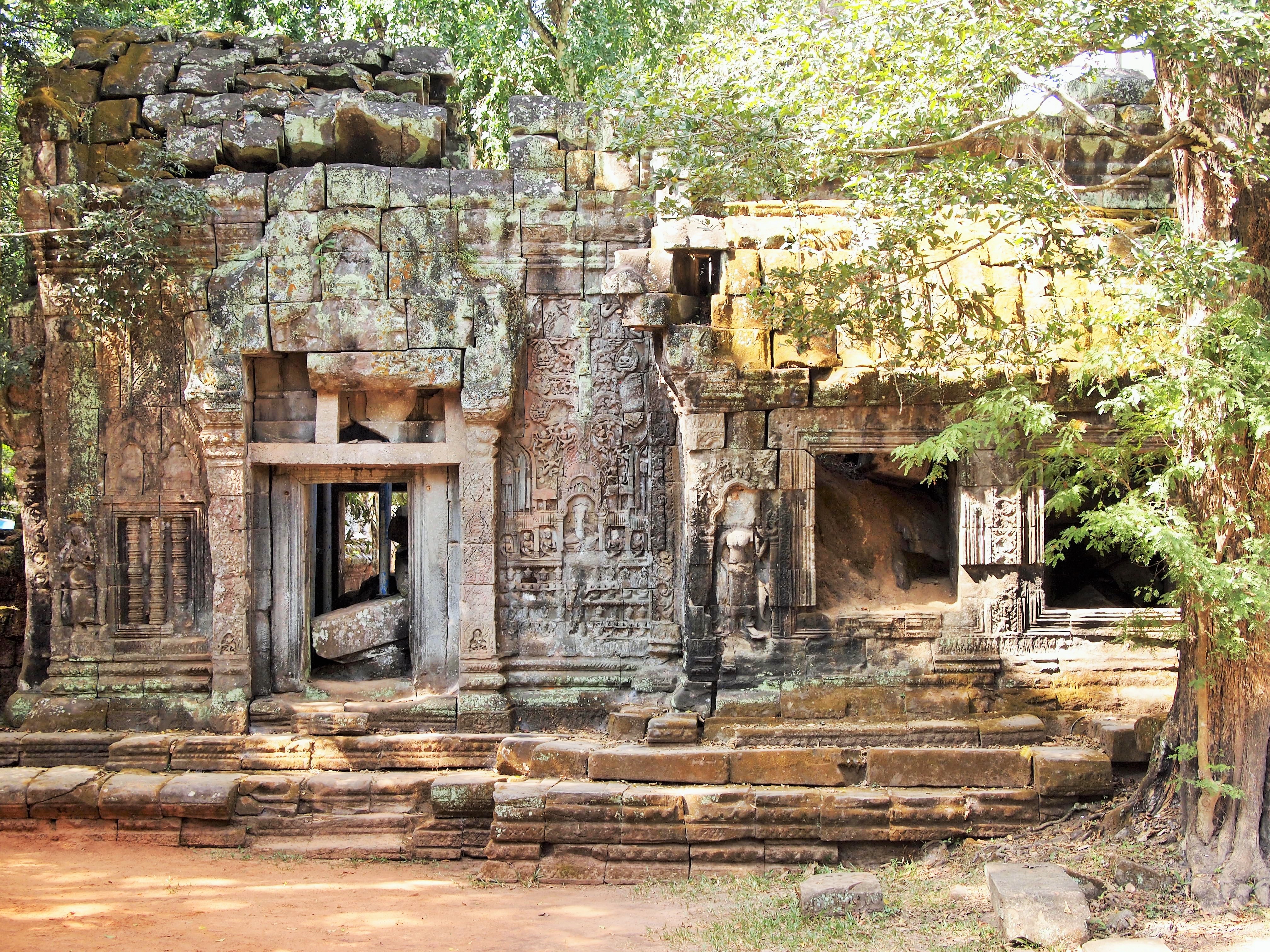 Ta Prohm was built by Jayavarman VII in the latter half of the 12th century. It was a Buddhist monastery that he dedicated to his mother and one of few places in Angkor that had an inscription which provided information about the complex. According to the inscription, Ta Prohm required almost 80,000 people to maintain the temple.