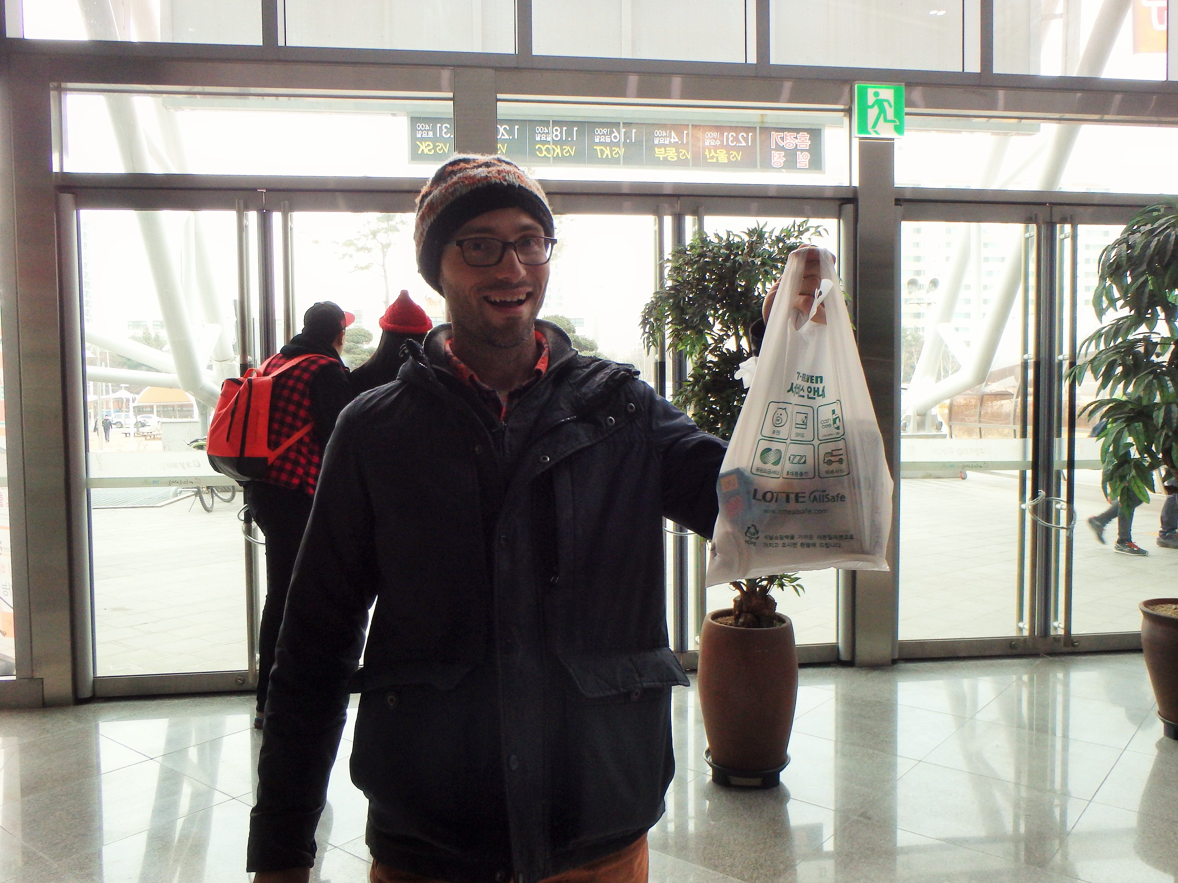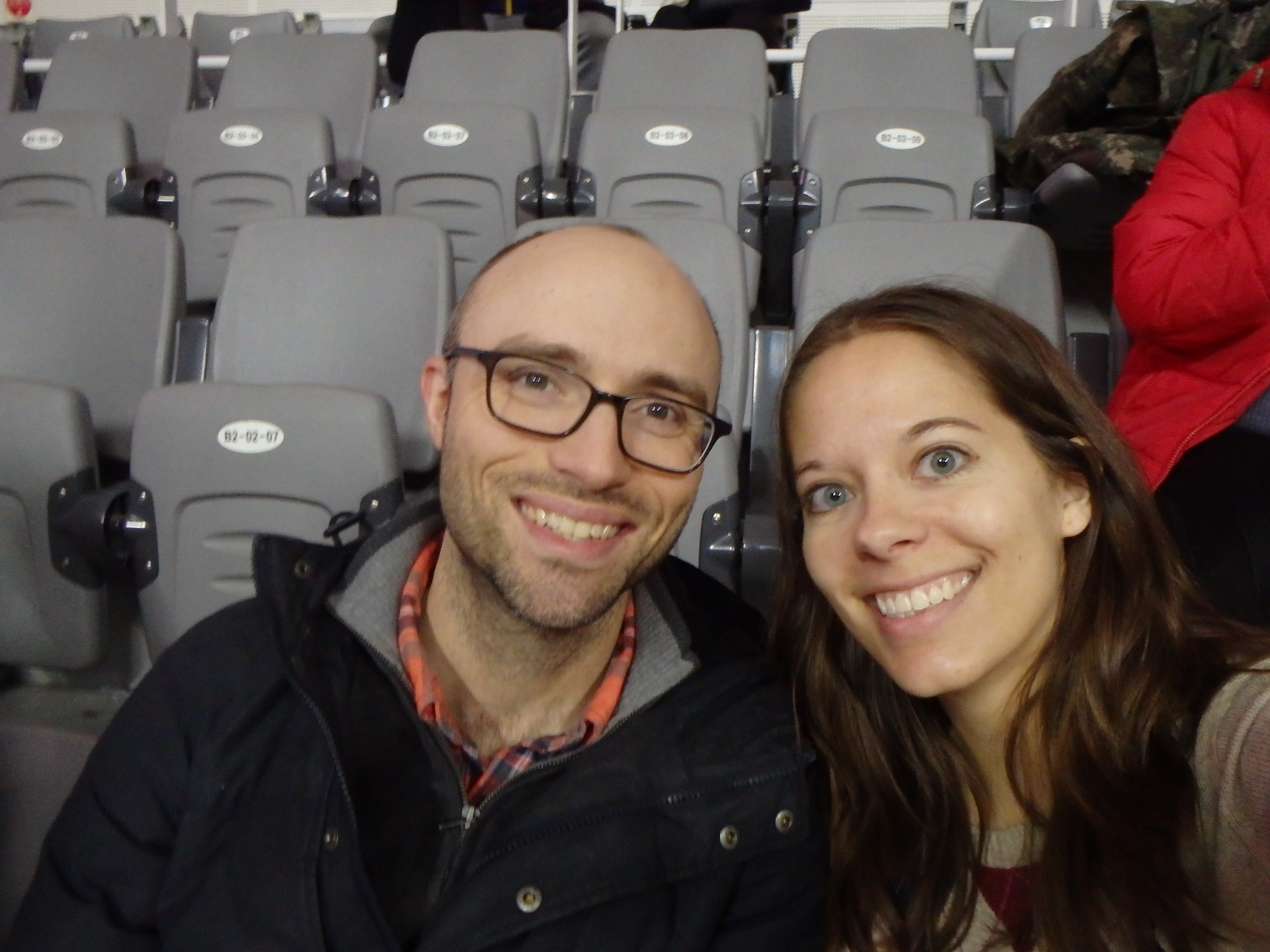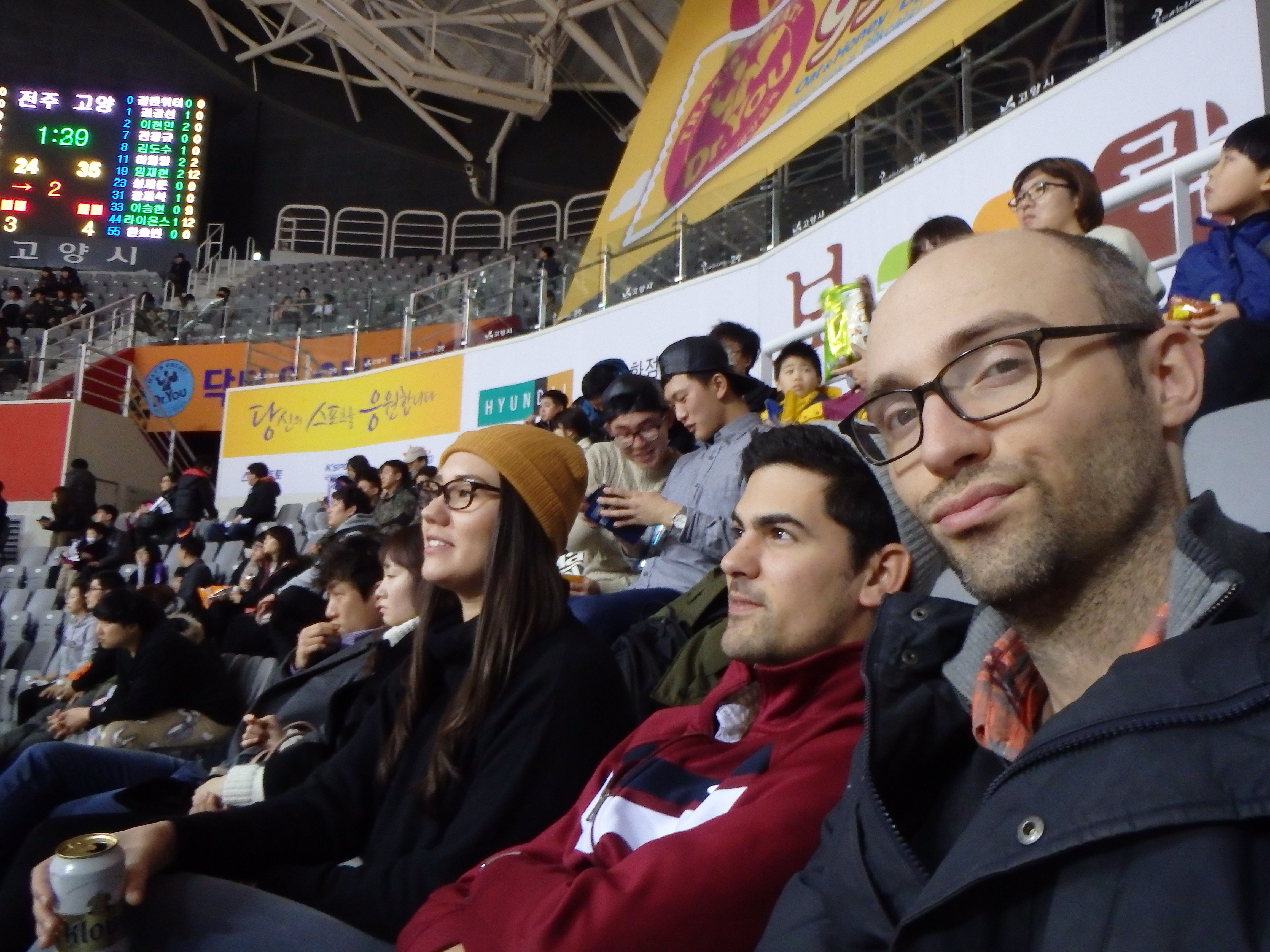 The arena felt incredibly small compared to the AT&T Center in San Antonio (GO SPURS!), but was lively and rather cozy. Unlike the hockey game we attended, there were lots of people in attendance and food! We have slowly learned that concessions aren’t treated the same way in Korea as they are in America. Here you can bring snacks and drinks with you into the arena, no problem! In fact, there was only one actual concession stand. Everyone either brings their own food or they buy it at the 7/11 just inside the front door. (This concept applies to movie theaters, too. You could bring in a meal from Mickey D’s and they wouldn’t care.) So we bought some tall boys and snacks at the 7/11 before making our way upstairs to our seats.