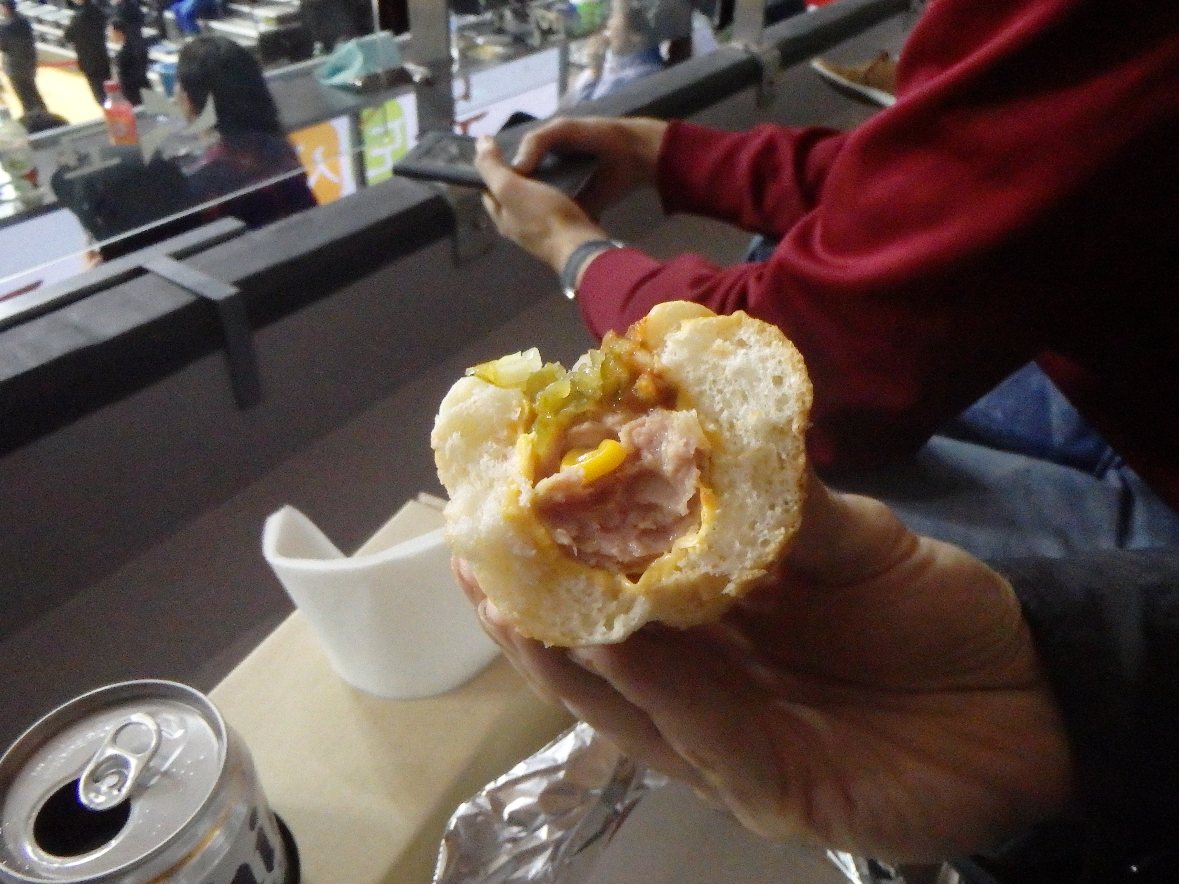 OLYMPUS DIGITAL CAMERAThe seats were pretty great for only paying 11,000 each. We were seated behind a plexiglass partition with a good view of the court. I did visit the one concession stand in the third quarter and got Zach a Texas Chili Cheese dog and myself a churro. (Korea loves churros!) We made a shocking discovery once Zach started eating the hot dog – there was corn inside the wiener! Why?!OLYMPUS DIGITAL CAMERA OLYMPUS DIGITAL CAMERA