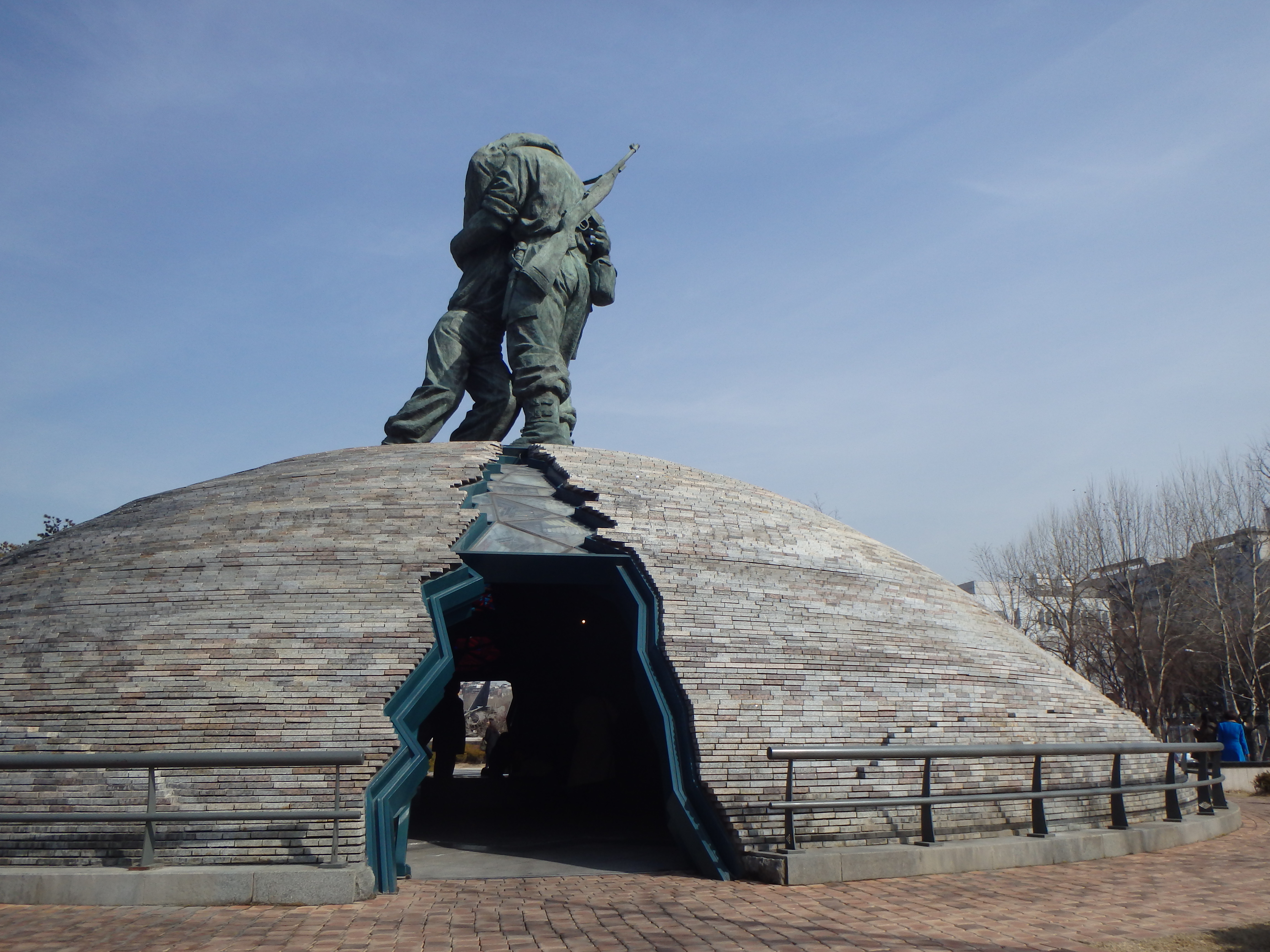 There are several outdoor statues and a military graveyard with old tanks, planes, missiles, and a battleship that has become more of a playground for children. The weather was nice and sunny so it was very enjoyable to stroll around the grounds. The first statue we came to was The Statue of Brothers. It features two brothers embracing on the battlefield, one a soldier for the North and one an officer for the South. They stand on top of a cracked dome which symbolizes the separation of the two Koreas and hope for eventual reunification.
