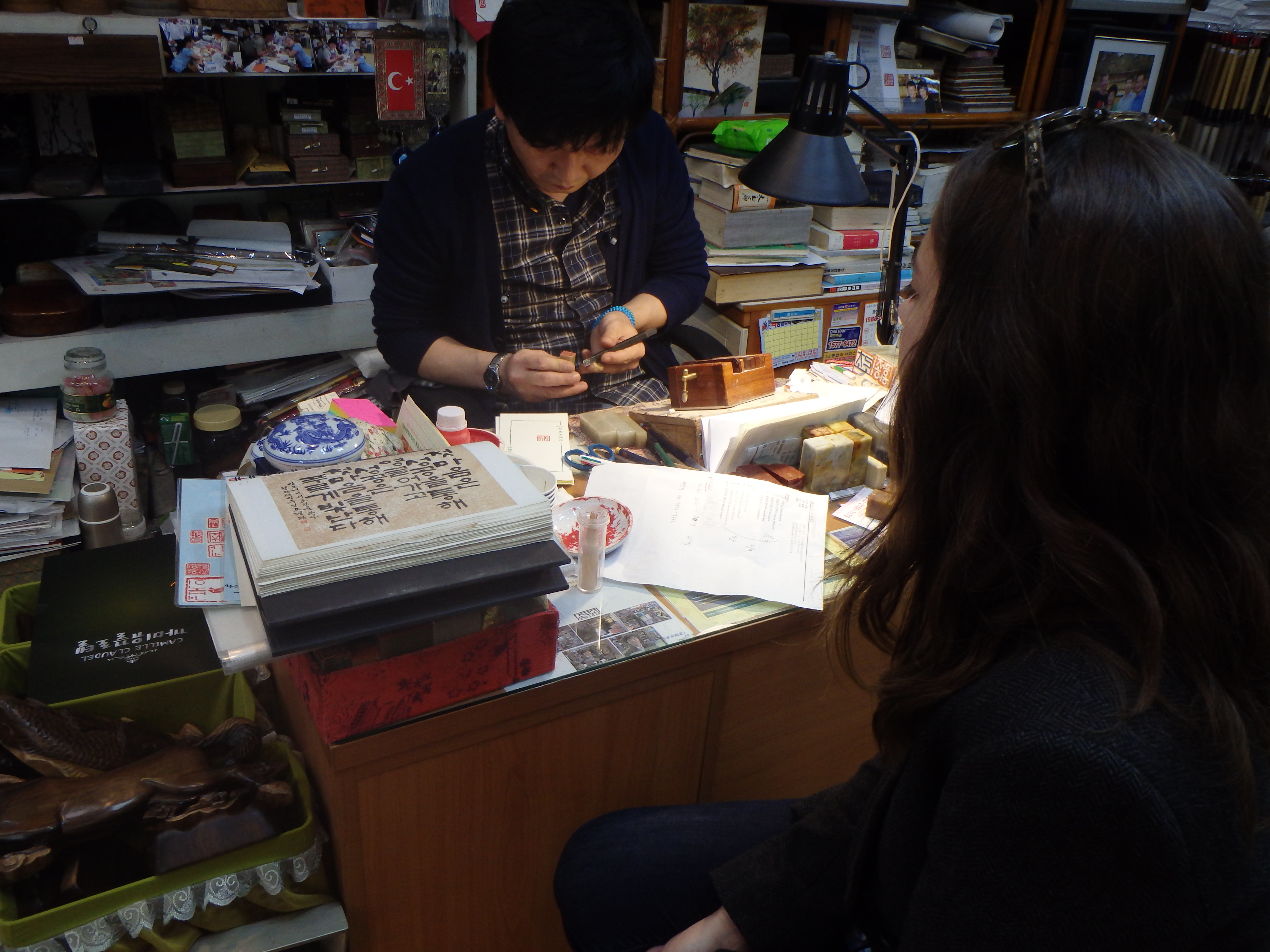 On Saturday Zach and I went to Insa-dong, a popular shopping district in Seoul, to have a dojang made. A dojang is a name stamp which is traditionally used to sign important documents. Although signatures have become more common, it is still felt that the dojang is more official. I have noticed them all over Korea, and I thought it would be a great reminder of our time here. I did a bit of research online and found a rather well-known store in Insa-dong, Myung Sin Dang Pilbang (명신당필방). Their most famous guest was Queen Elizabeth II but they have made things for an array of diplomats, celebrities, and royalty.