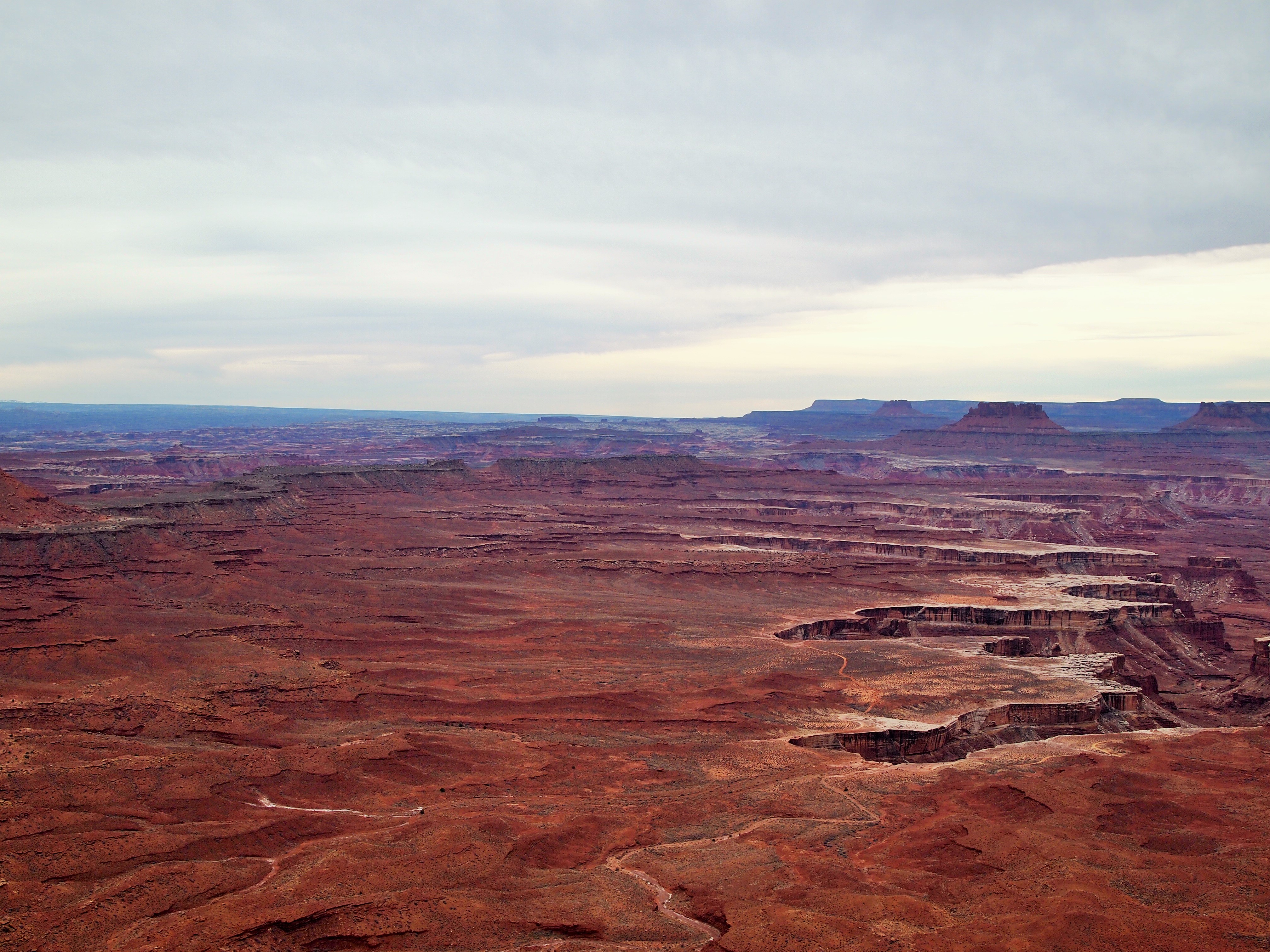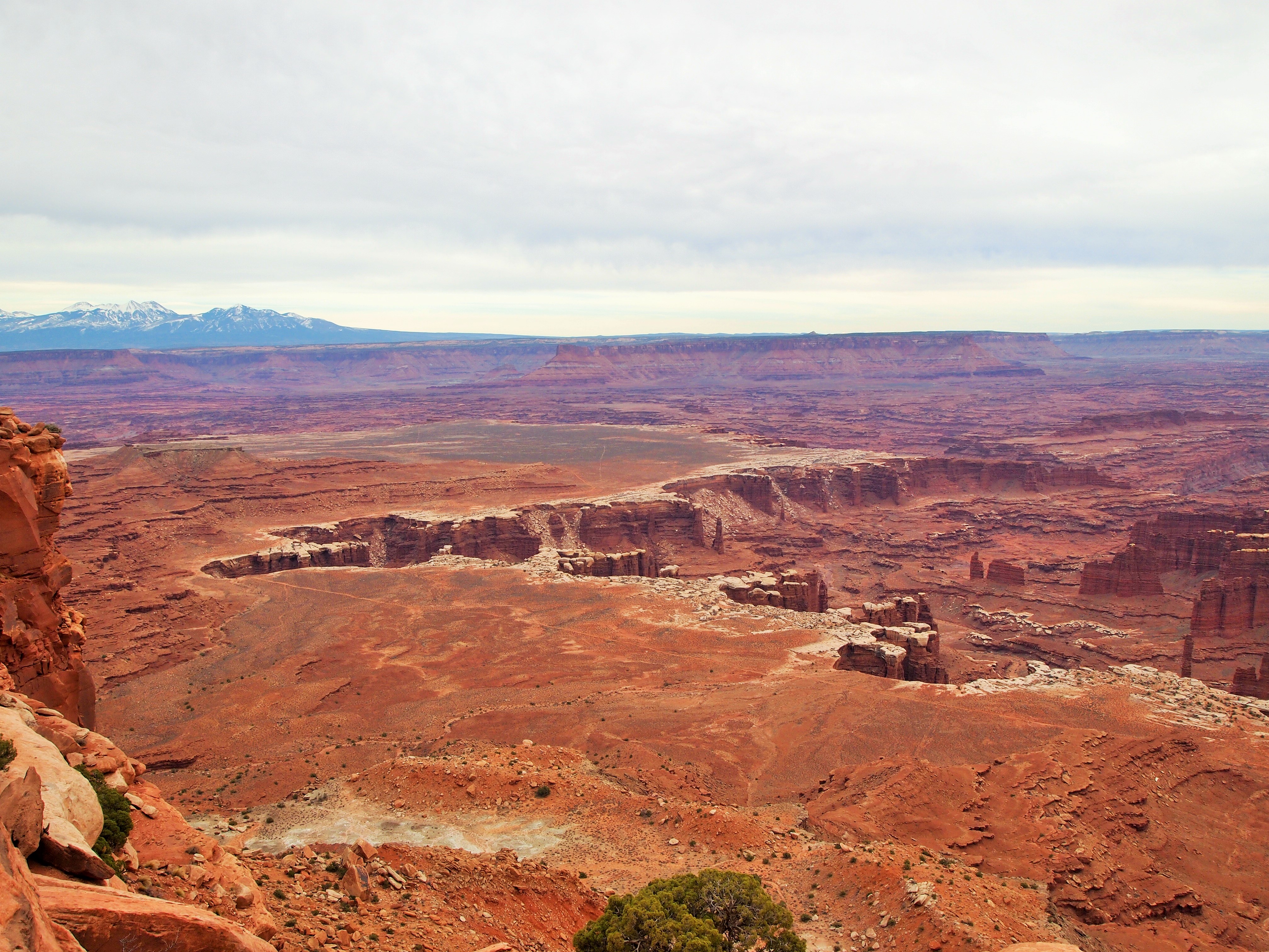 The scenic drive is only 34 miles round trip but there are several overlooks and pullouts along the way. We skipped one overlook which was an additional 10 miles round trip since we were low on gas. (Until next time, Upheaval Dome.) Our first stop was the Green River Overlook. Wow. Wow. Wow. Of all the overlooks that day, nothing compares to my complete astonishment at that first sight. The most striking feature is the Soda Springs Basin. From the overlook, the Basin is a gigantic crevice in the landscape, opening up and swallowing the red earth. Inside its clutches, the Green River winds into Stillwater Canyon on its way to the Colorado.
