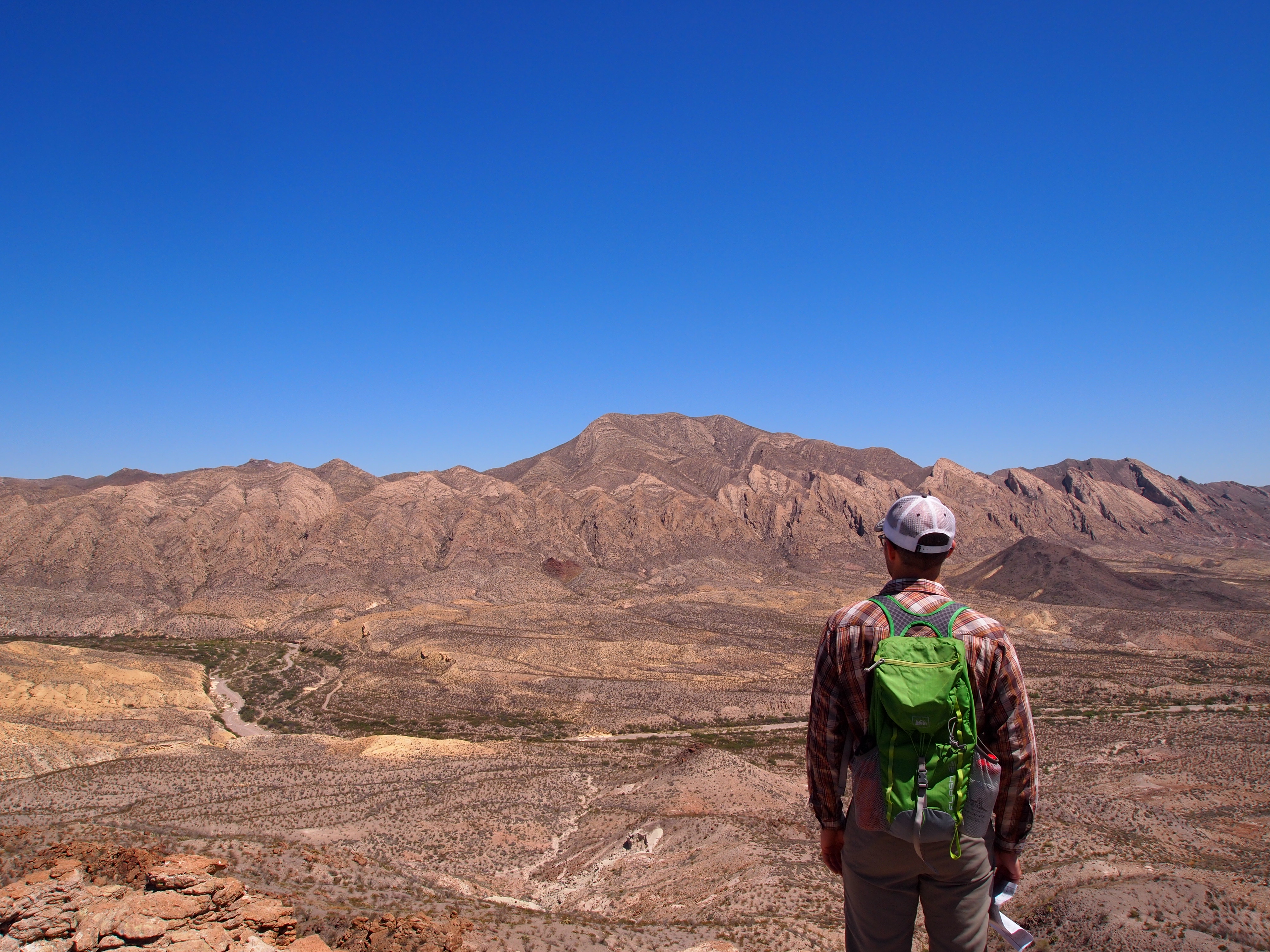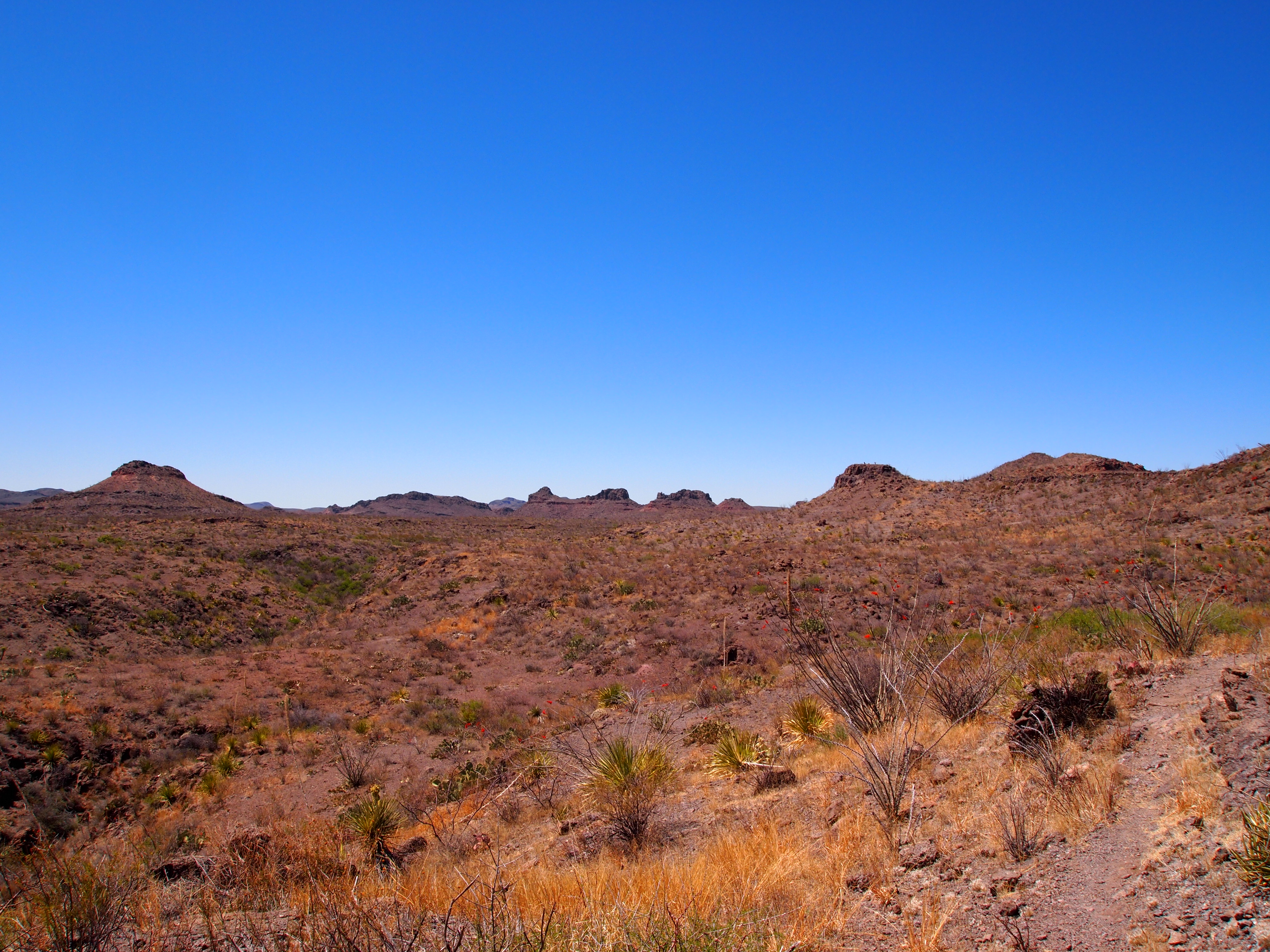 As expected, the view from the actual overlook was far superior to the one I had hoped was the overlook. We had a clear view of Fresno Canyon below and El Solitario ahead. El Solitario appears to be a small mountain range but is actually a dome uplift created by magma pushing upward and displacing the overlying rock. Over time the dome’s rocks eroded and collapsed leaving behind a caldera. El Solitario is the park’s most well-known and unique feature. It’s “flatirons” are impressive from a distance and even more magnificent from the overlook. We had our snack at the overlook and then turned around for the return hike. Boy, was I ever happy to see our car in the distance as we neared the trailhead.