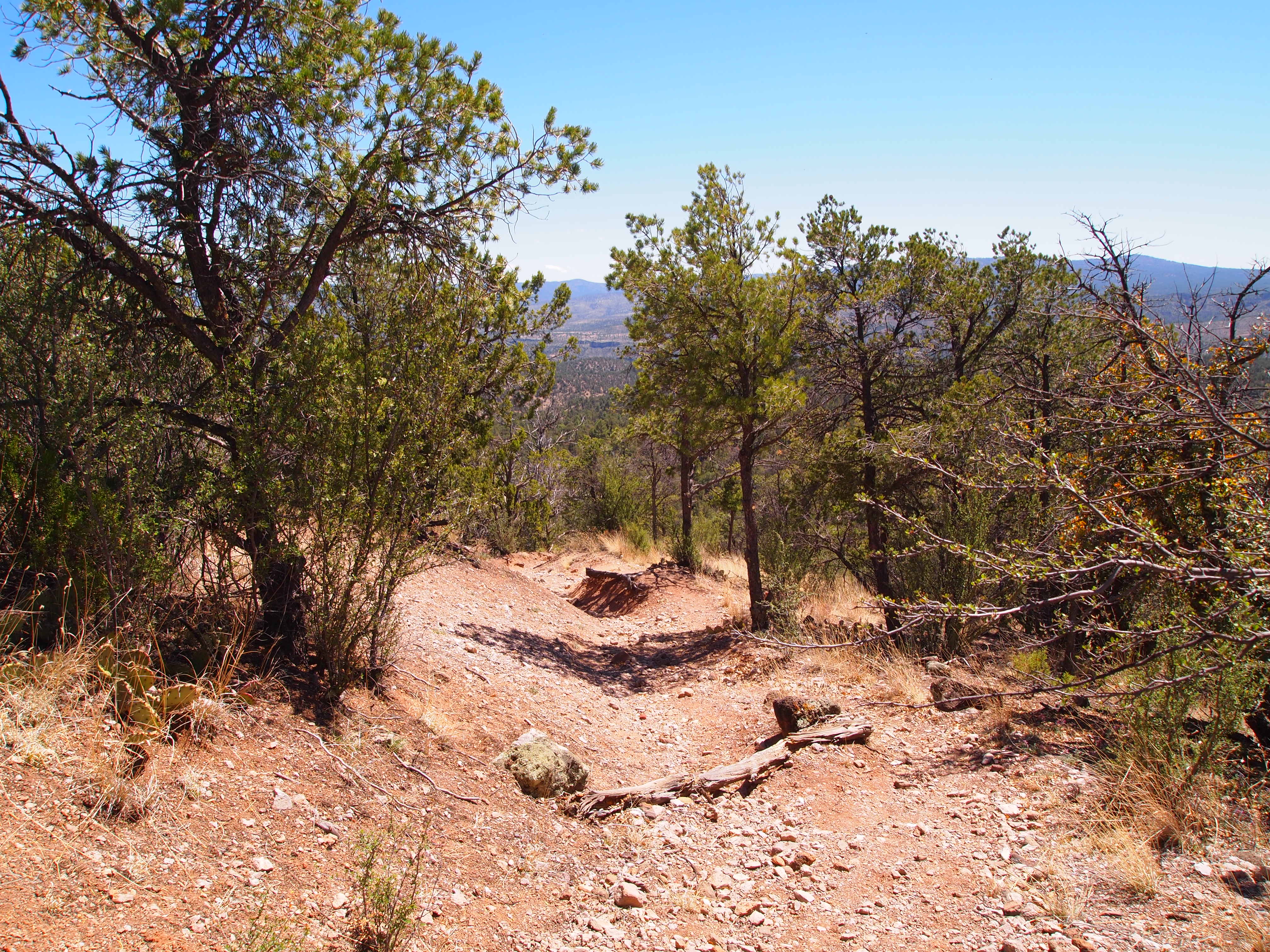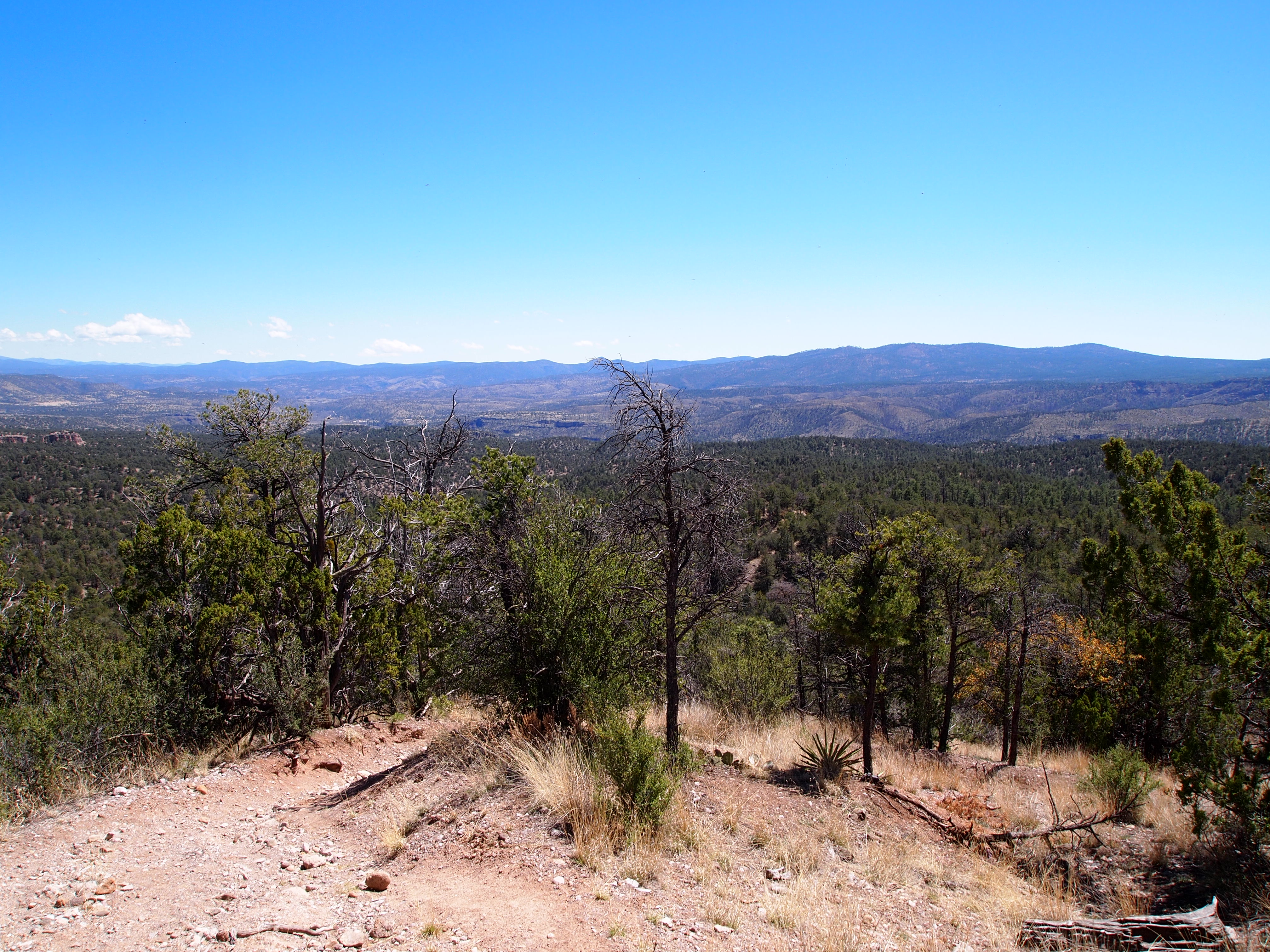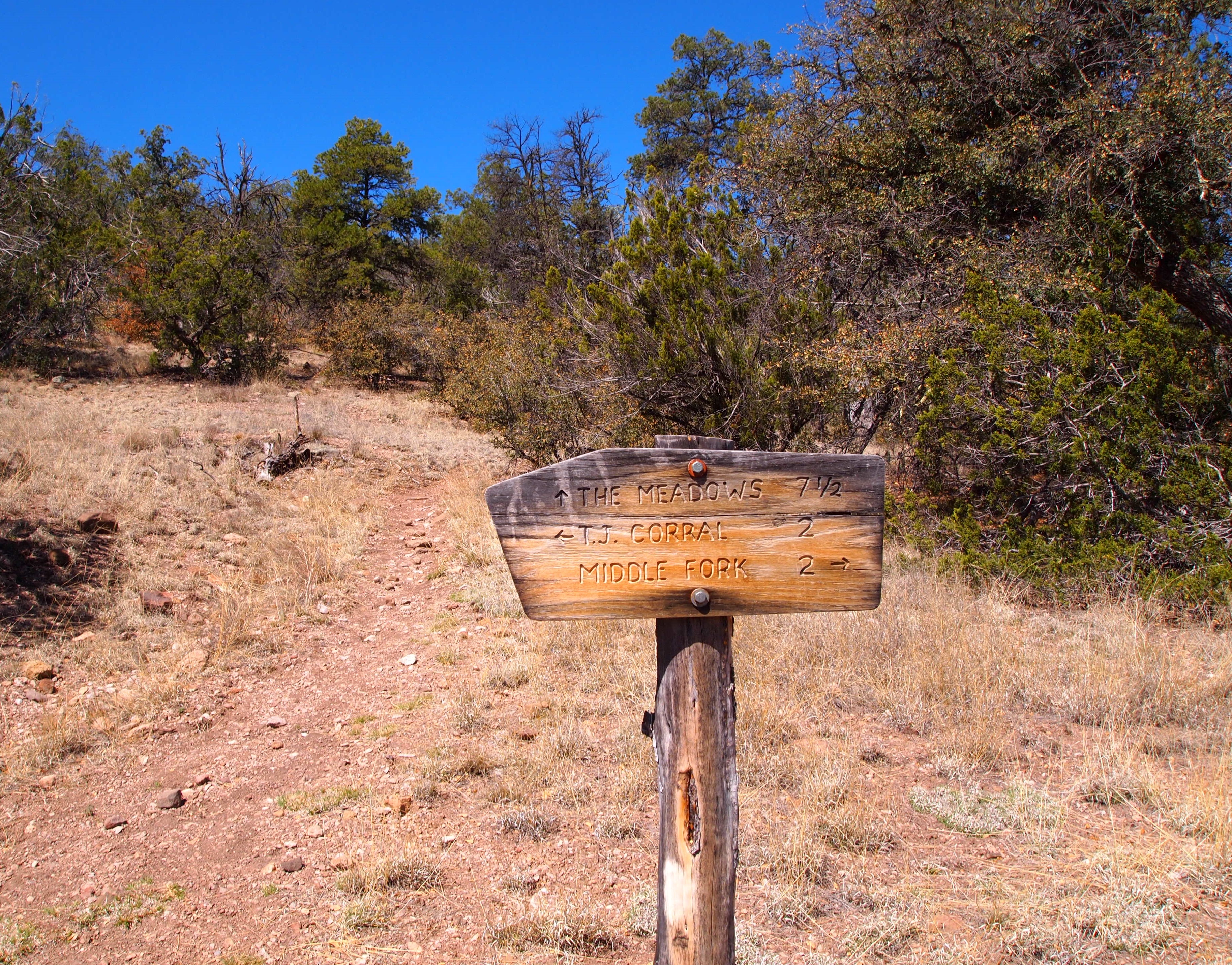 We turned at our first junction toward The Meadows, though our section was only 4 miles. This leg had the most scenic views of the valleys and mesas on either side of us and brought us into dense sections of Ponderosa pine. We also ascended to our highest elevation of the hike – 7000 ft. (a 1300 ft. gain) – before our descent into the West Fork valley.